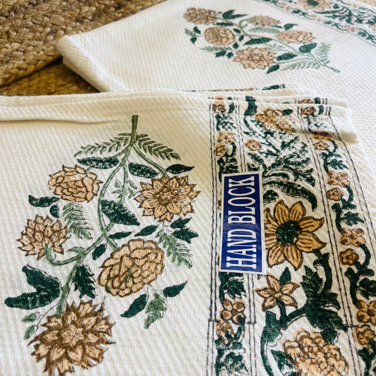 Yellow Floral Handblock Waffle Cotton Towel Set