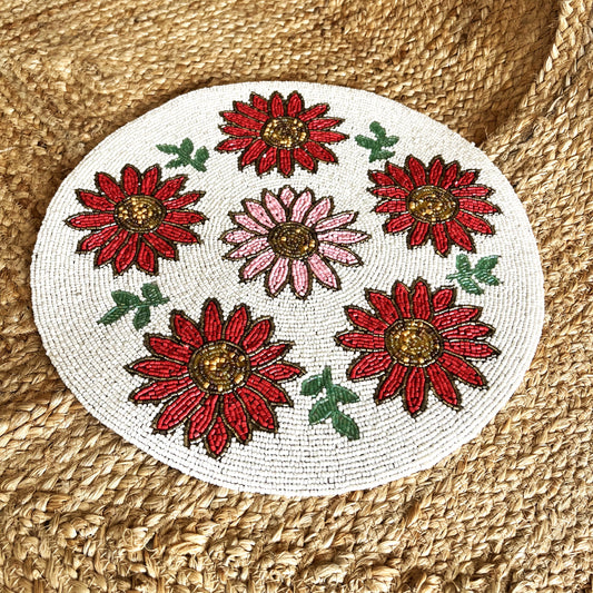 Red Flower Handcrafted Beaded Placemat – 14-inch Round Decorative Table Mat