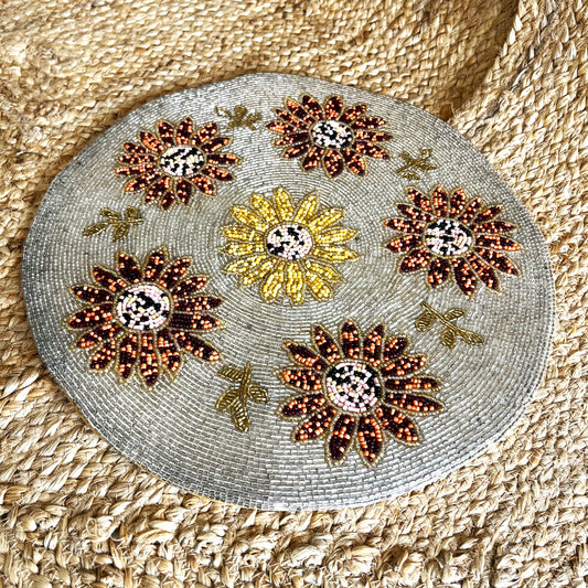 Sunflower Handcrafted Beaded Placemat – 14-inch Round Autumn Floral Table Decor Mat