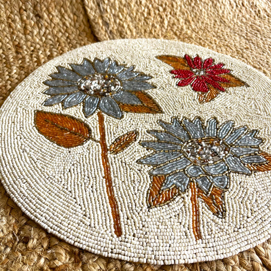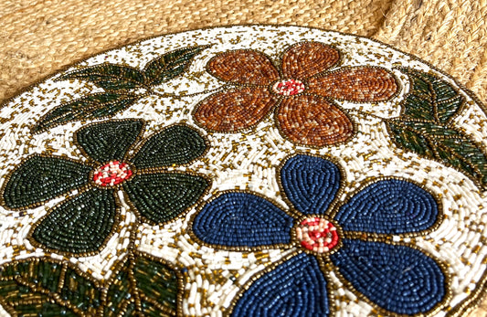 Elegant Multicolor Floral Handcrafted Beaded Placemat – 14-inch Round Decorative Table Mat