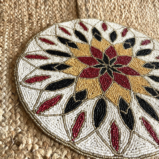Red Black Gold Floral Rangoli Handcrafted Beaded Placemat – 14-inch Round Decorative Table Mat