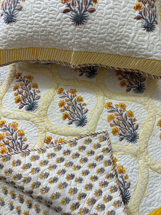 Yellow Flower Handblock Quilted Reversible Bedcover with 2 Pillow Covers – Premium Cotton, Elegant Home Décor
