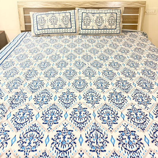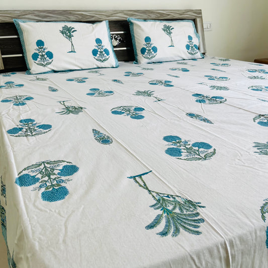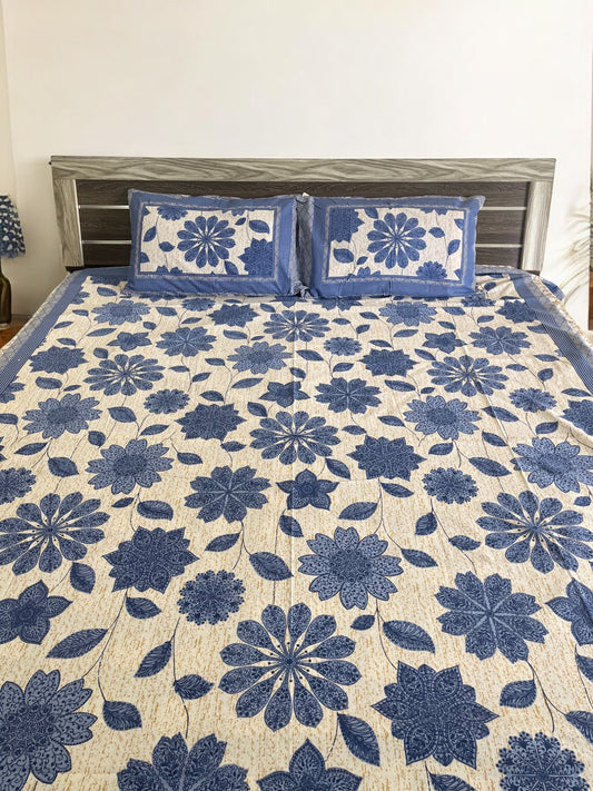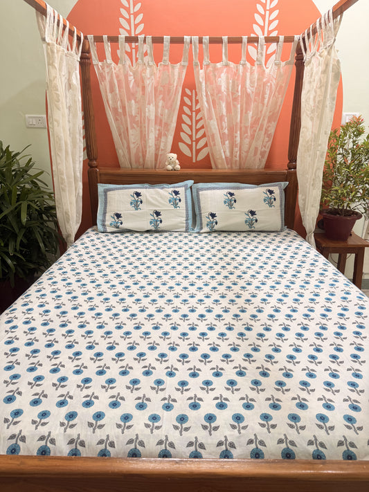 Blue & White Floral Motifs Handblock Cotton Bedsheet