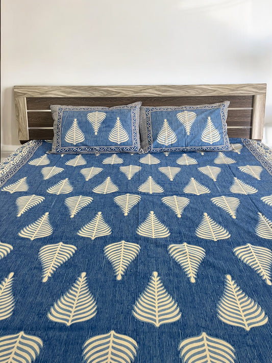 Blue Palm Leaf Double Bedsheet with 2 Pillow Cover
