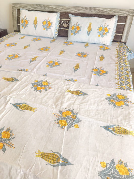 Yellow Flower Handblock Quilted Reversible Bedcover with 2 Pillow Covers – Premium Cotton, Elegant Home Décor