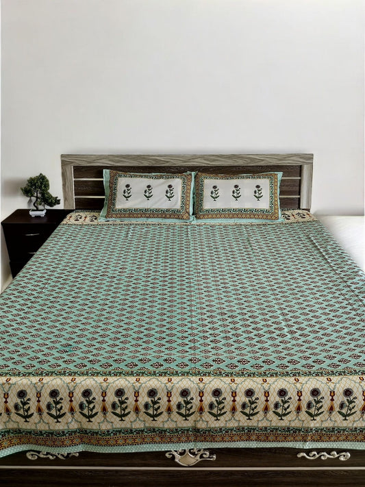 Green Floral Double Bedsheet with 2 Pillow Cover