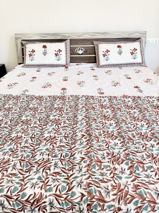 White Handblock Cotton Double Bedsheet Set with 2 Dohars & Pillow Covers