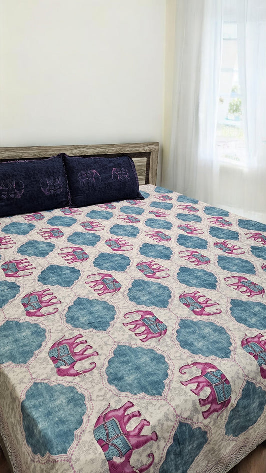 Pink Elephant Embroidery Double Bedsheet with 2 Pillow Cover