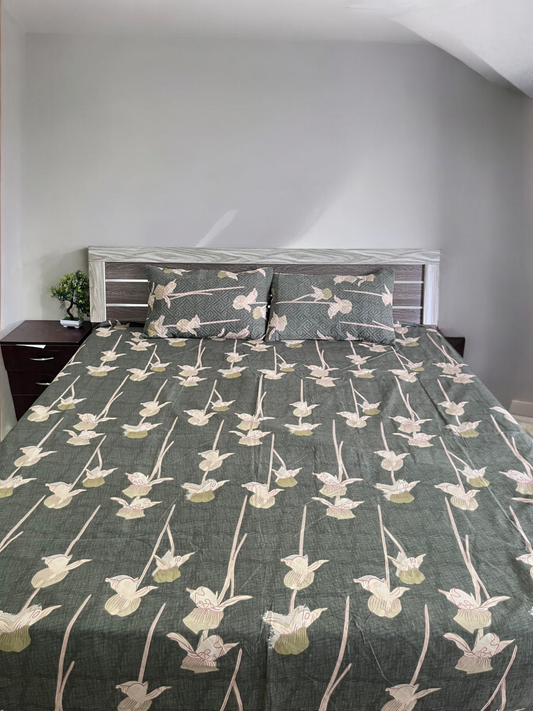Green Floral Double Bedsheet with 2 Quilted Pillows Covers