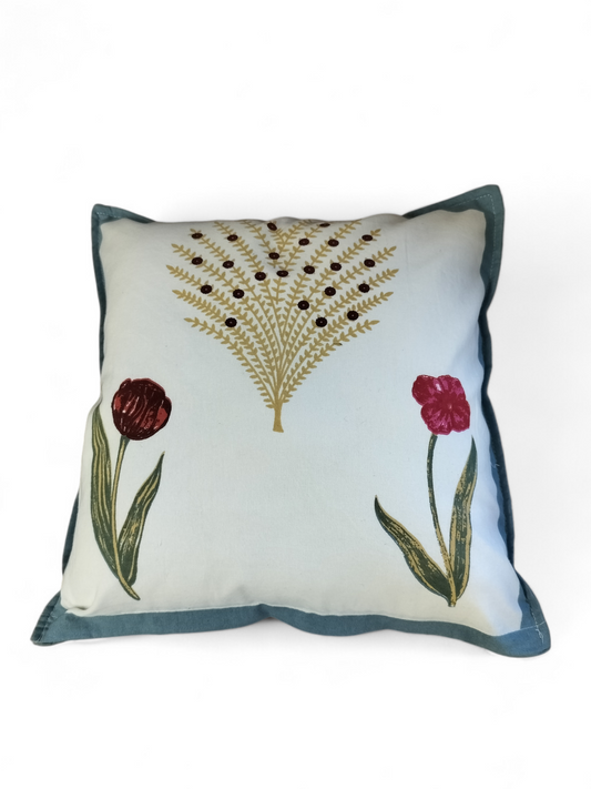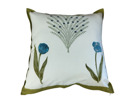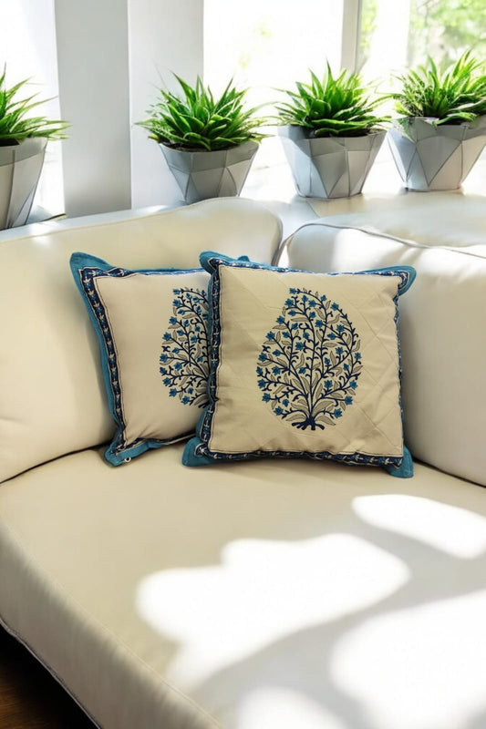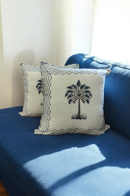 Handblock Cotton Cushion Covers (Blue Palm tree, Set of 2)