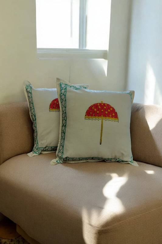 Umbrella White And Red Handblock Cushion Cover SET OF 2