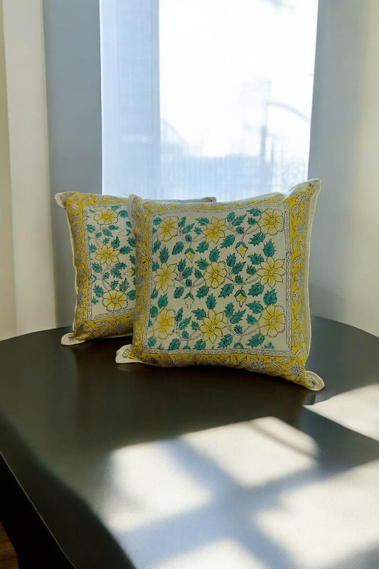 White and Green Floral Print Quilted Handblock Cushion Covers