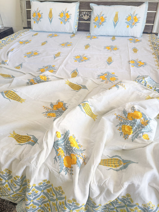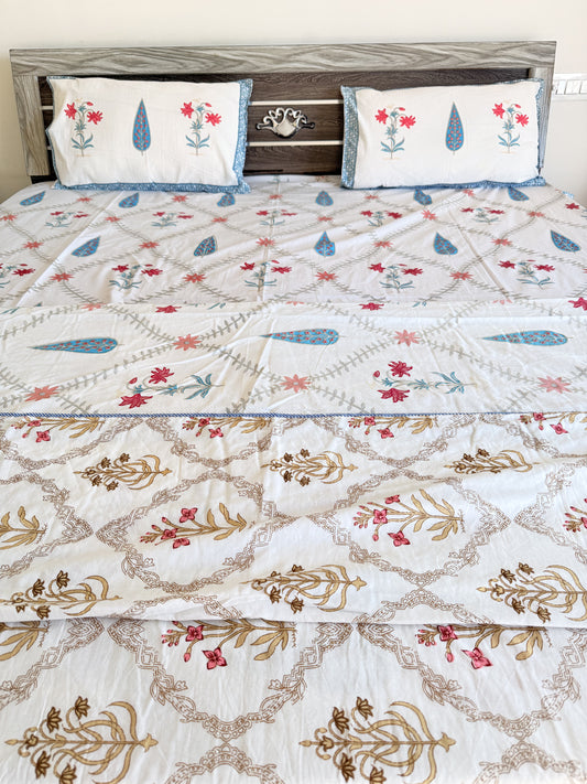 White Handblock Cotton Double Bedsheet Set with 2 Dohars & Pillow Covers