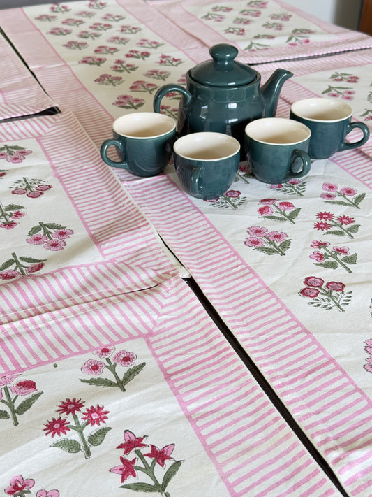 Pink Floral Green Leaf Pure Cotton Rajasthani Handblock Table Runner and Mats set of 6