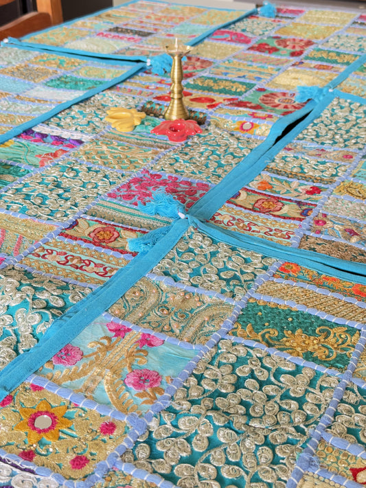 Light Blue Kambadiya Patchwork Rajasthani Table Runner Set with 6 Placemats