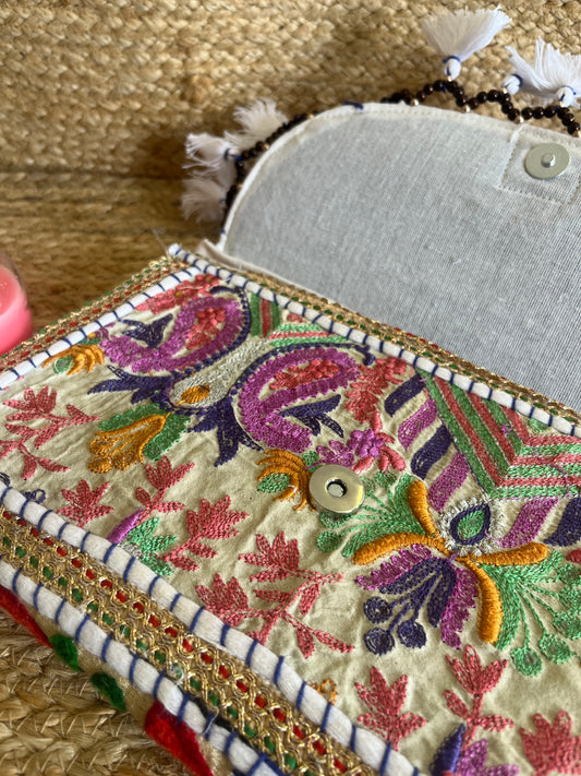 White Multicolor Floral Kashmiri Embroidery Sling Bag