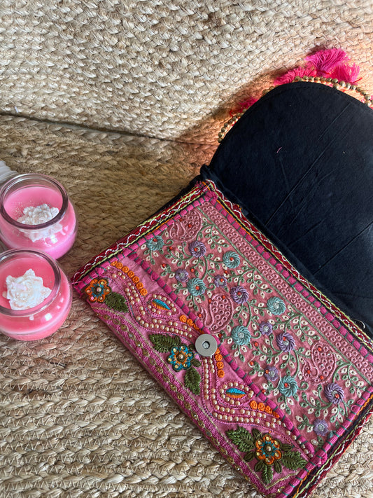 Pink Multi-Color Hand Embroidered Patchwork Sling Bag