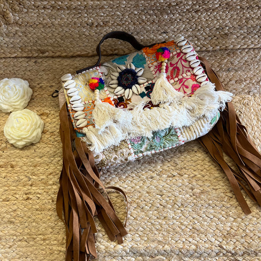 White Tasseled Boho Sling Bag with Detachable Sling