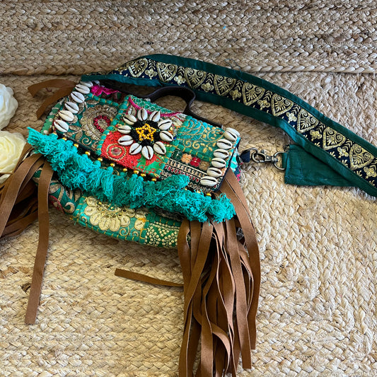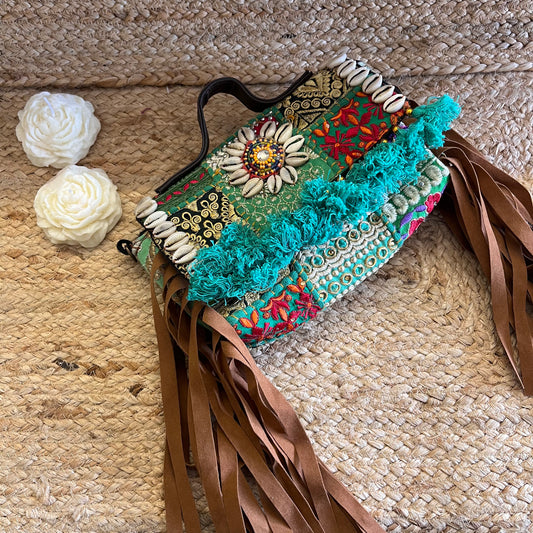 Sea Green Tasseled Boho Sling Bag with Detachable Sling