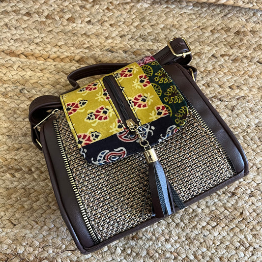 Yellow Jacquard Handblock Printed Vegan Leather Sling Bag