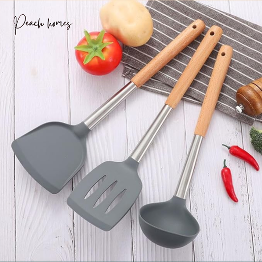 Silicone Spatula Set of 3 – Heat Resistant, Non-Stick, Ergonomic Wooden Handle, 8 Inches, Grey
