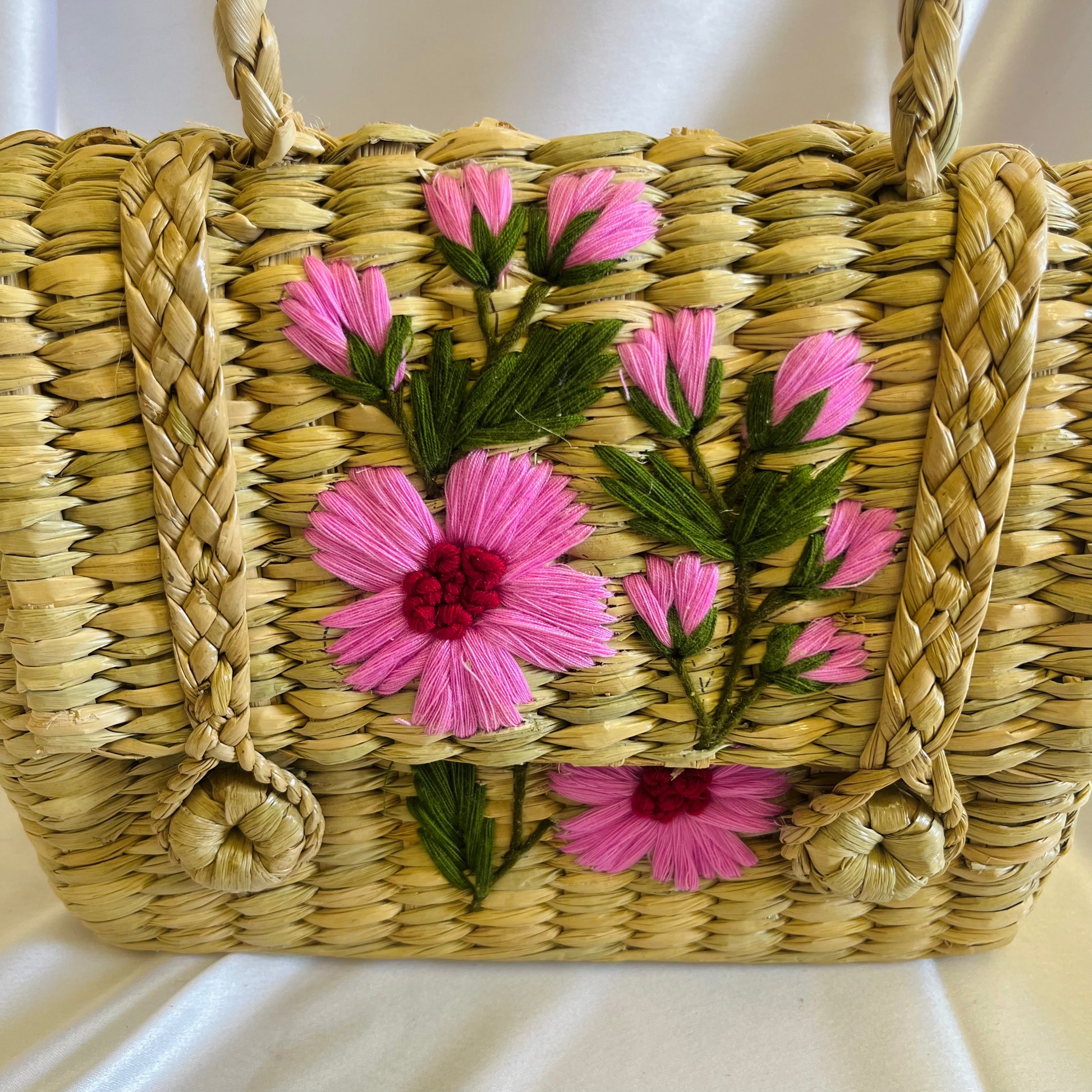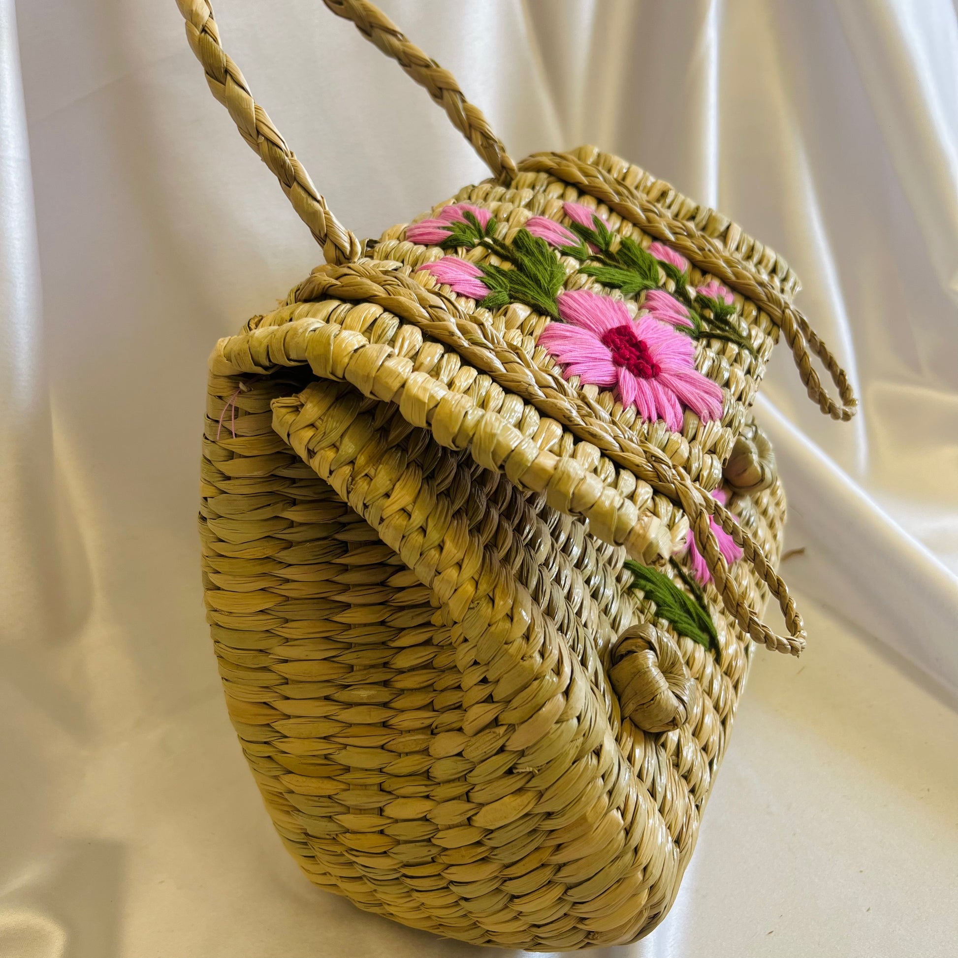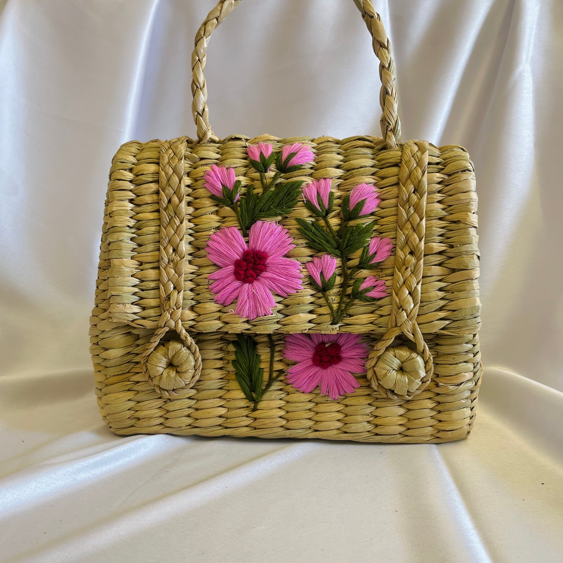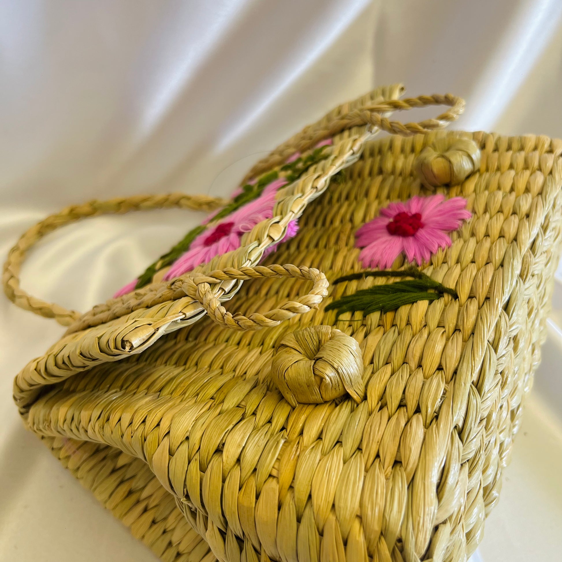 Pastel Pink Leaves Handcrafted Kauna Grass Embroidery Handbag