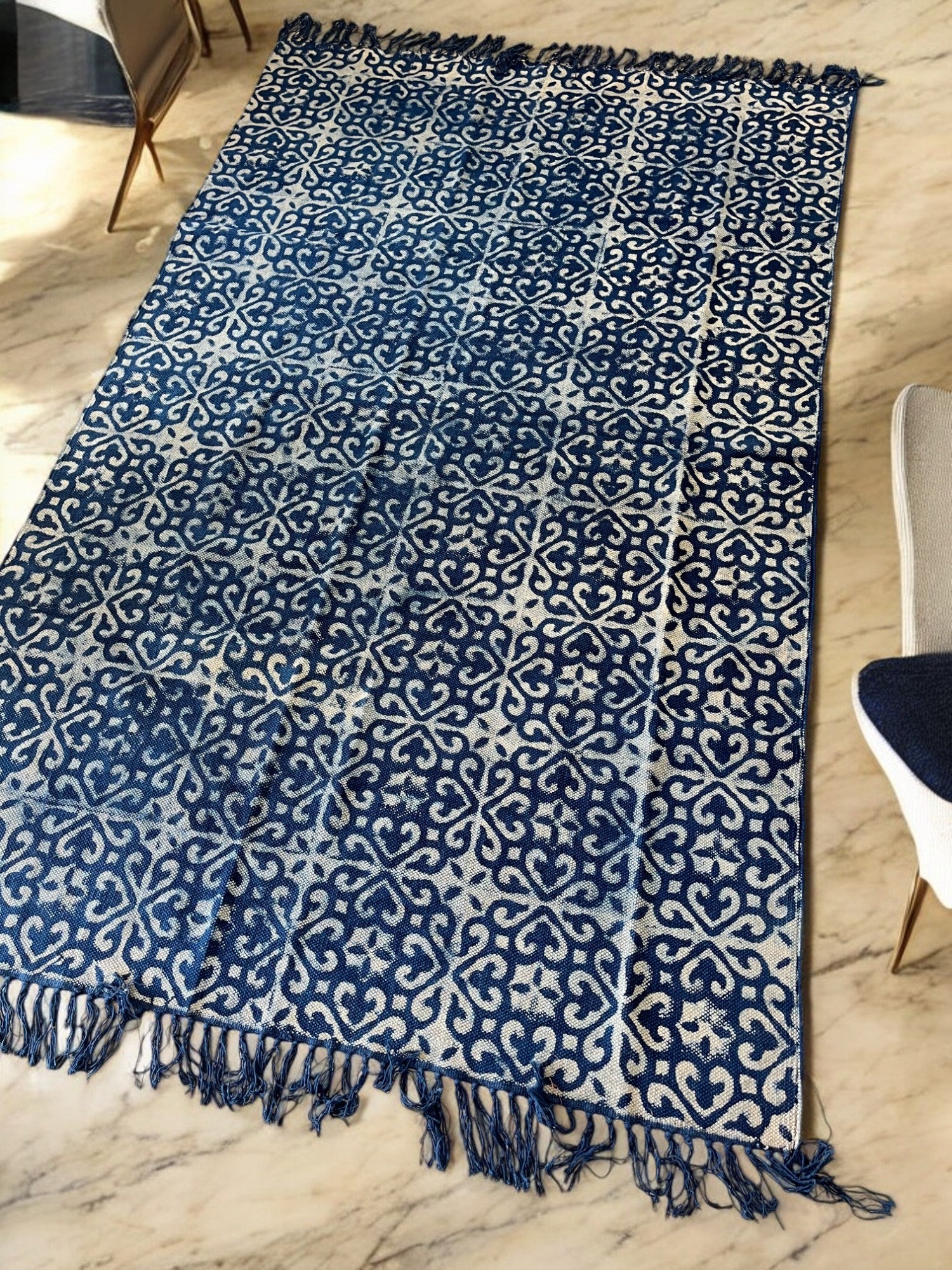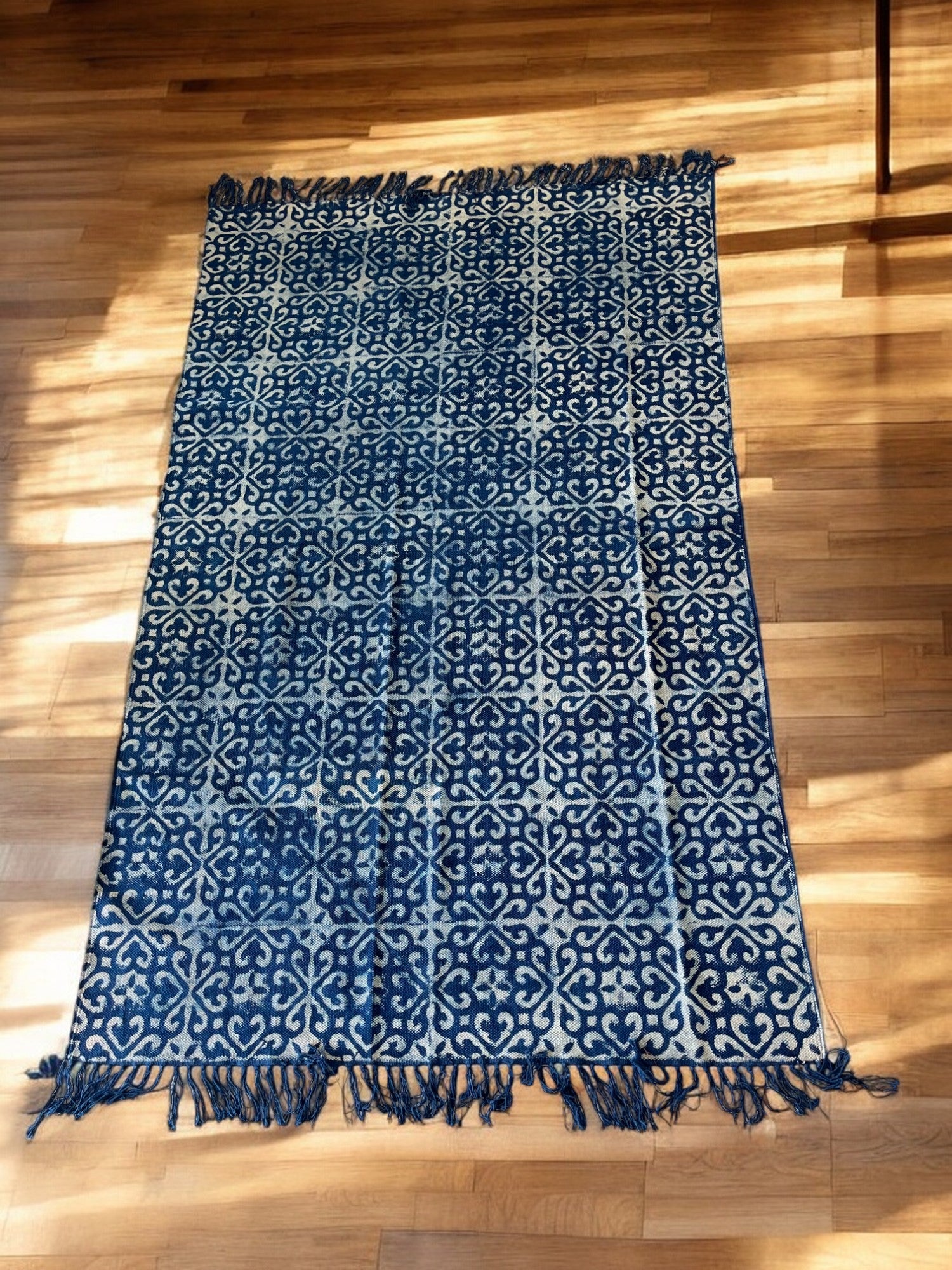 Elevate your home decor with the sophisticated Abstract Pattern Handblock Print Blue Cotton Rug, sized 4x6 ft. Crafted from 100% premium cotton, this handcrafted rug features a stunning abstract pattern in blue tones that blends traditional handblock printing techniques with contemporary design. Its unique pattern creates a modern yet elegant look, making it perfect for living rooms, bedrooms, and hallways. Made with eco-friendly dyes, this rug is safe, sustainable, and built to last. Soft and durable, it is dry clean only to maintain its vibrant color and intricate design. Transform your space with this timeless piece shop now!