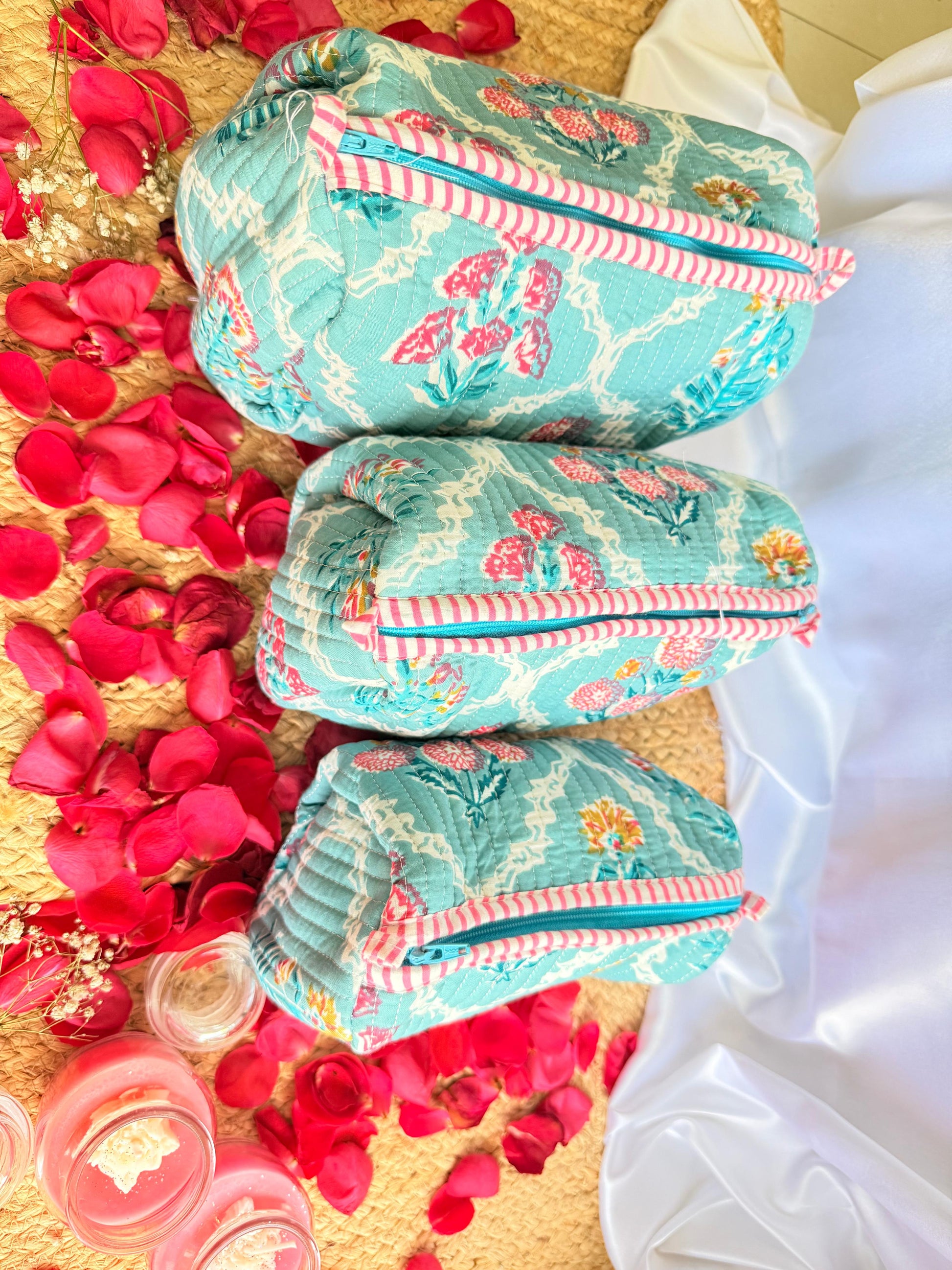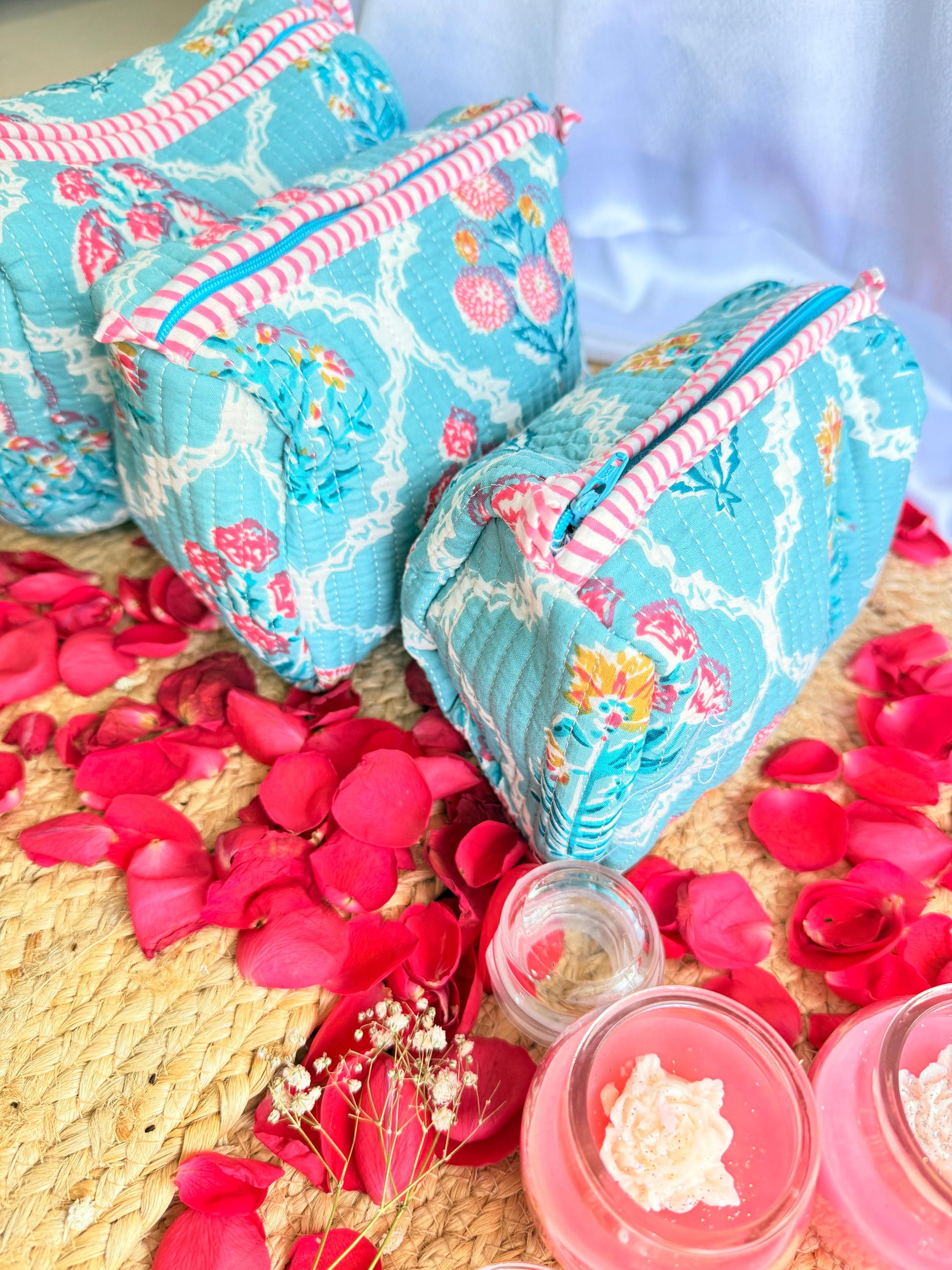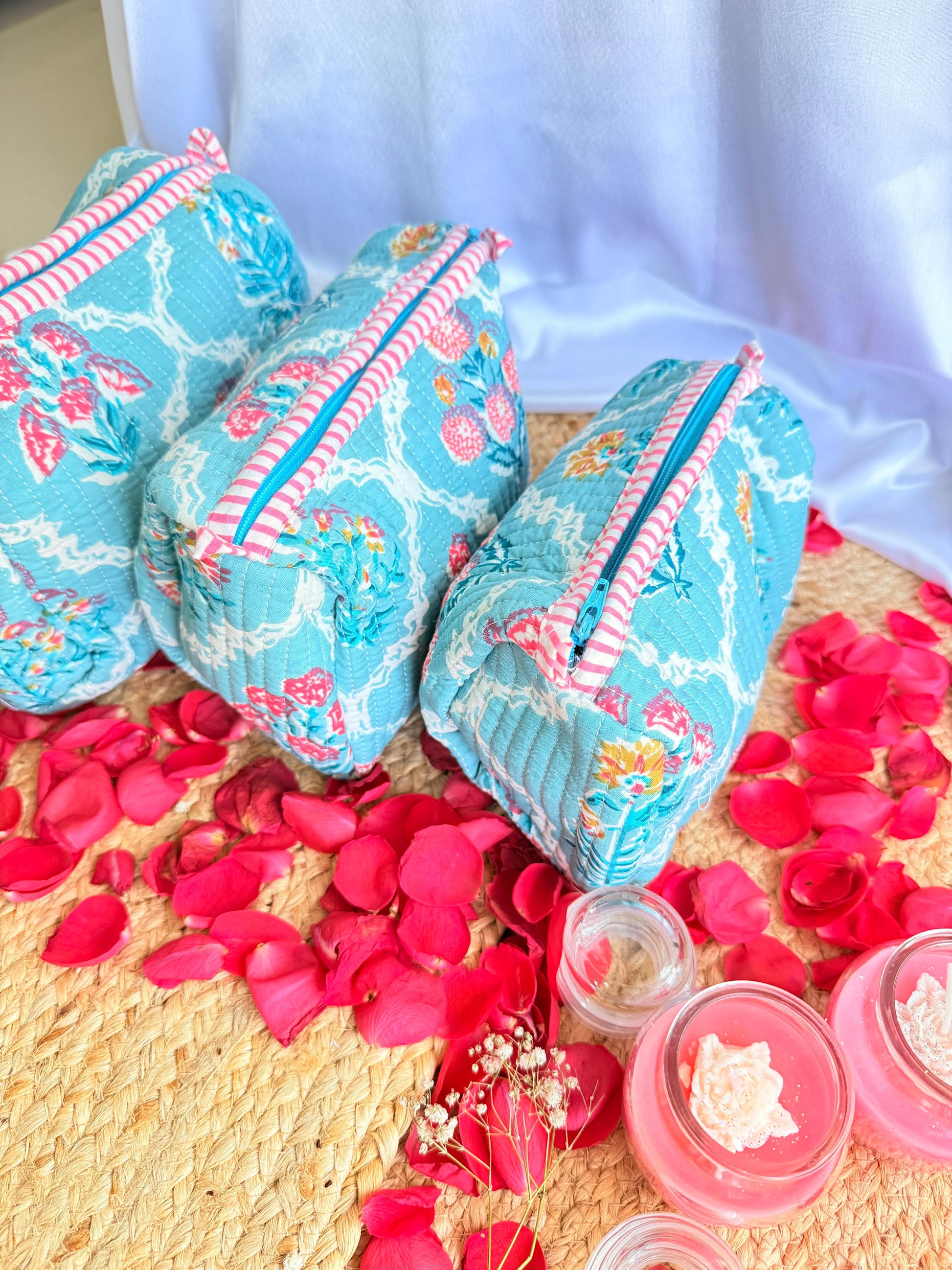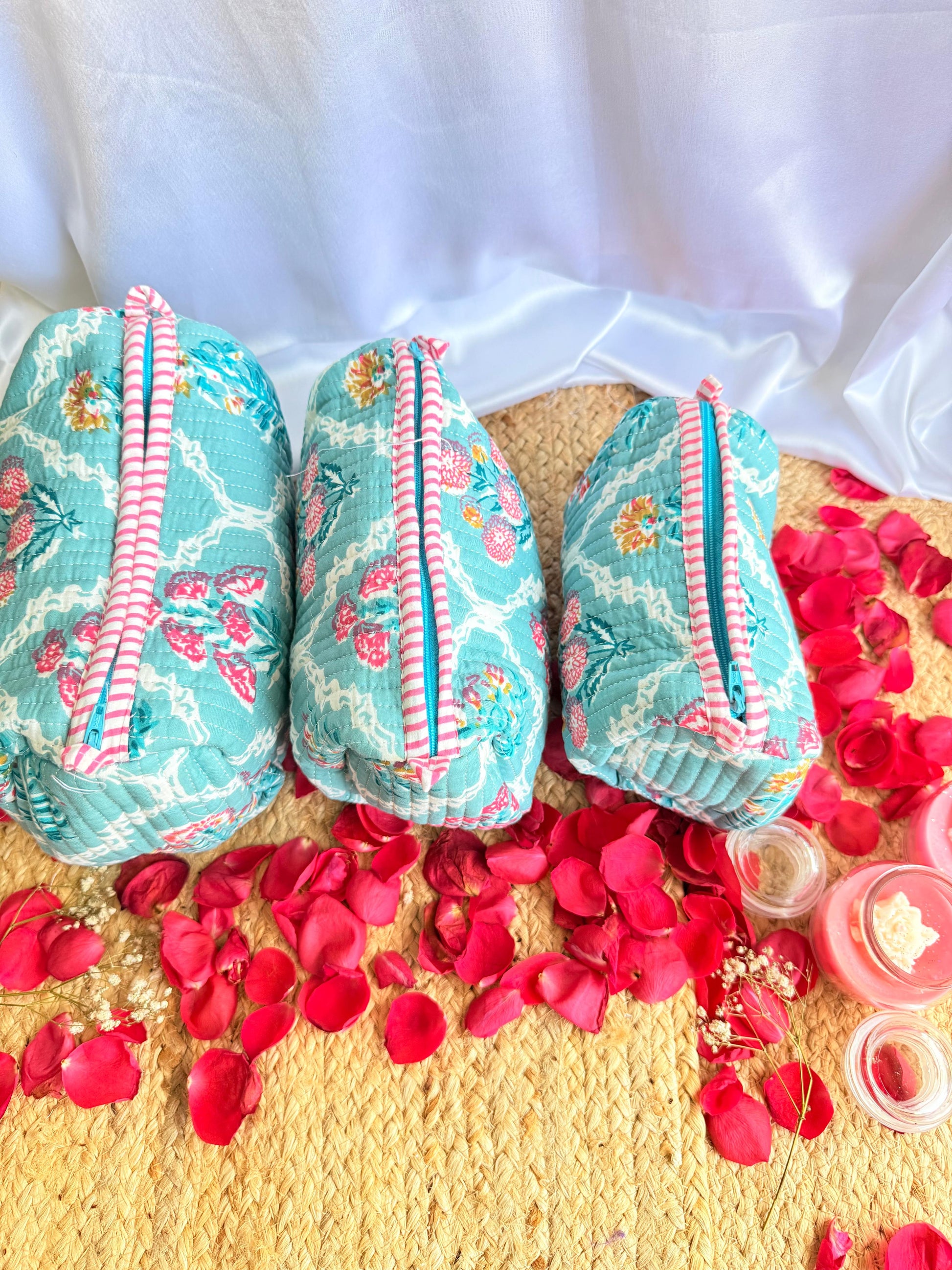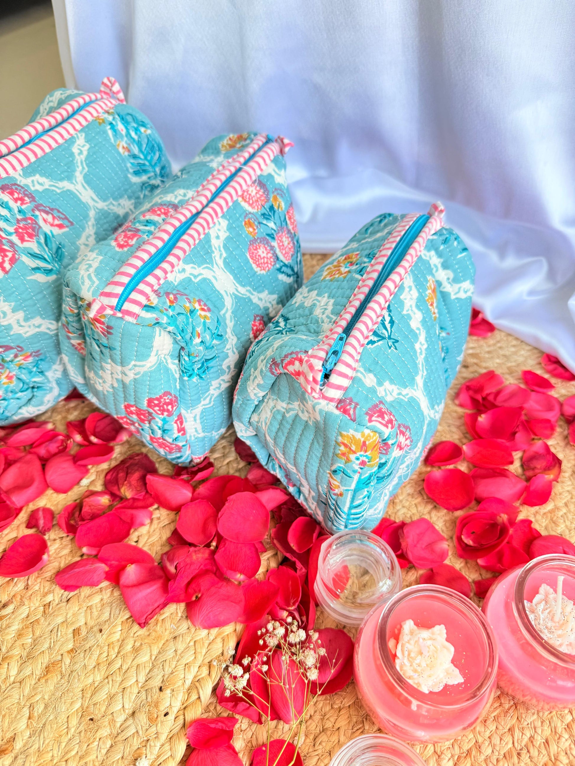 Ocean Blue White Floral Handblock Travel Pouch Organizer Set of 3