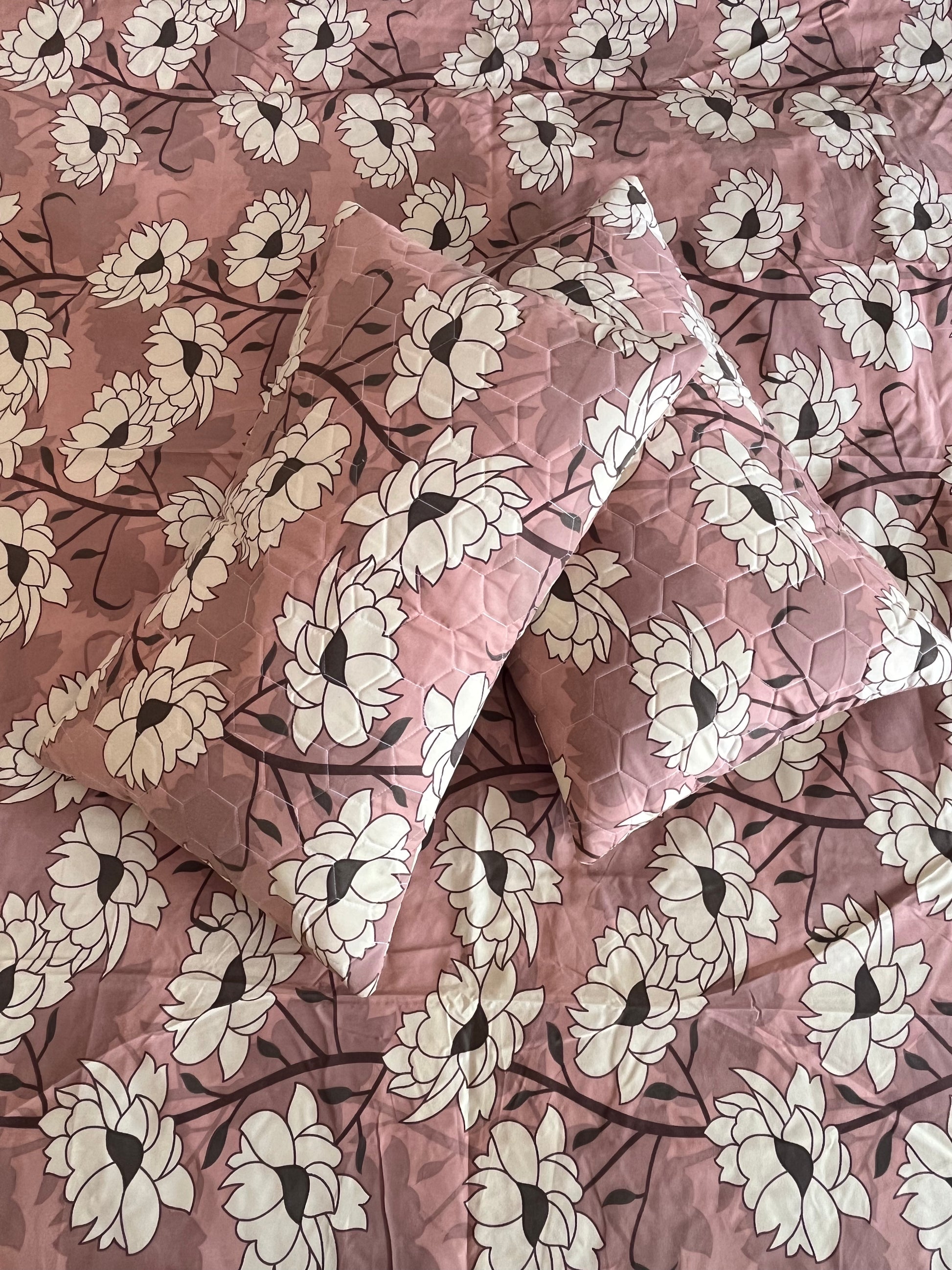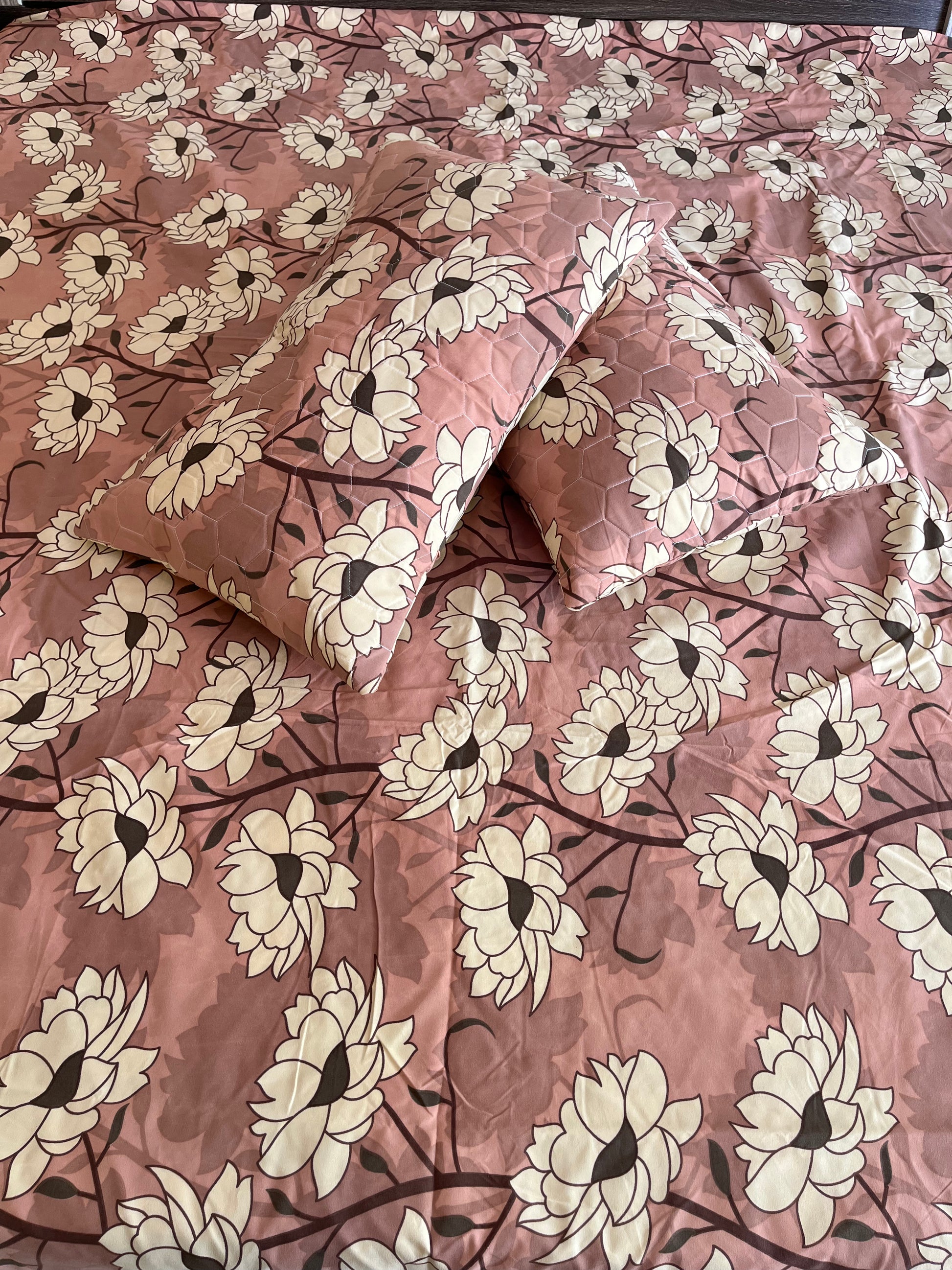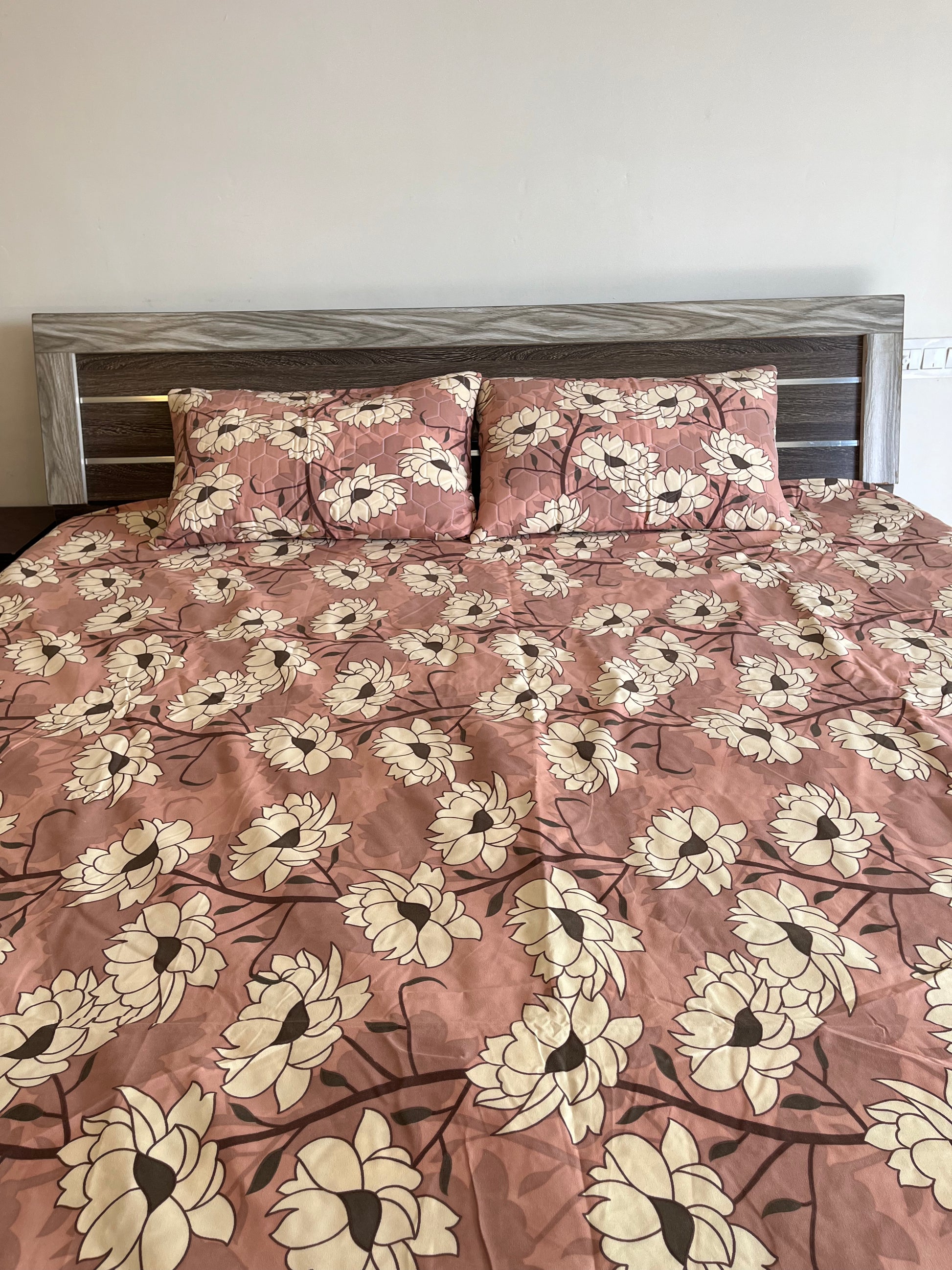 Beige Flower Double Bedsheet with 2 Quilted Pillows Covers