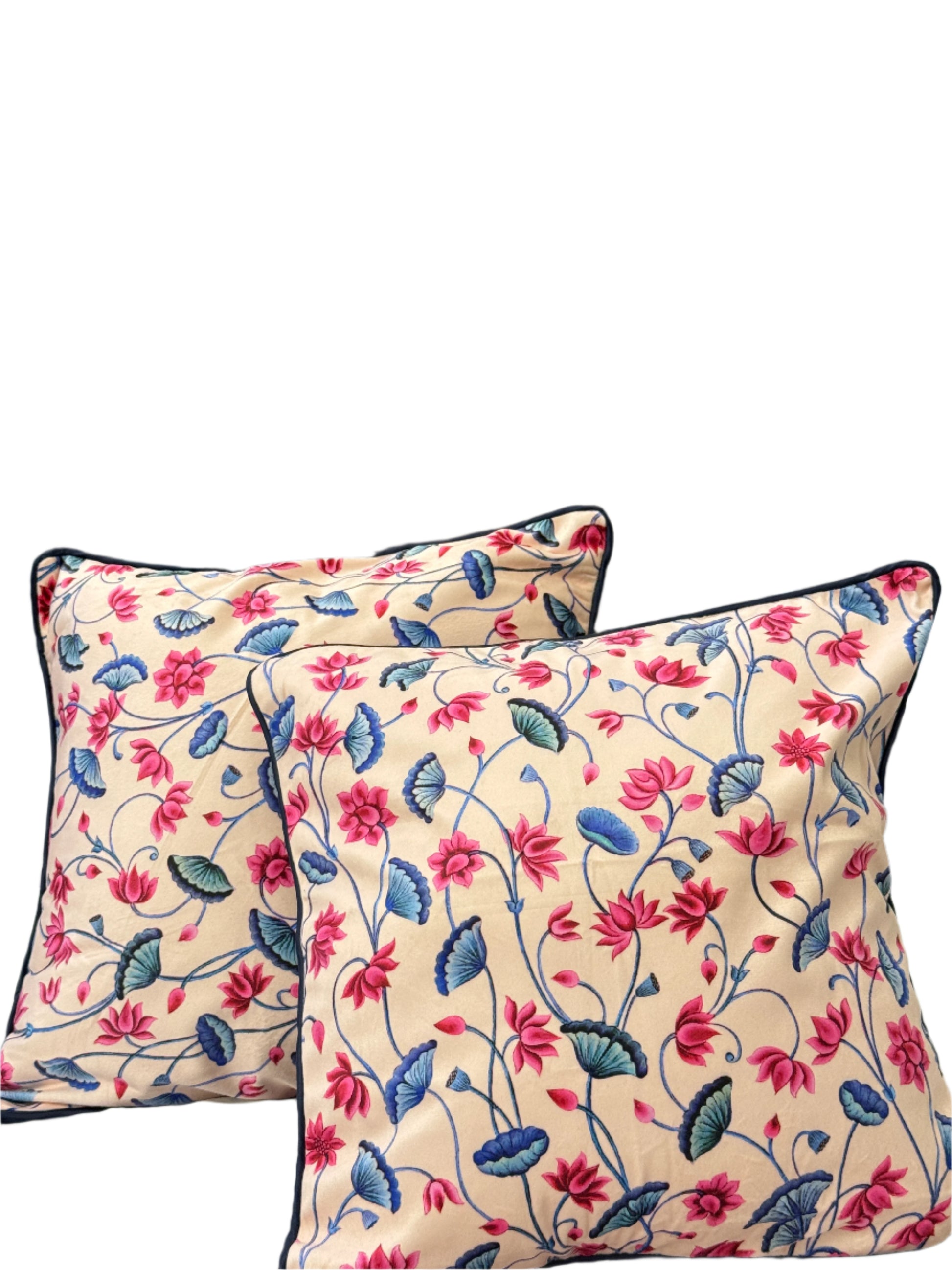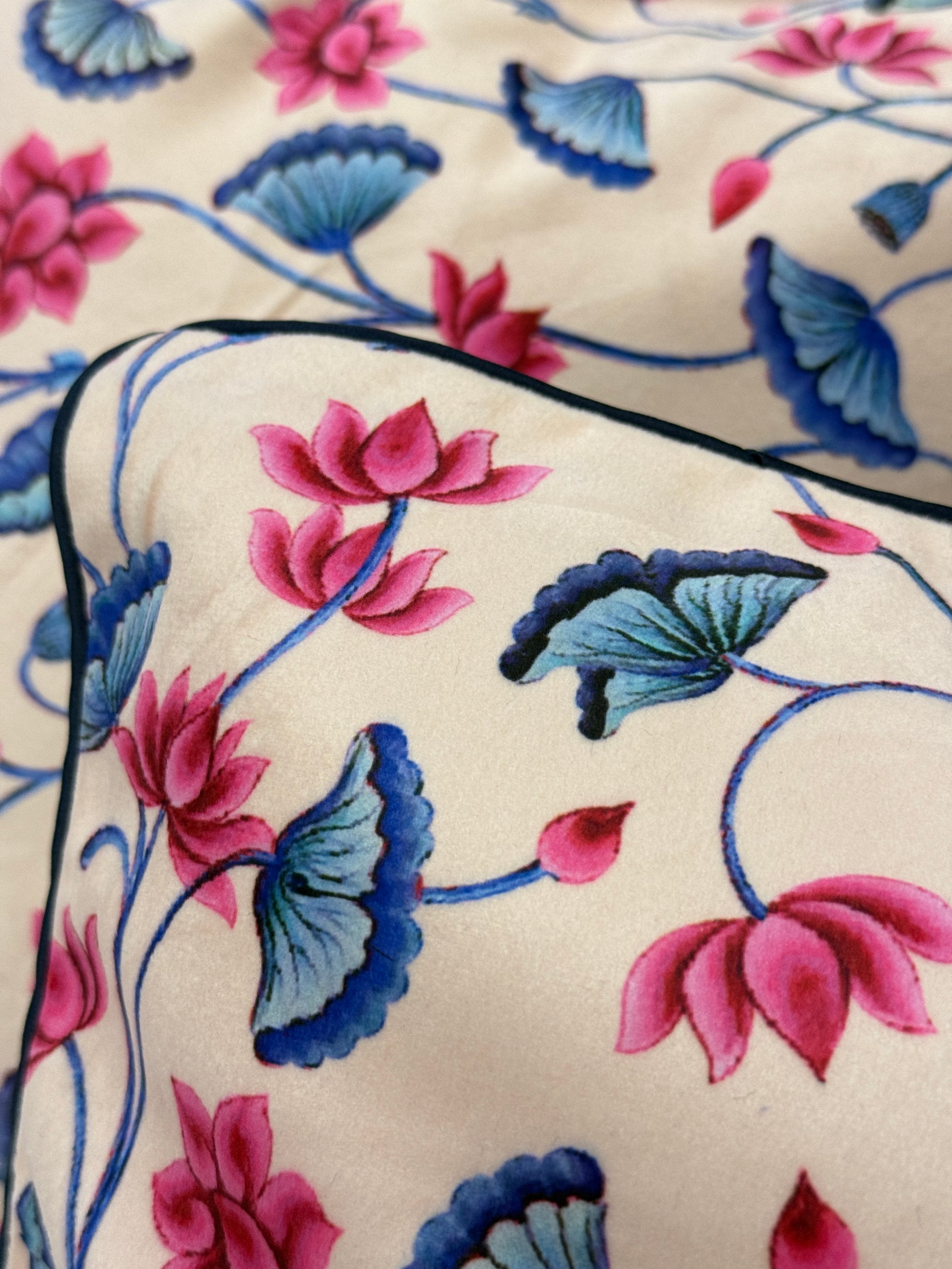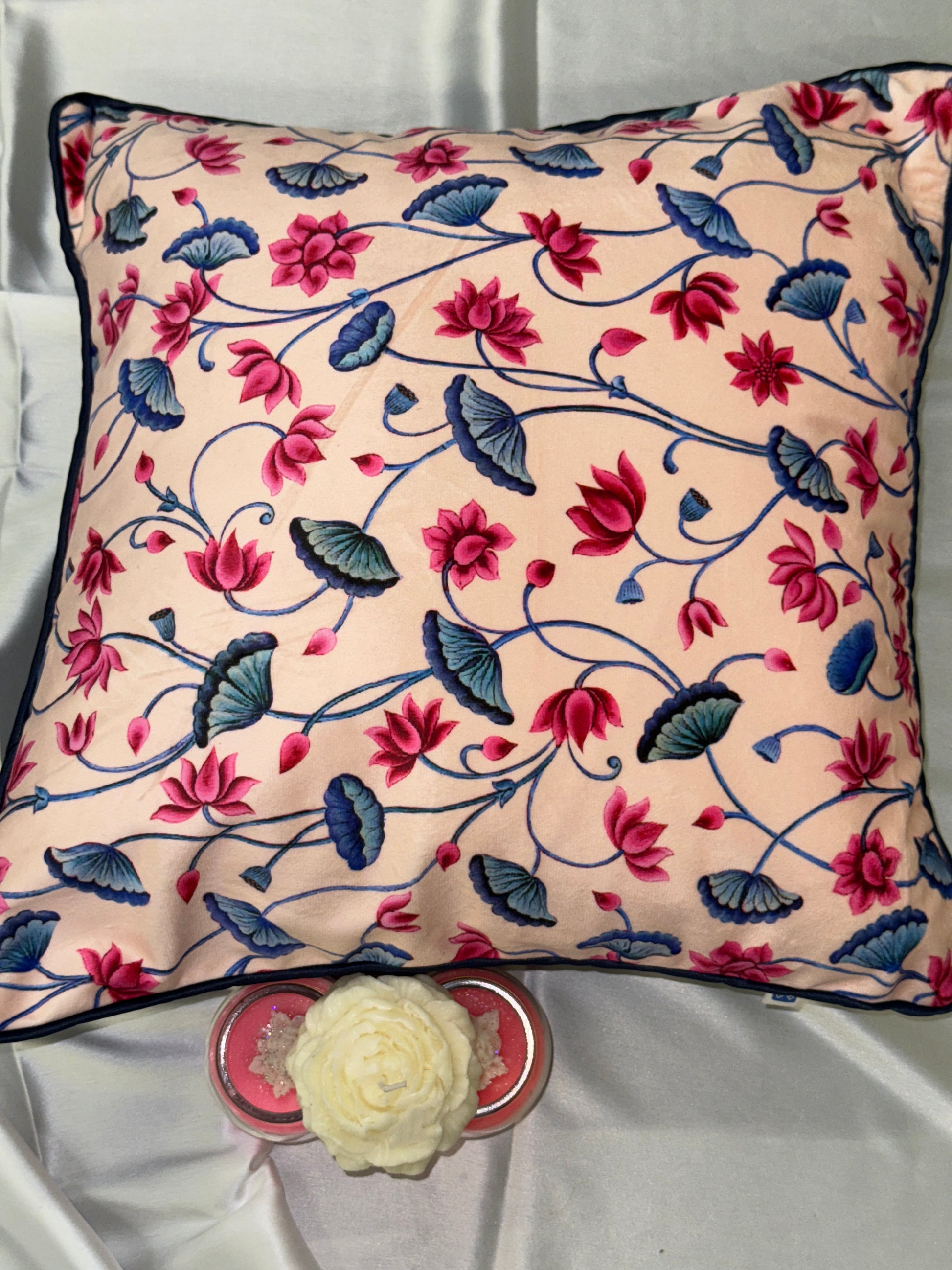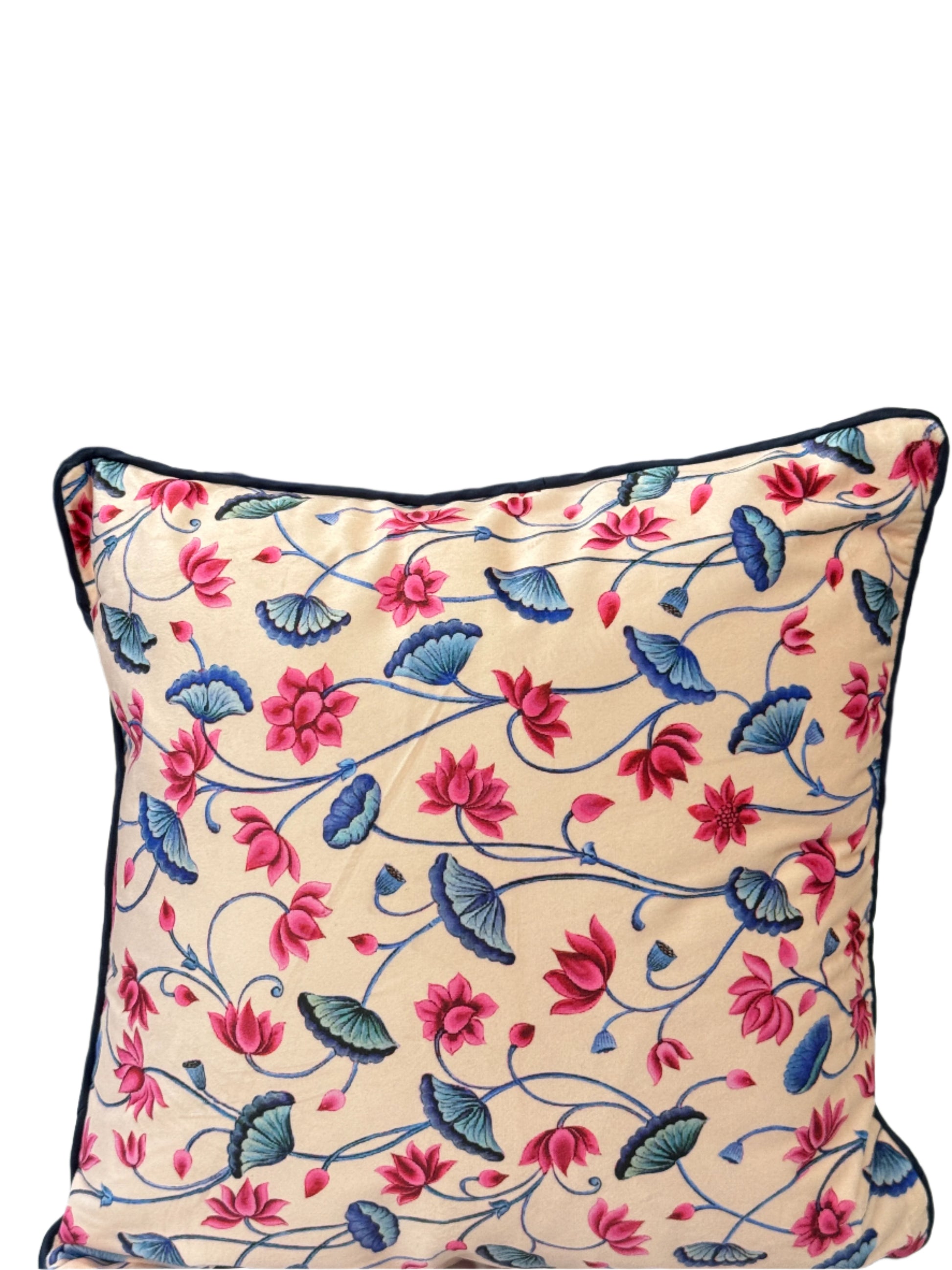Beige Velvet Cushion Cover with Blue and Pink Design – Size 16*16