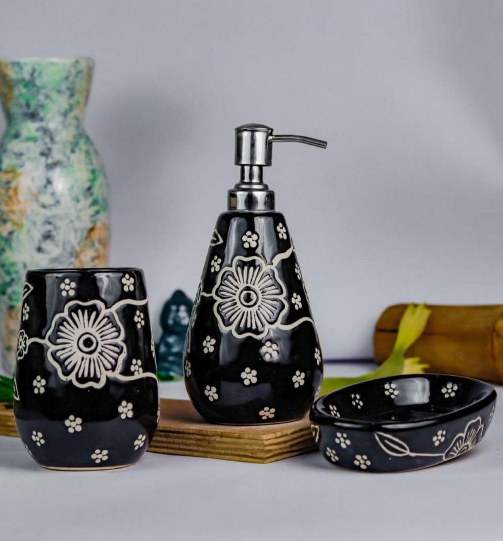 - 3-Piece Ceramic Set – Includes a soap dispenser, soap bar holder, and toothbrush holder.