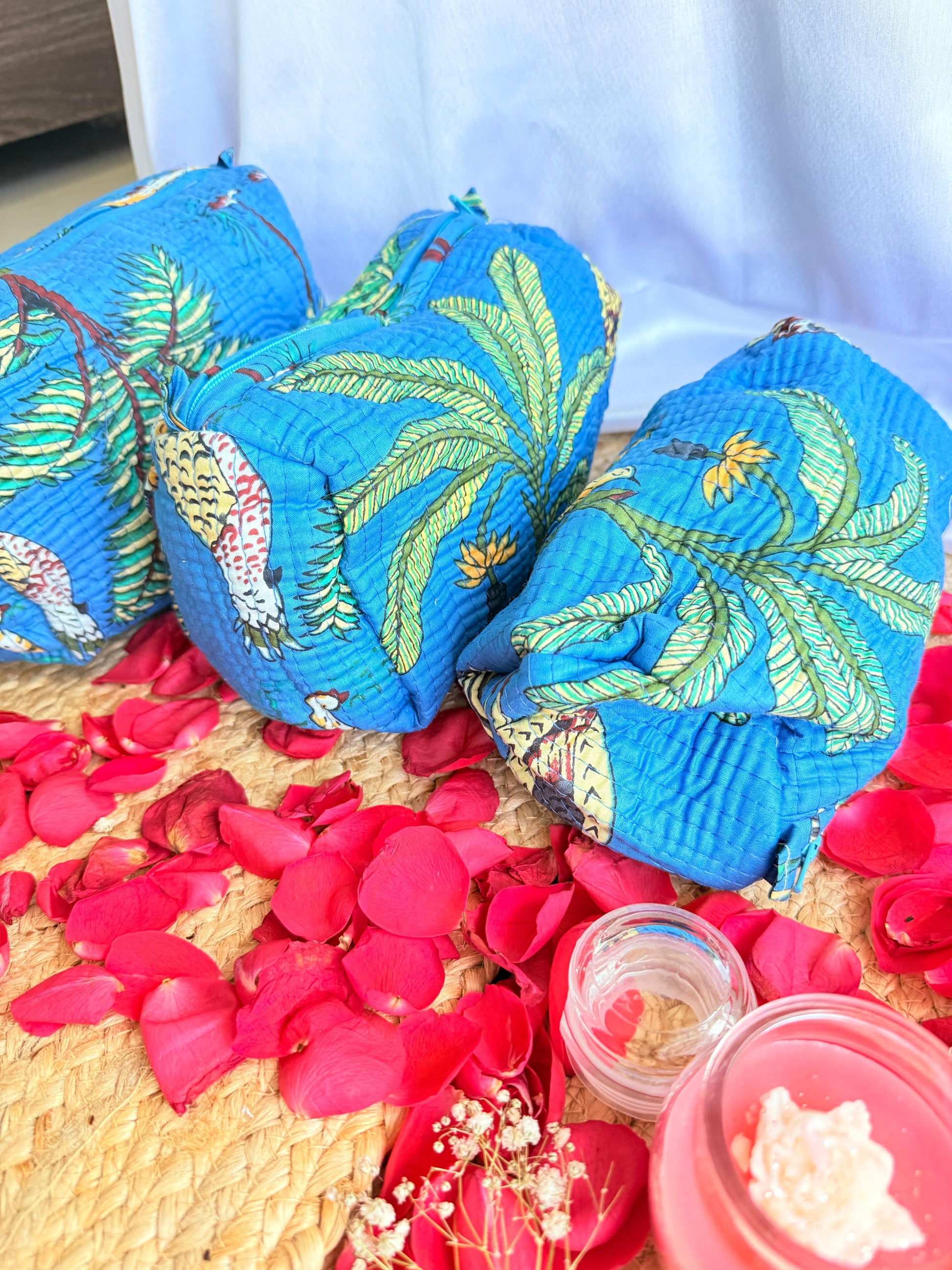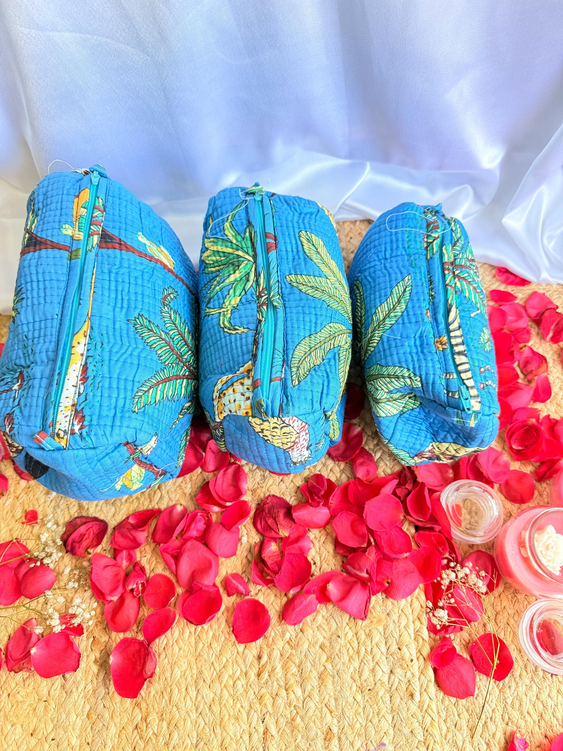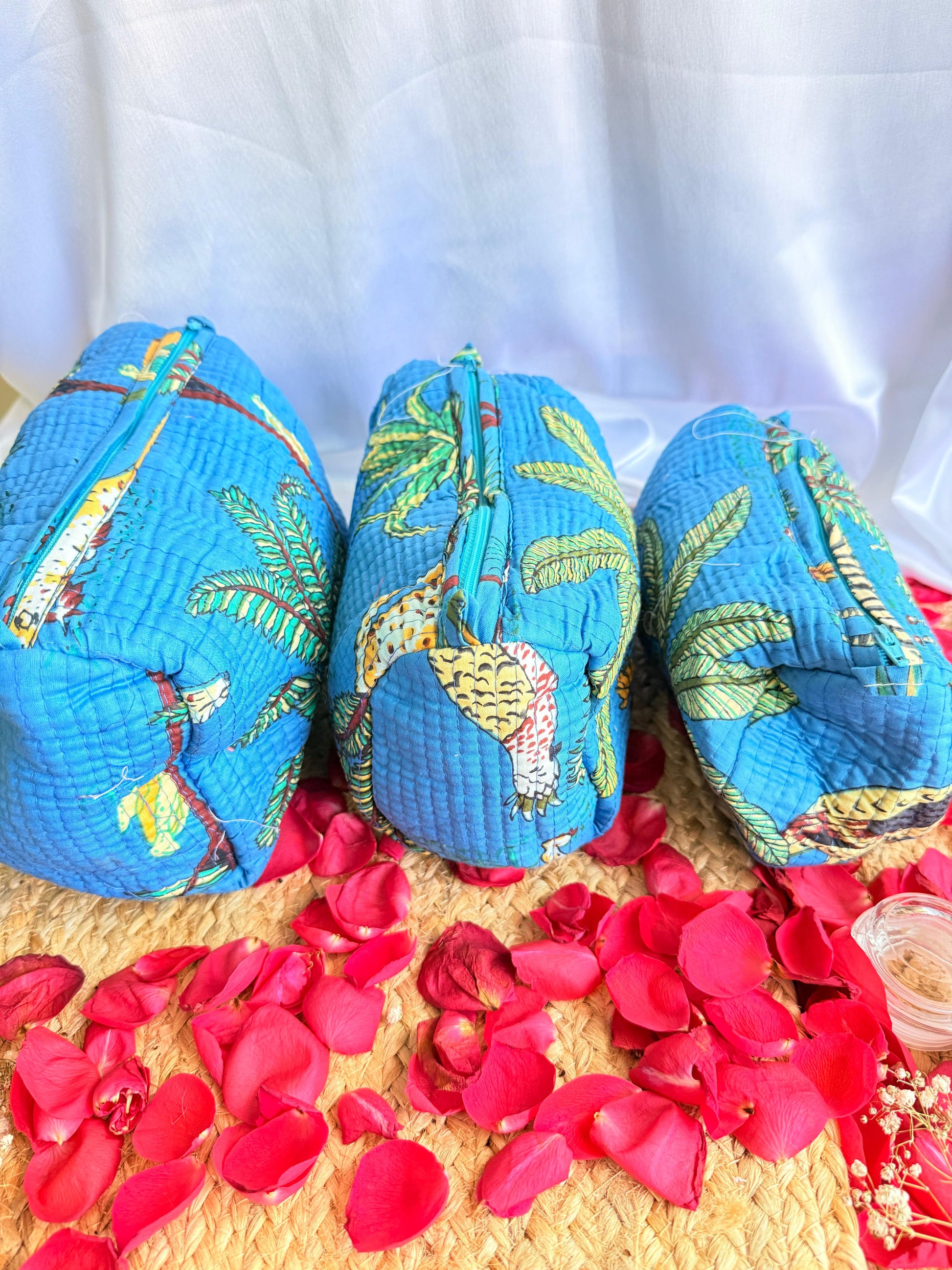 Dark Blue Floral Handblock Travel Pouch Organizer Set of 3