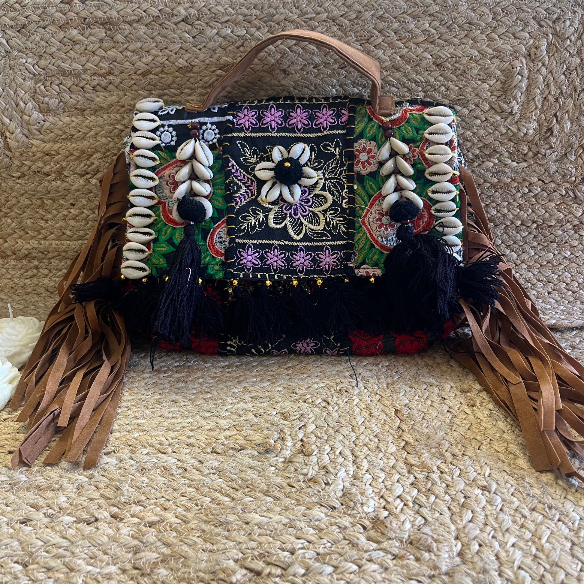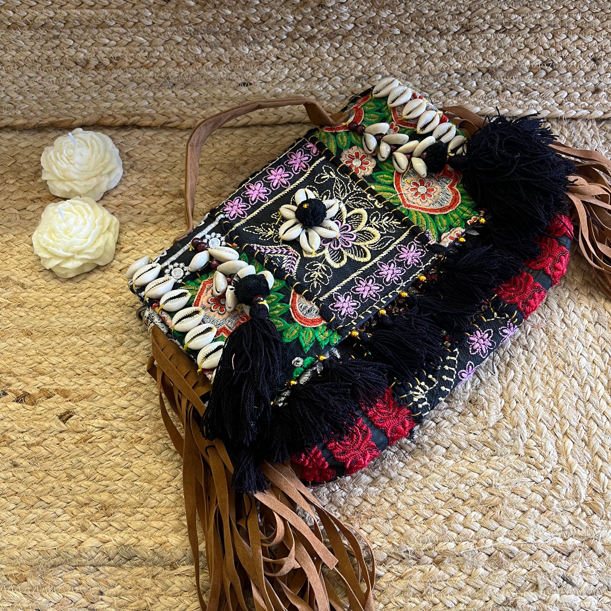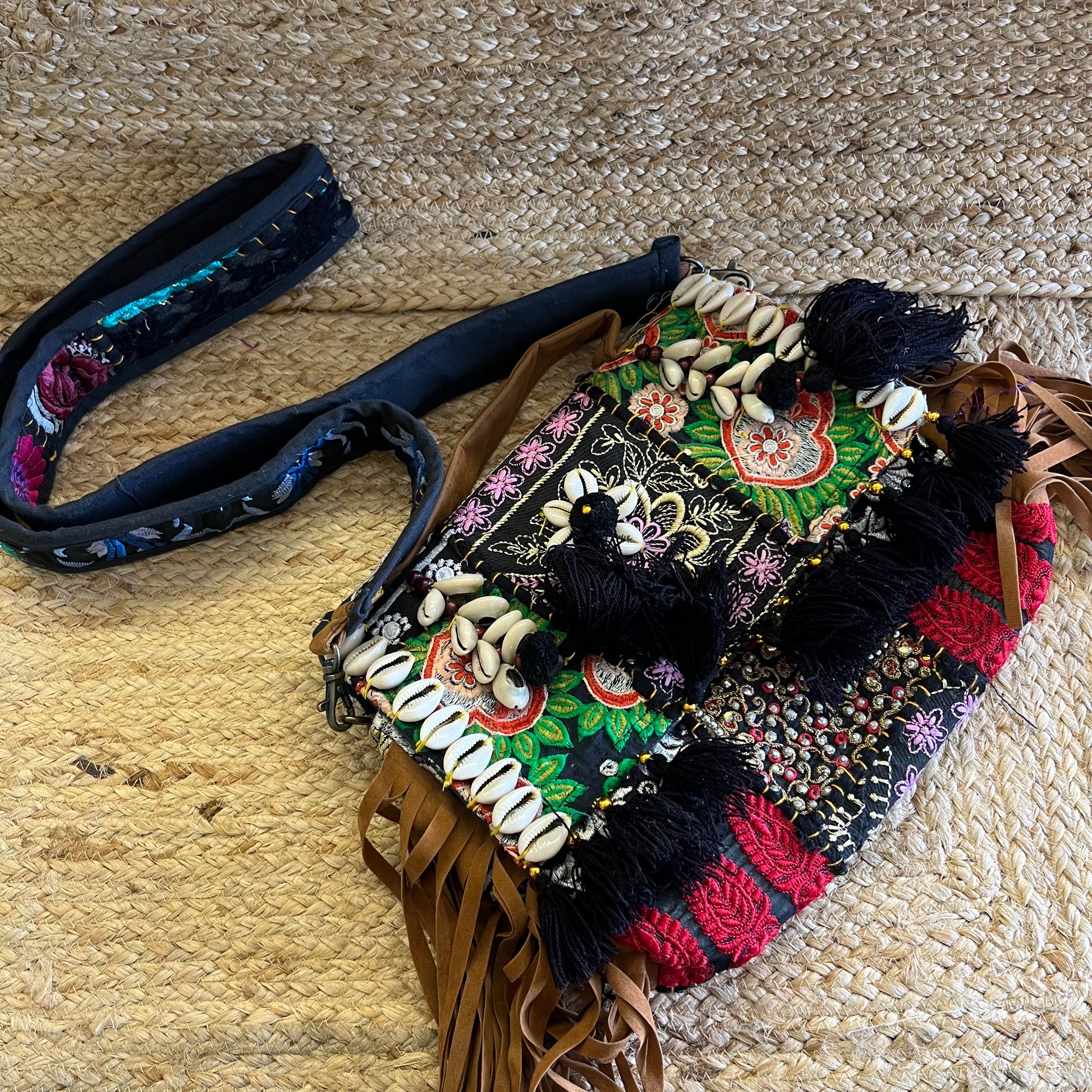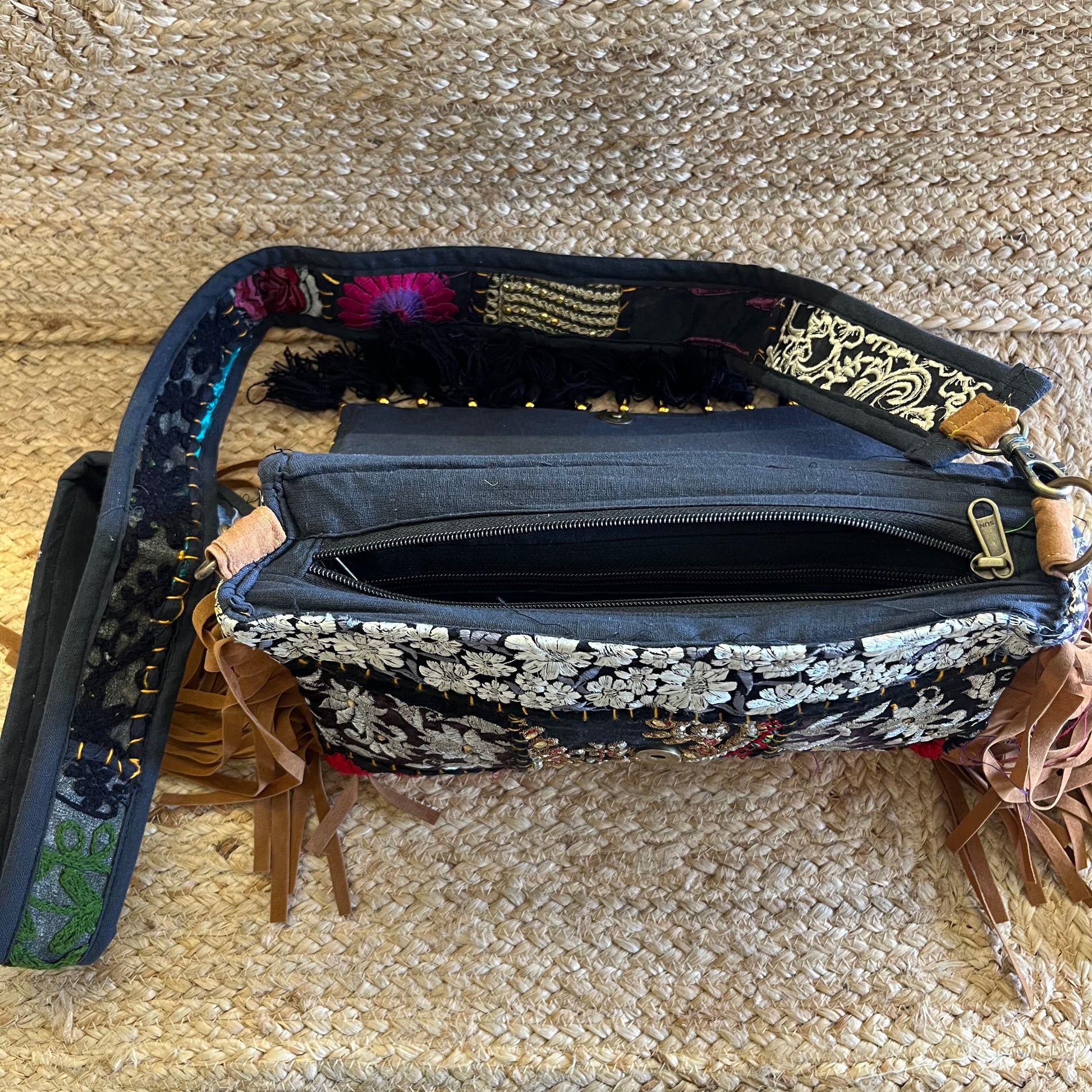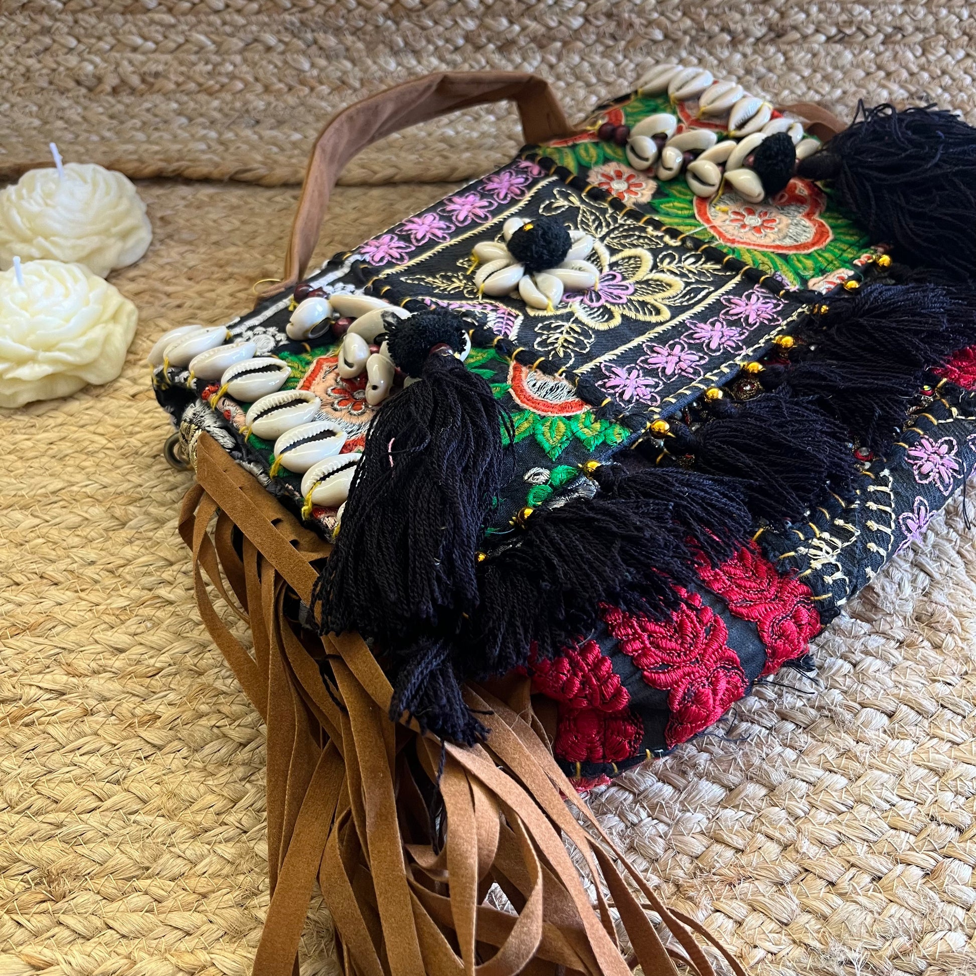 Black Tasseled Boho Sling Bag with Detachable Sling