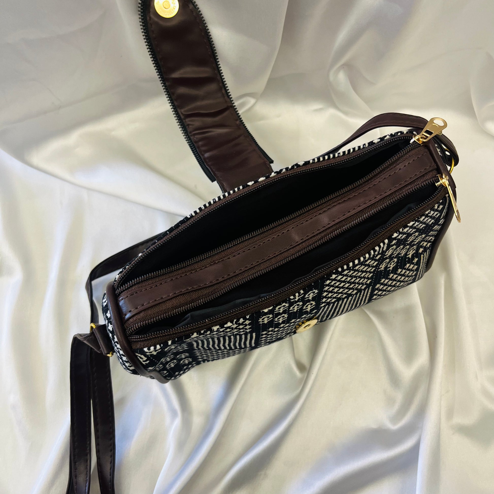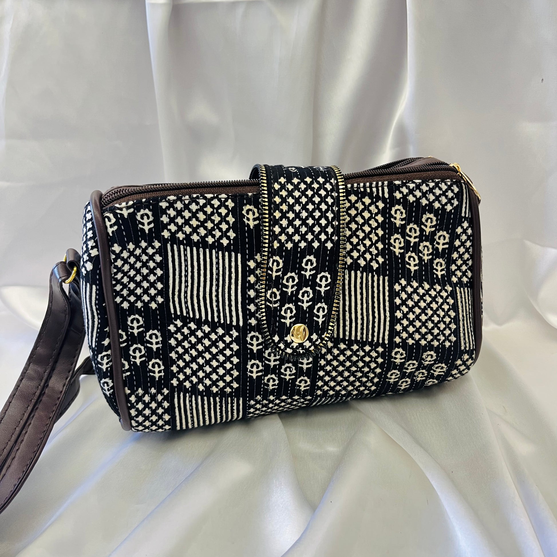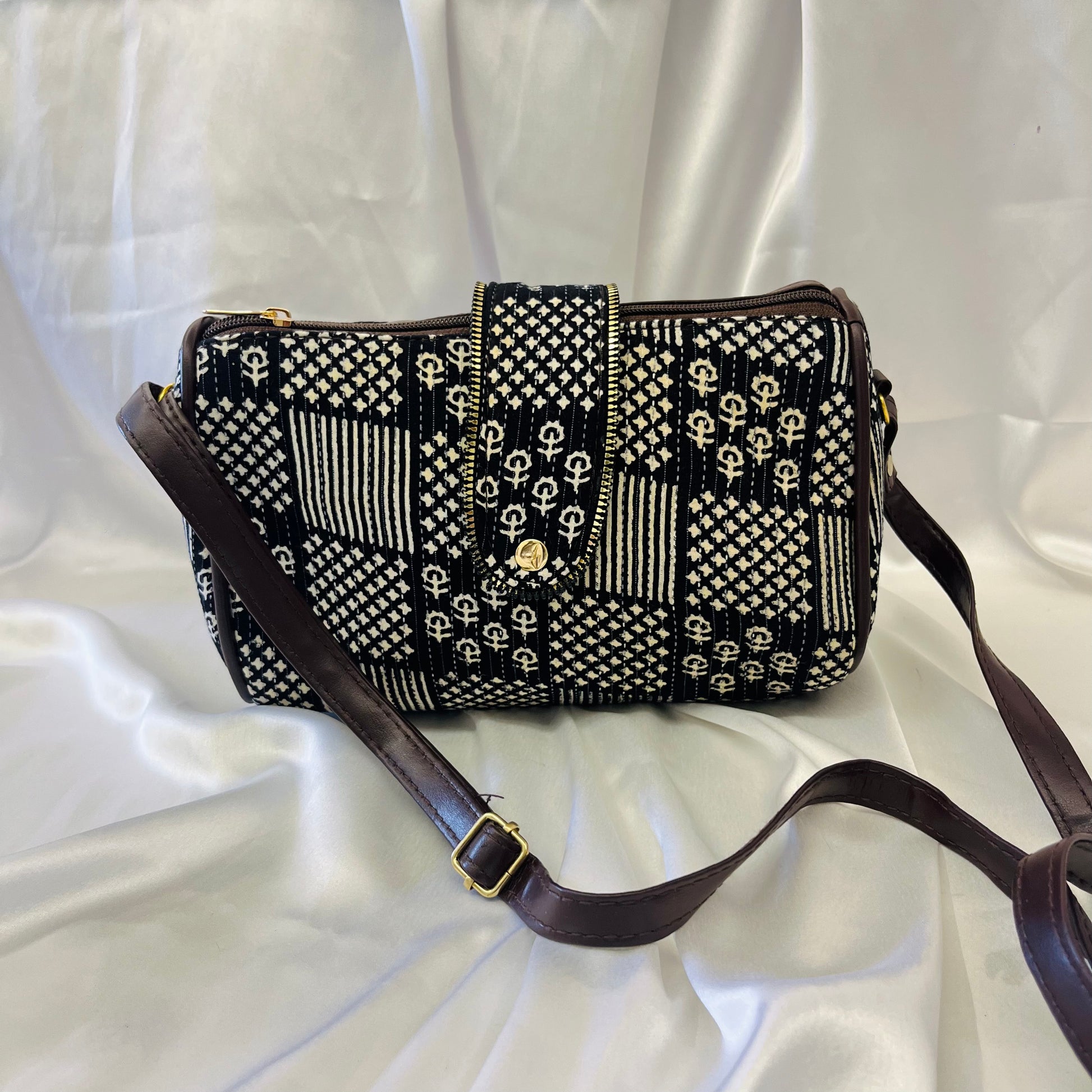 Featuring a patchwork-style handblock design in monochrome tones, this compact and stylish crossbody bag offers both elegance and everyday utility. The bag is equipped with a secure flap featuring a golden snap button, an adjustable faux leather strap, and a durable zip closure for added safety.