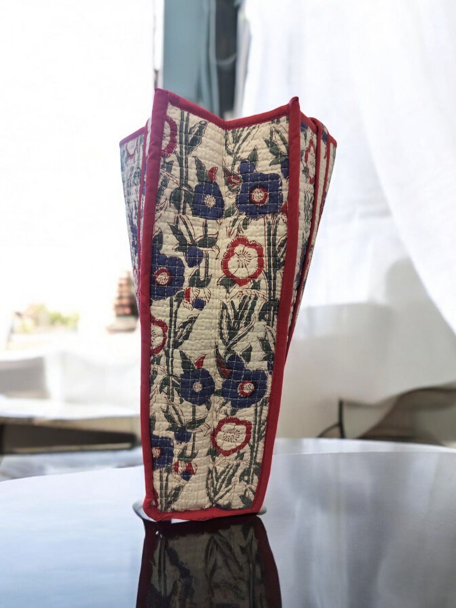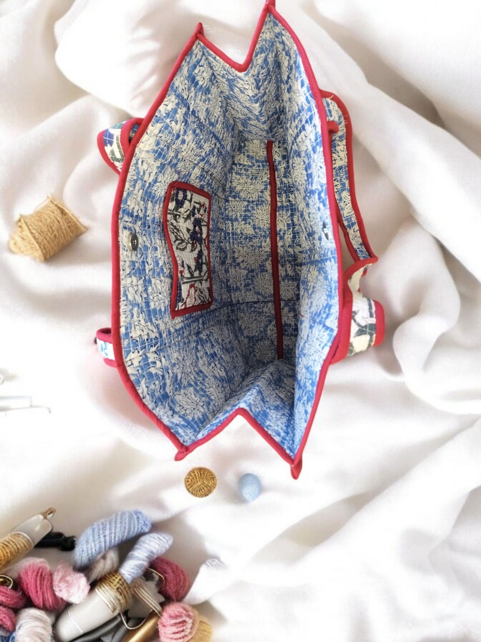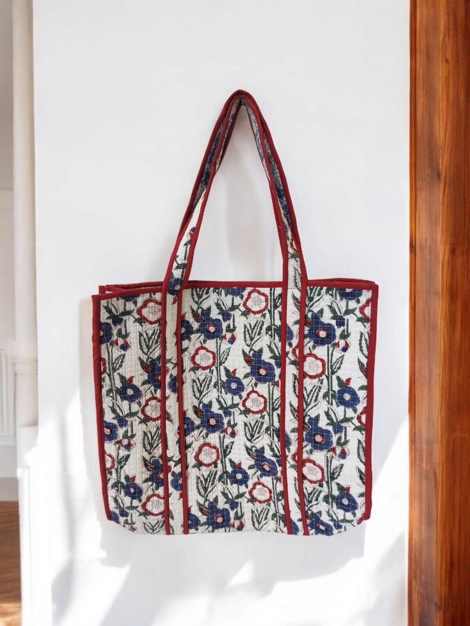 BLOCK N STYLE Red Floral Cotton Printed Tote Bag – Quilted Handblock Women’s Shoulder and Shopping Bag