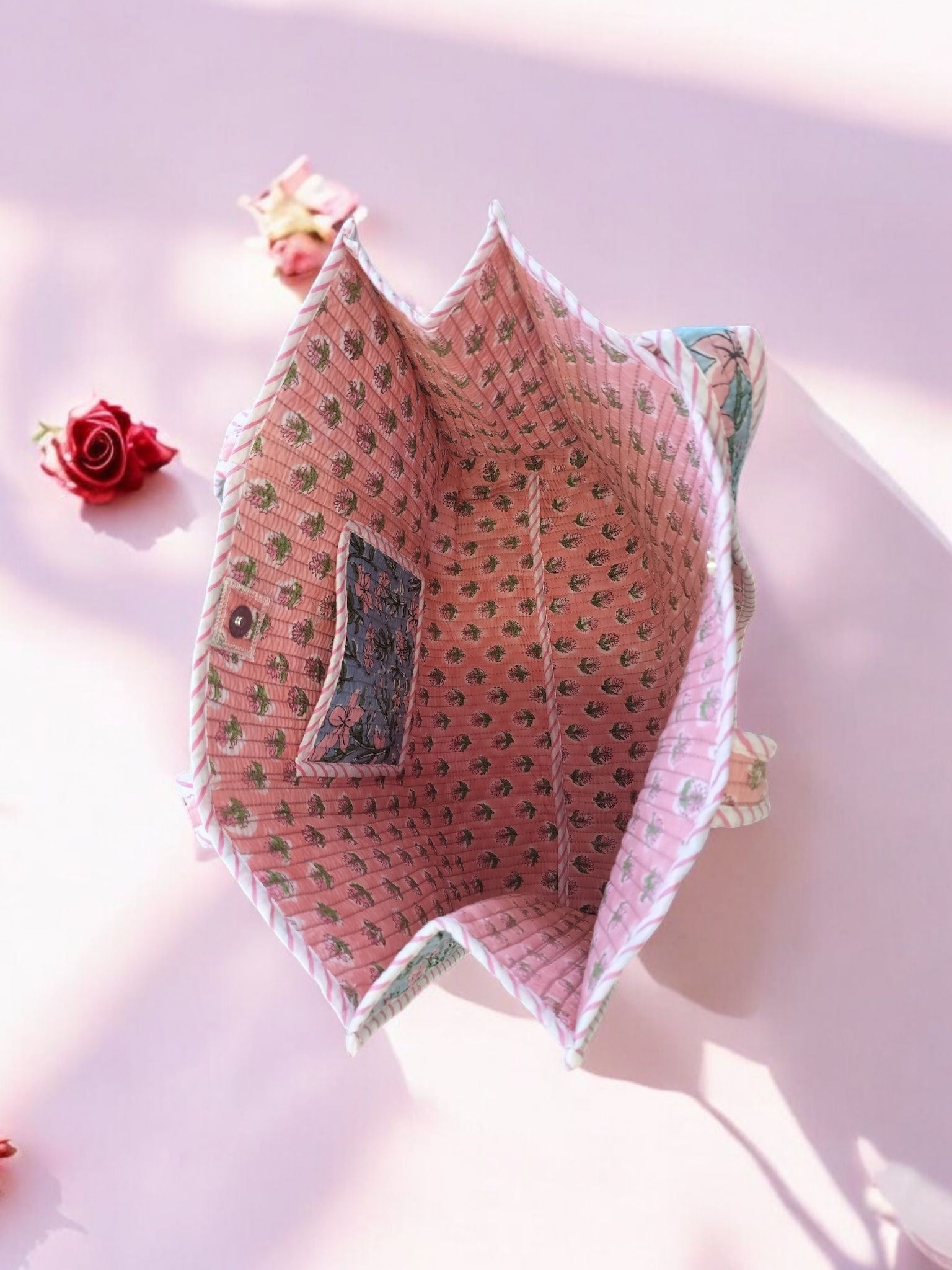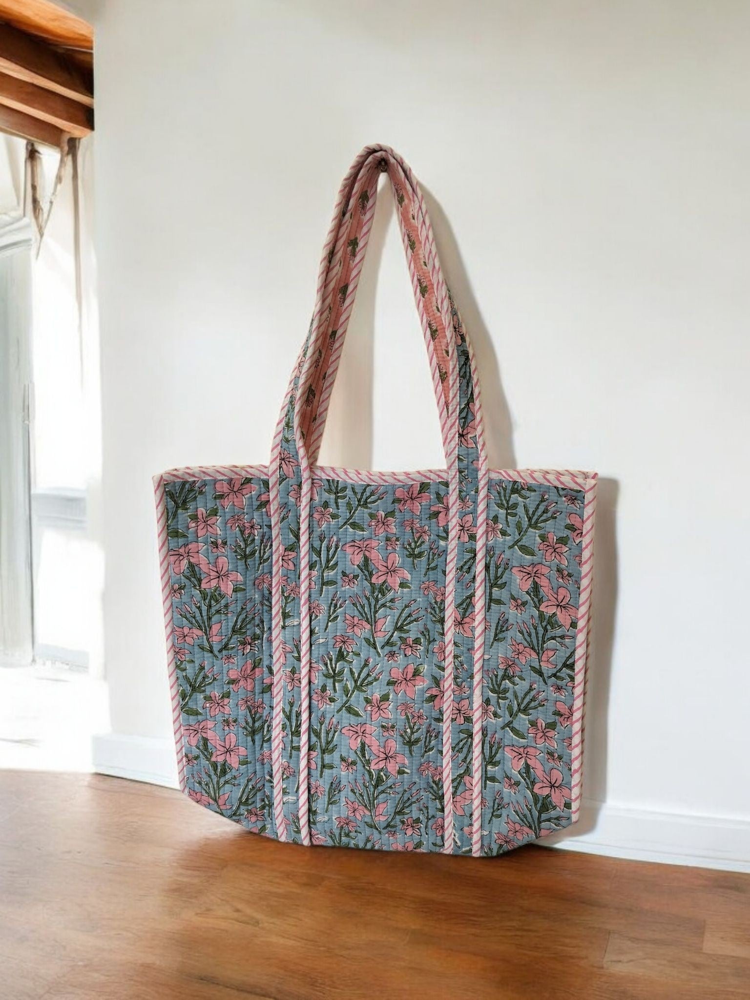 BLOCK N STYLE Sky Blue Floral Cotton Printed Tote Bag – Quilted Handblock Women’s Shoulder and Shopping Bag