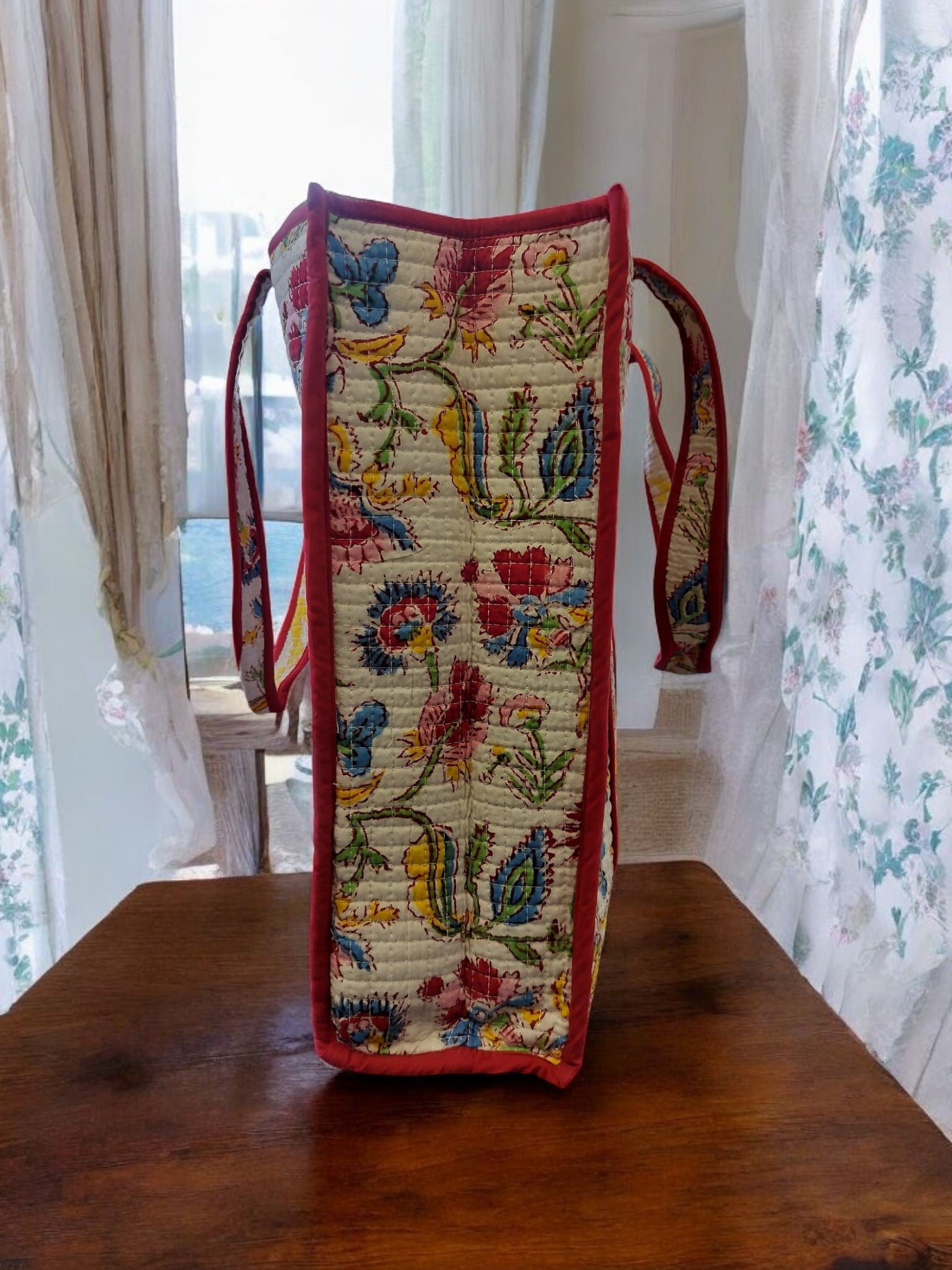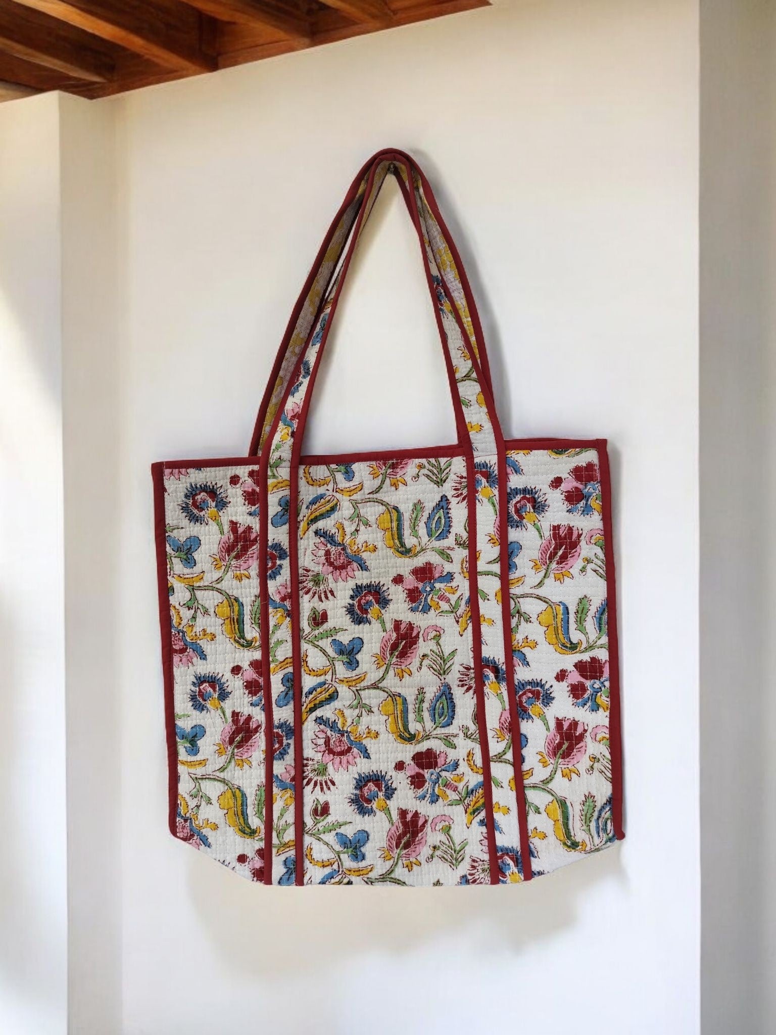 BLOCK N STYLE White Red Floral Cotton Printed Tote Bag – Hand Block Quilted Floral Carry Bag for Women