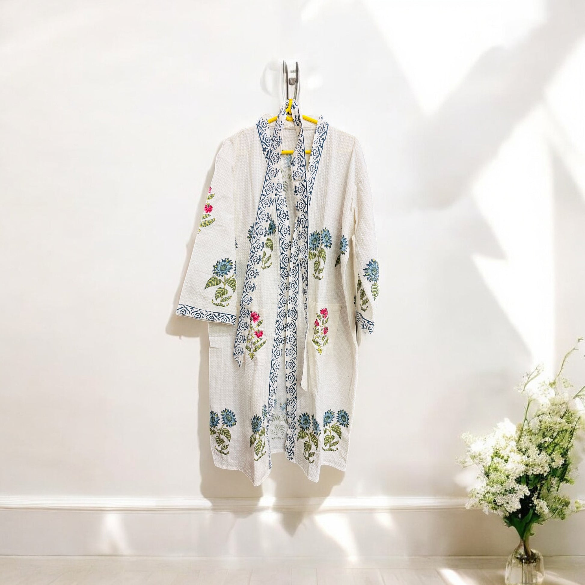Blue and Pink Floral White Handblock Bathrobe – 100% Cotton, Soft and Comfortable
