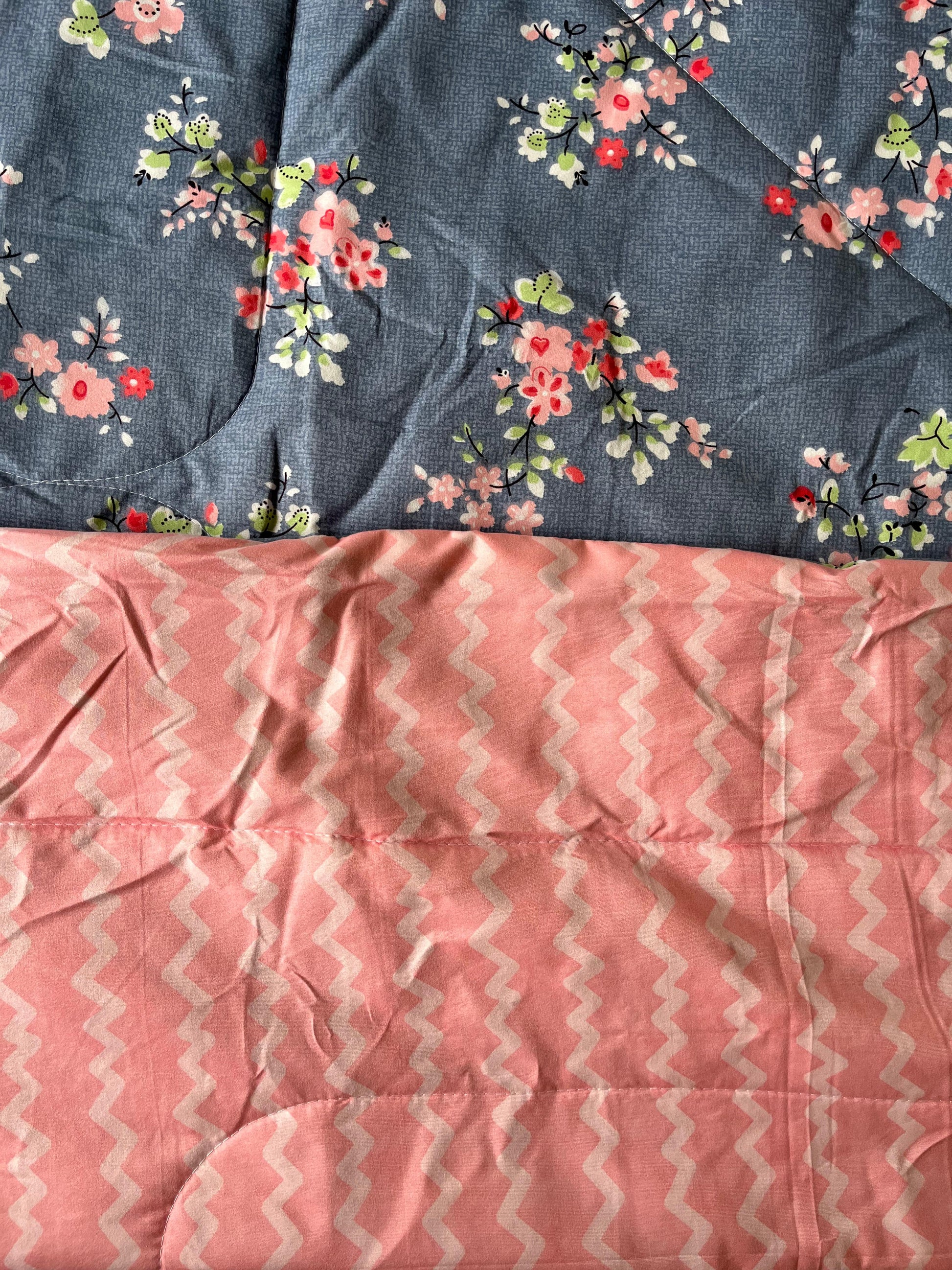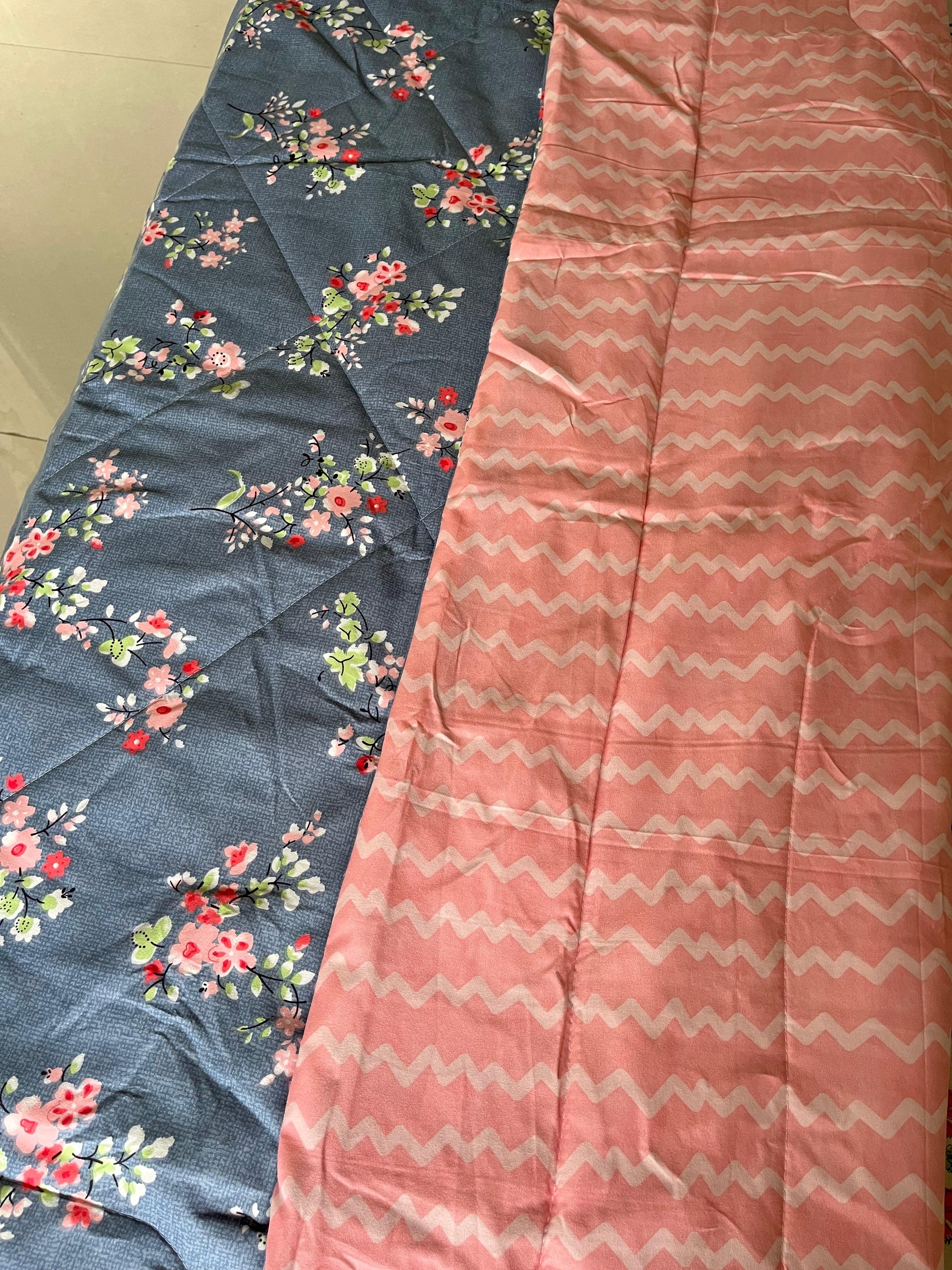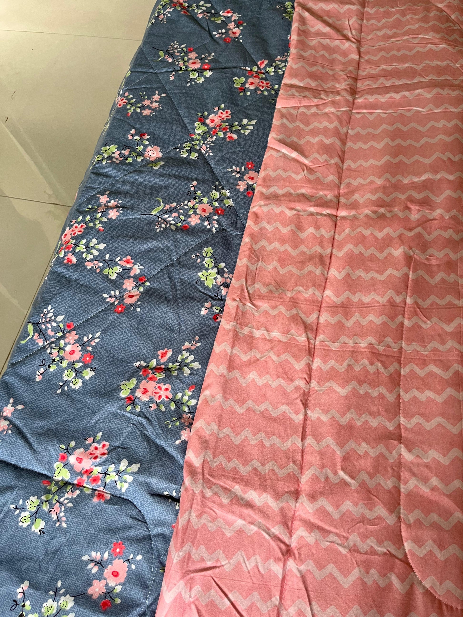 Upgrade your bedroom with the Single Bed Comforter in Blue and Pink, sized 60x90 inches. Made from 100% premium cotton, this soft, lightweight comforter offers the perfect blend of style and comfort. Featuring a reversible design with vibrant blue and pink patterns, it adds elegance and versatility to your decor. Ideal for all-season use, this breathable and cozy comforter keeps you warm during winters and cool during summers. Designed with eco-friendly dyes, it’s safe, skin-friendly, and long-lasting. Transform your space with this easy-to-maintain, dry-clean-only comforter—perfect for modern homes!