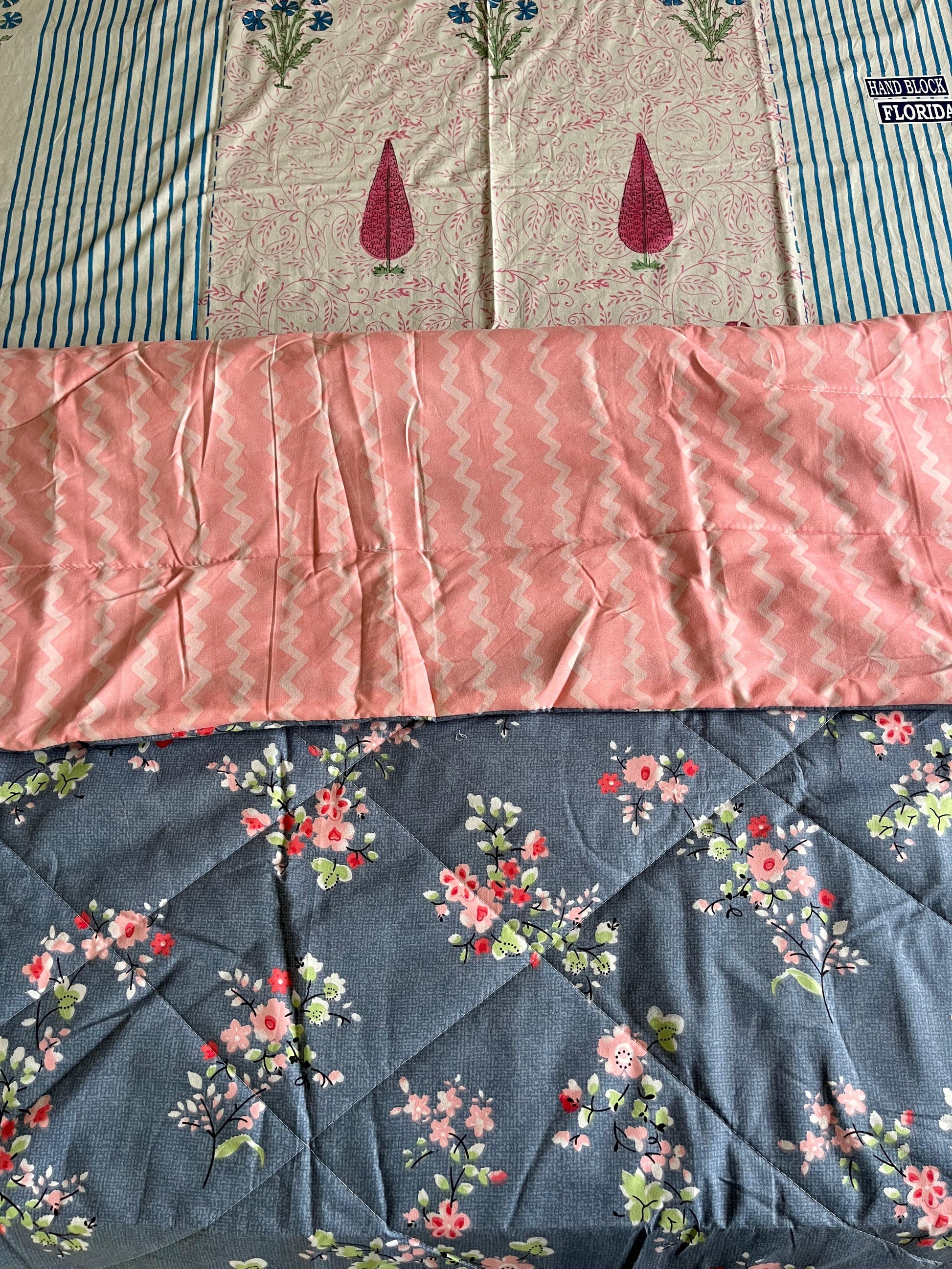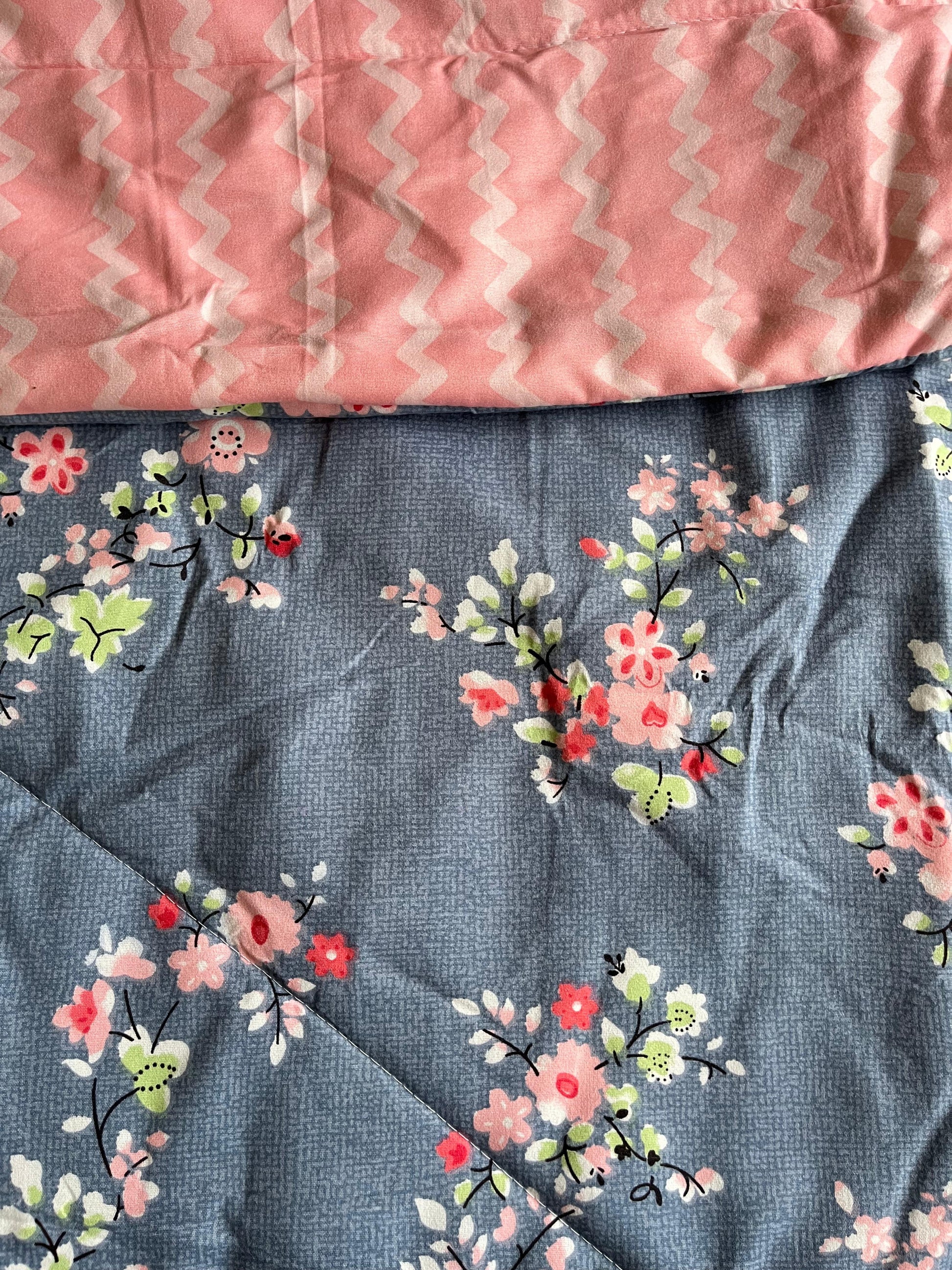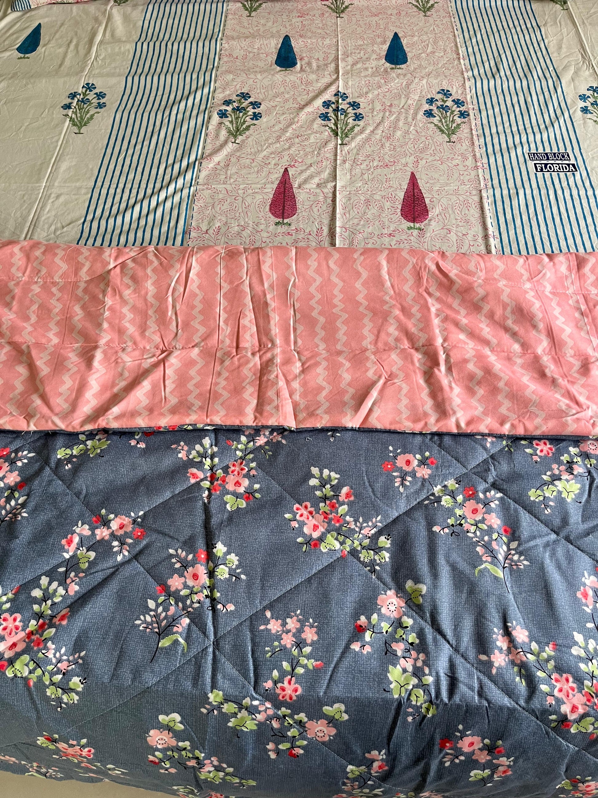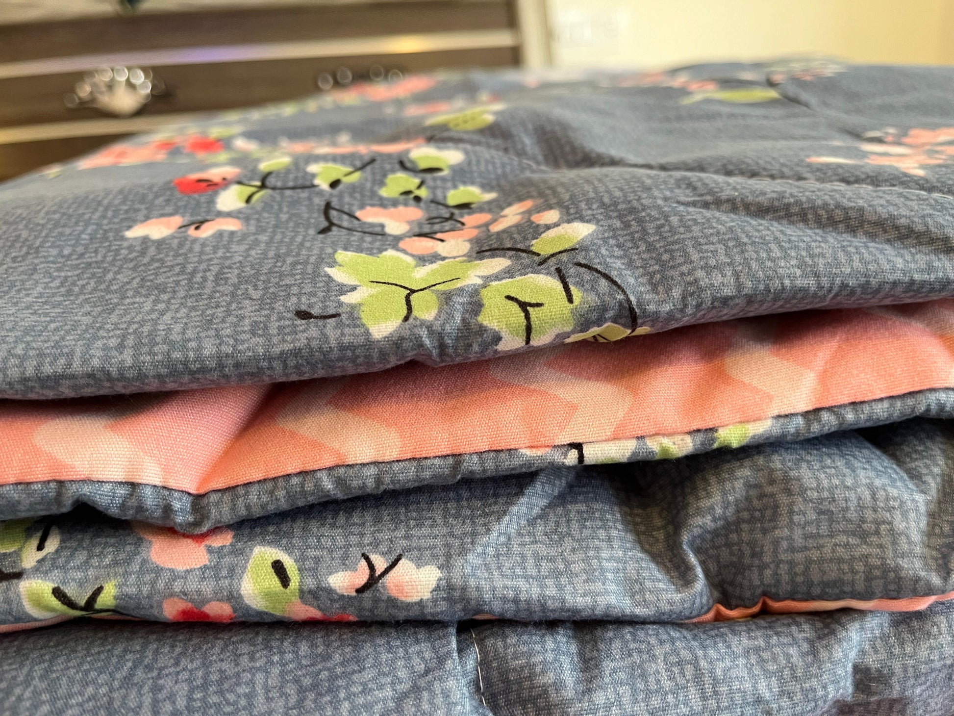 Upgrade your bedroom with the Single Bed Comforter in Blue and Pink, sized 60x90 inches. Made from 100% premium cotton, this soft, lightweight comforter offers the perfect blend of style and comfort. Featuring a reversible design with vibrant blue and pink patterns, it adds elegance and versatility to your decor. Ideal for all-season use, this breathable and cozy comforter keeps you warm during winters and cool during summers. Designed with eco-friendly dyes, it’s safe, skin-friendly, and long-lasting. Transform your space with this easy-to-maintain, dry-clean-only comforter—perfect for modern homes!