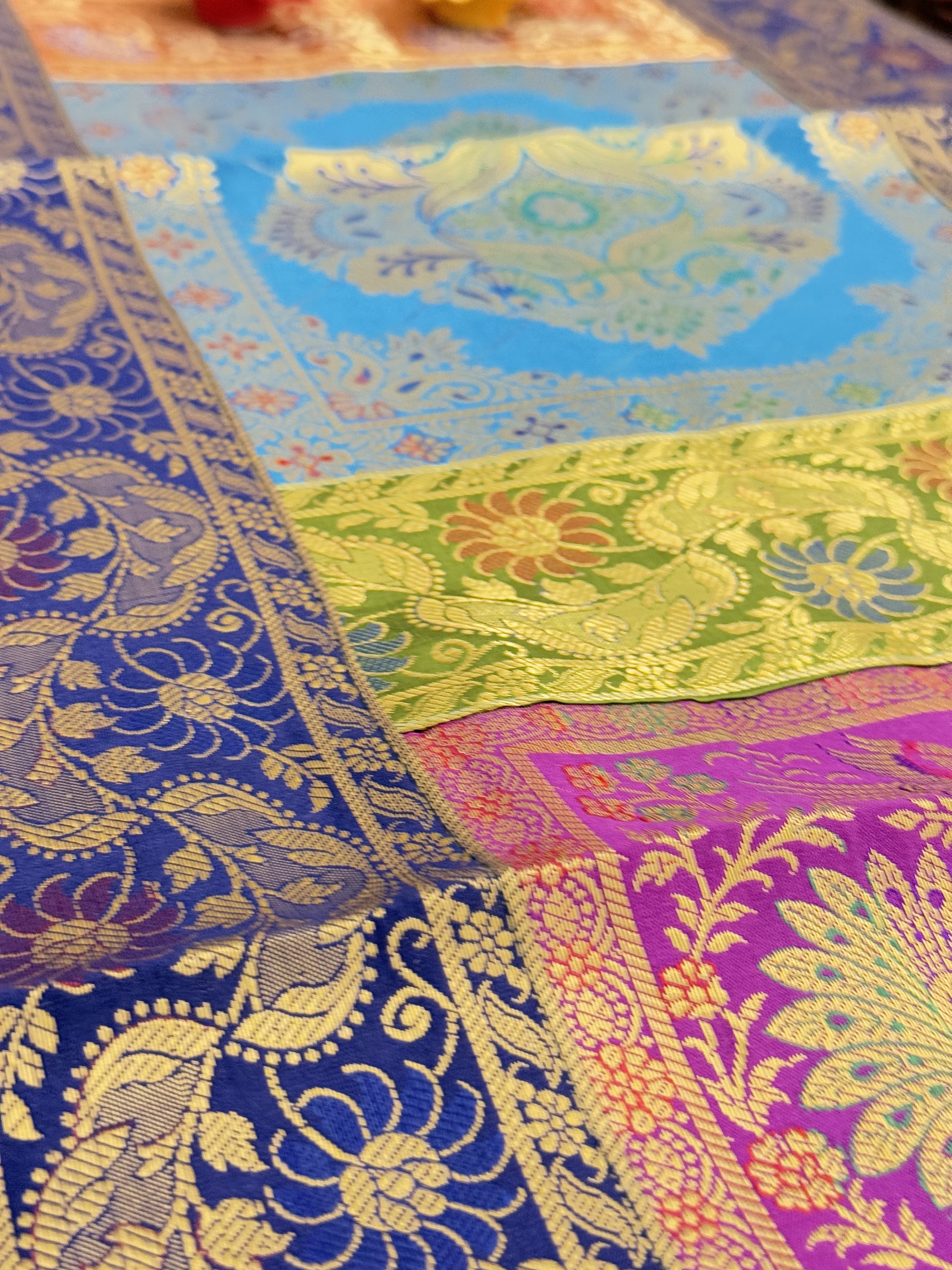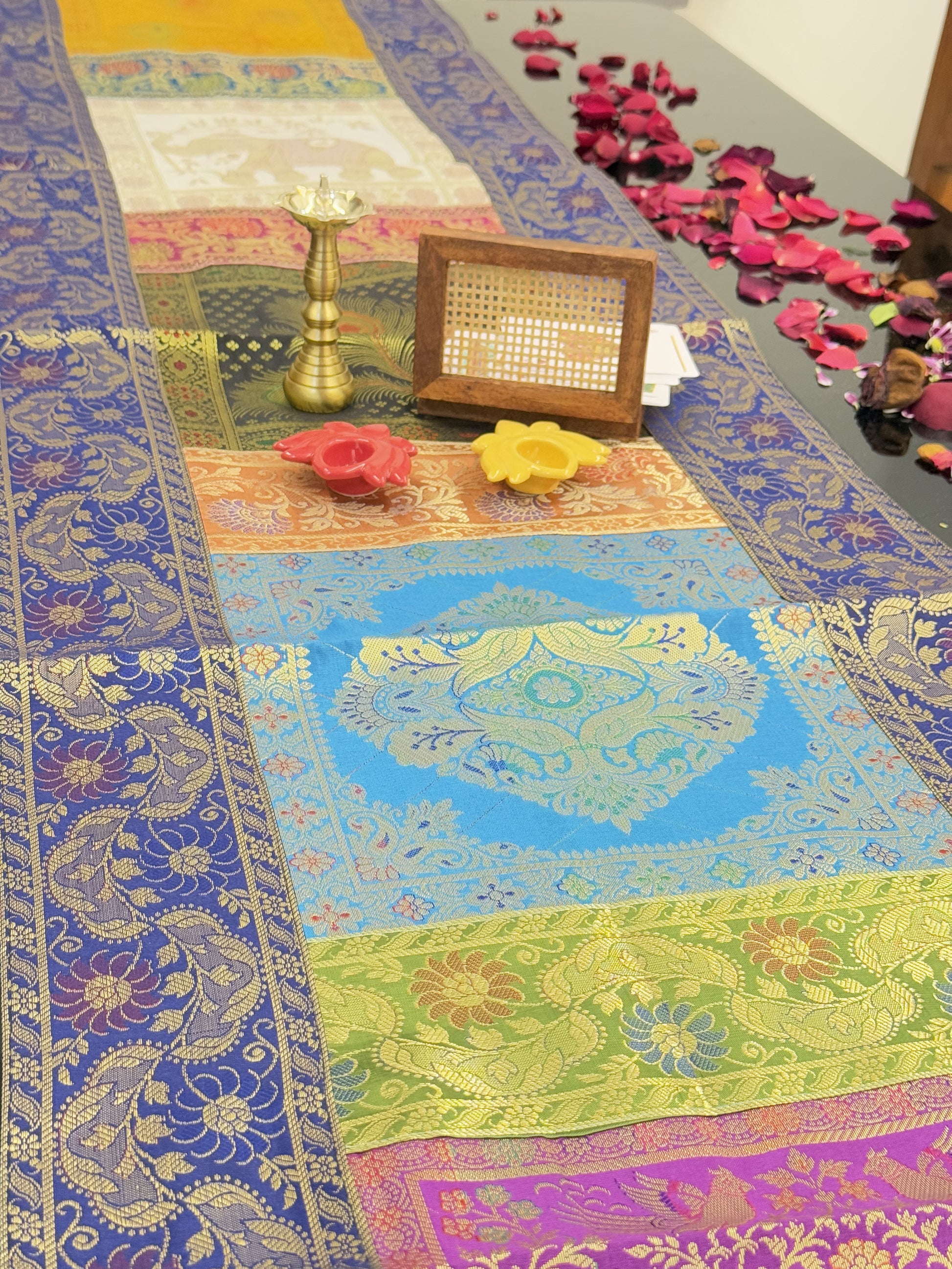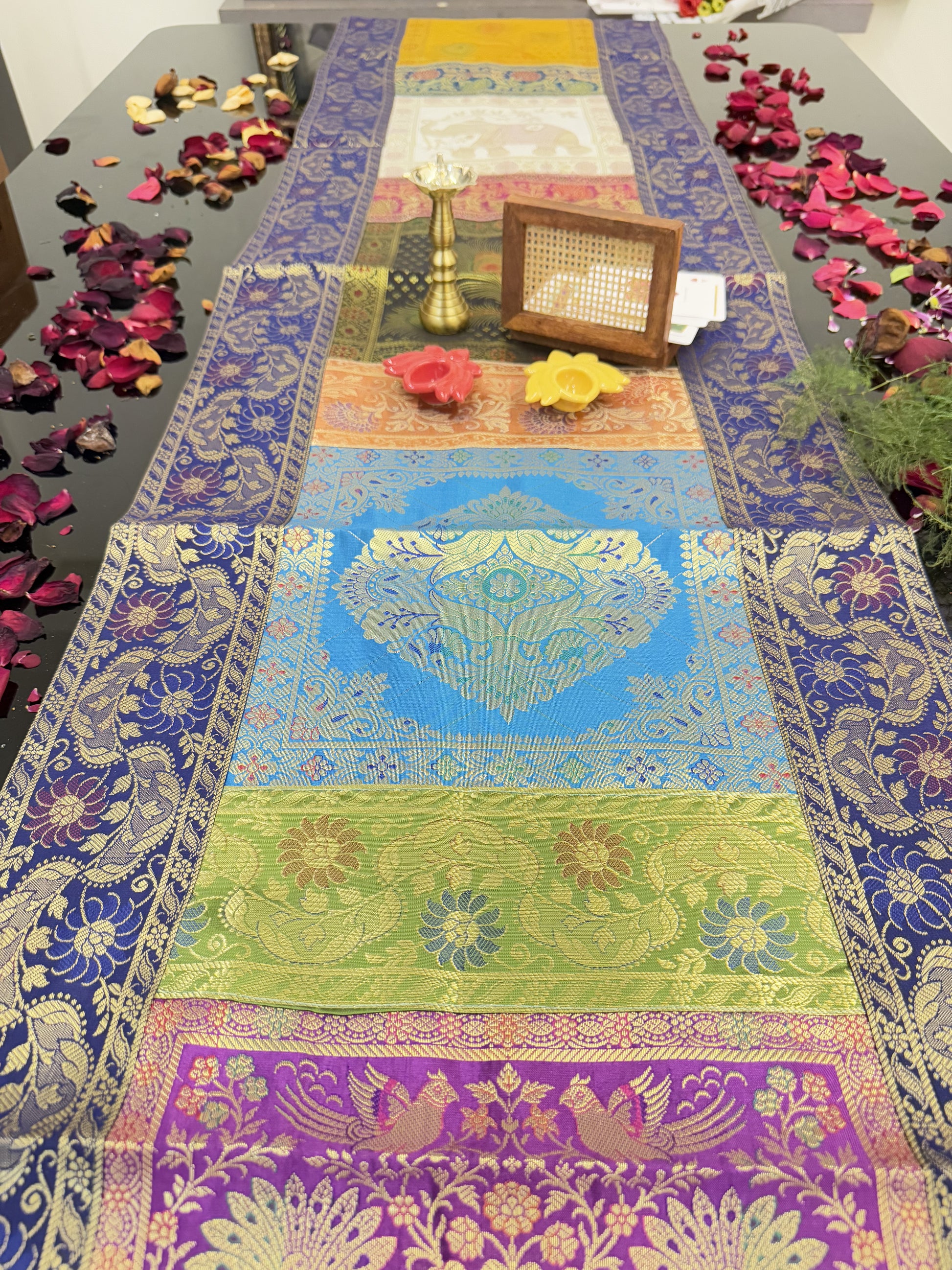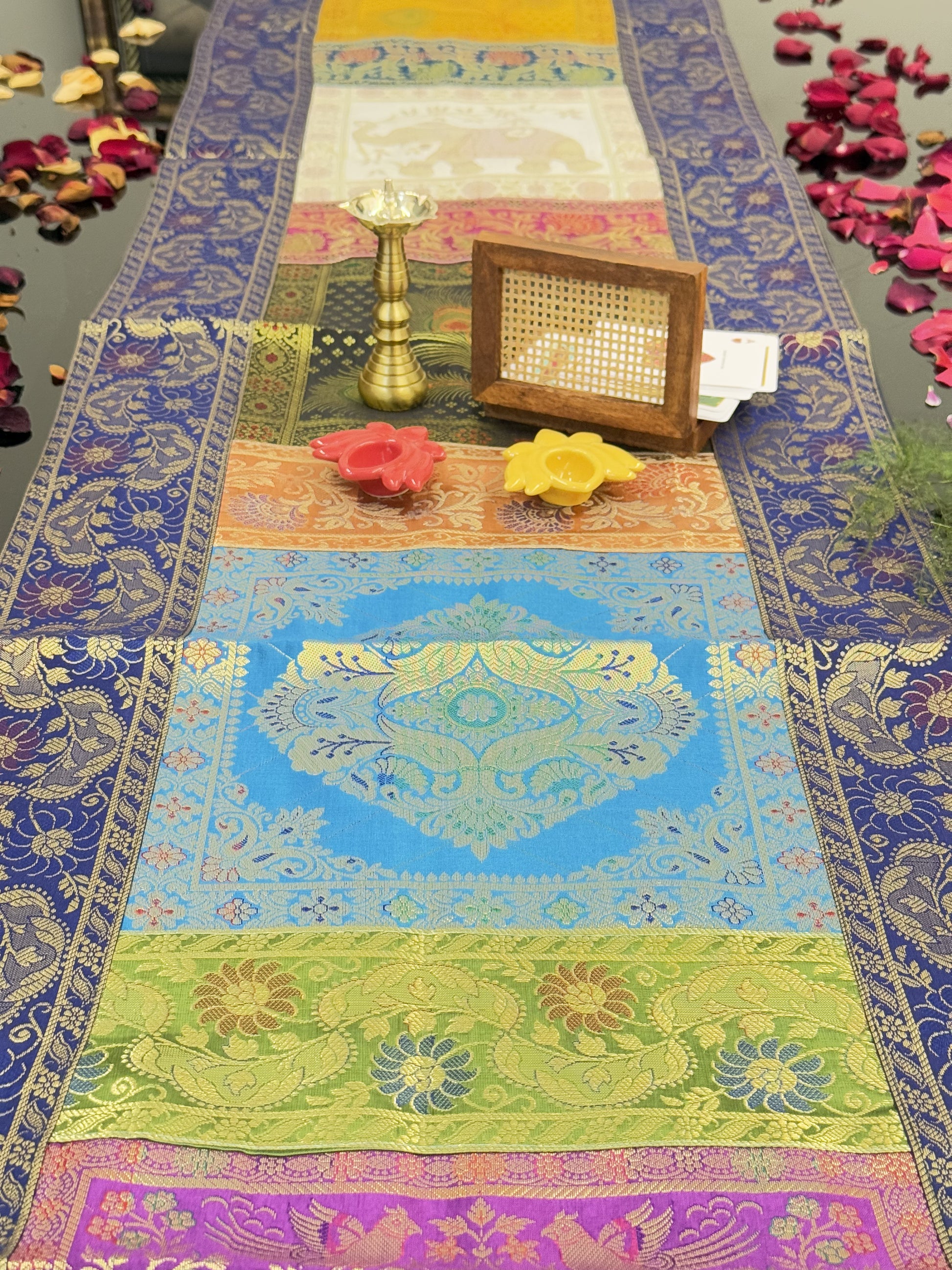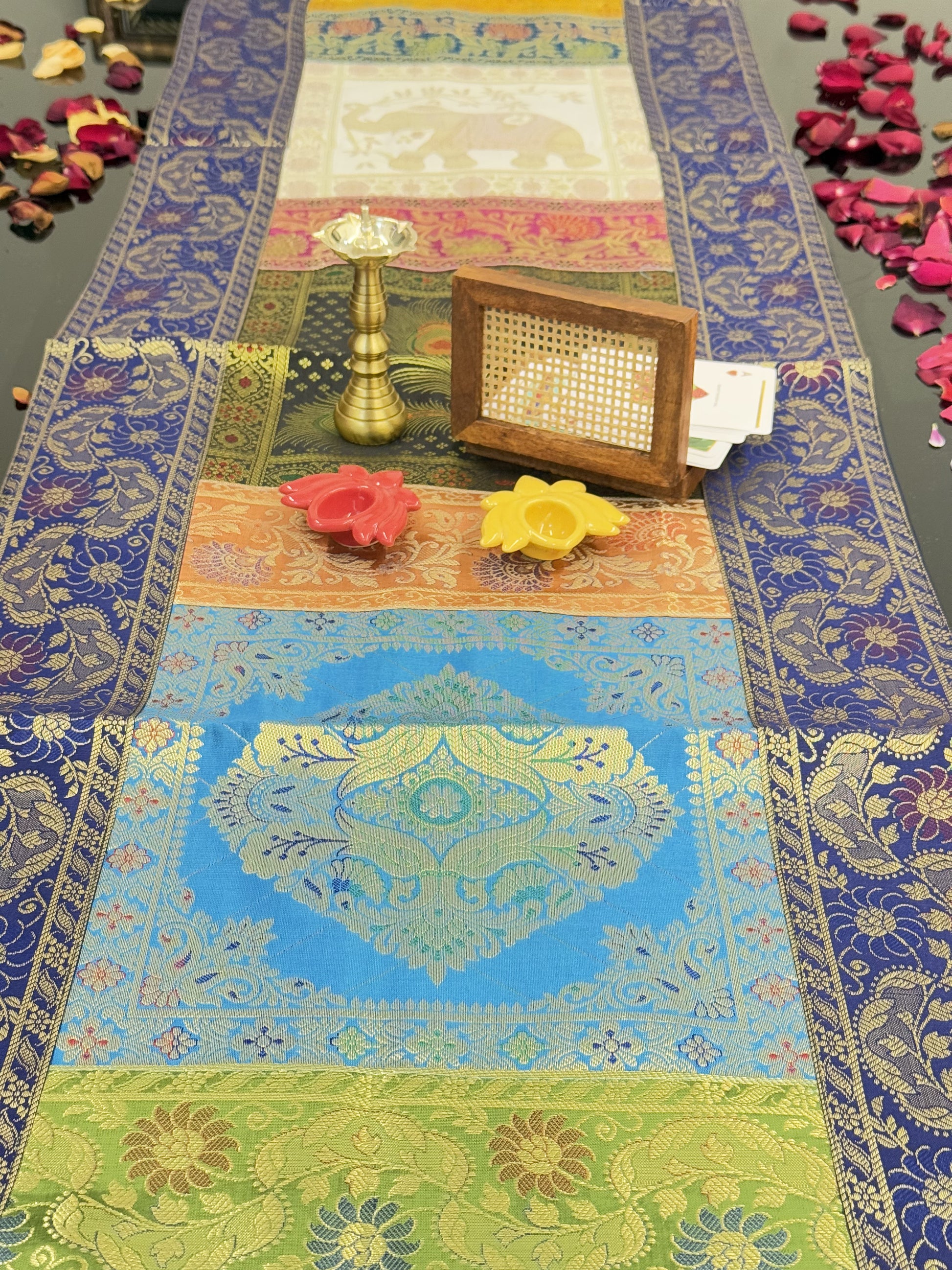Whether you’re looking to elevate your home décor or impress guests with your style, the Blue Banarasi Silk Patchwork Table Runner will make a stunning statement in any room.