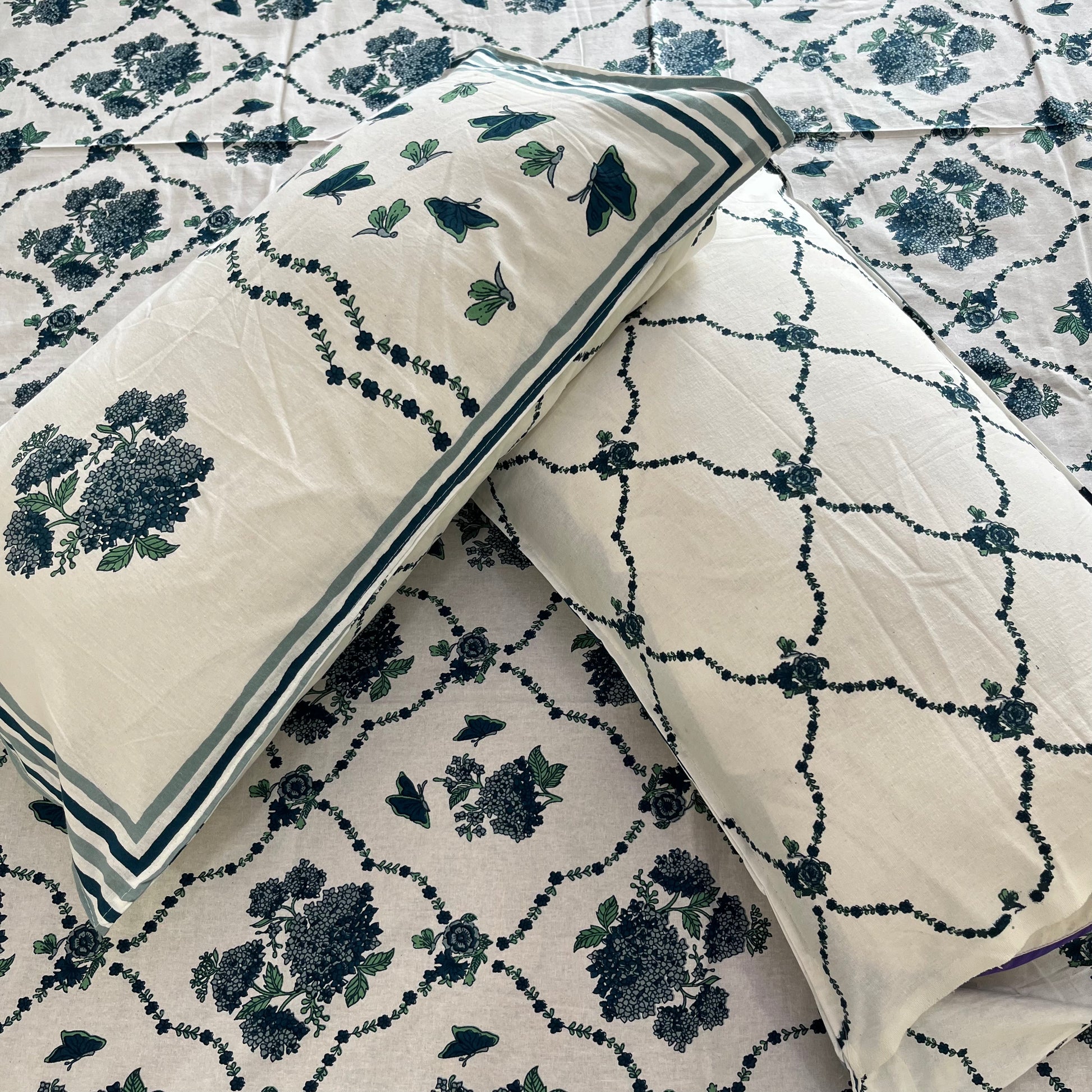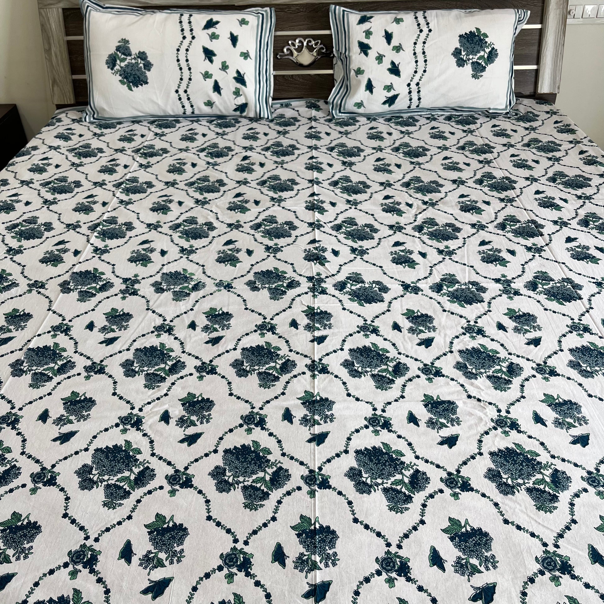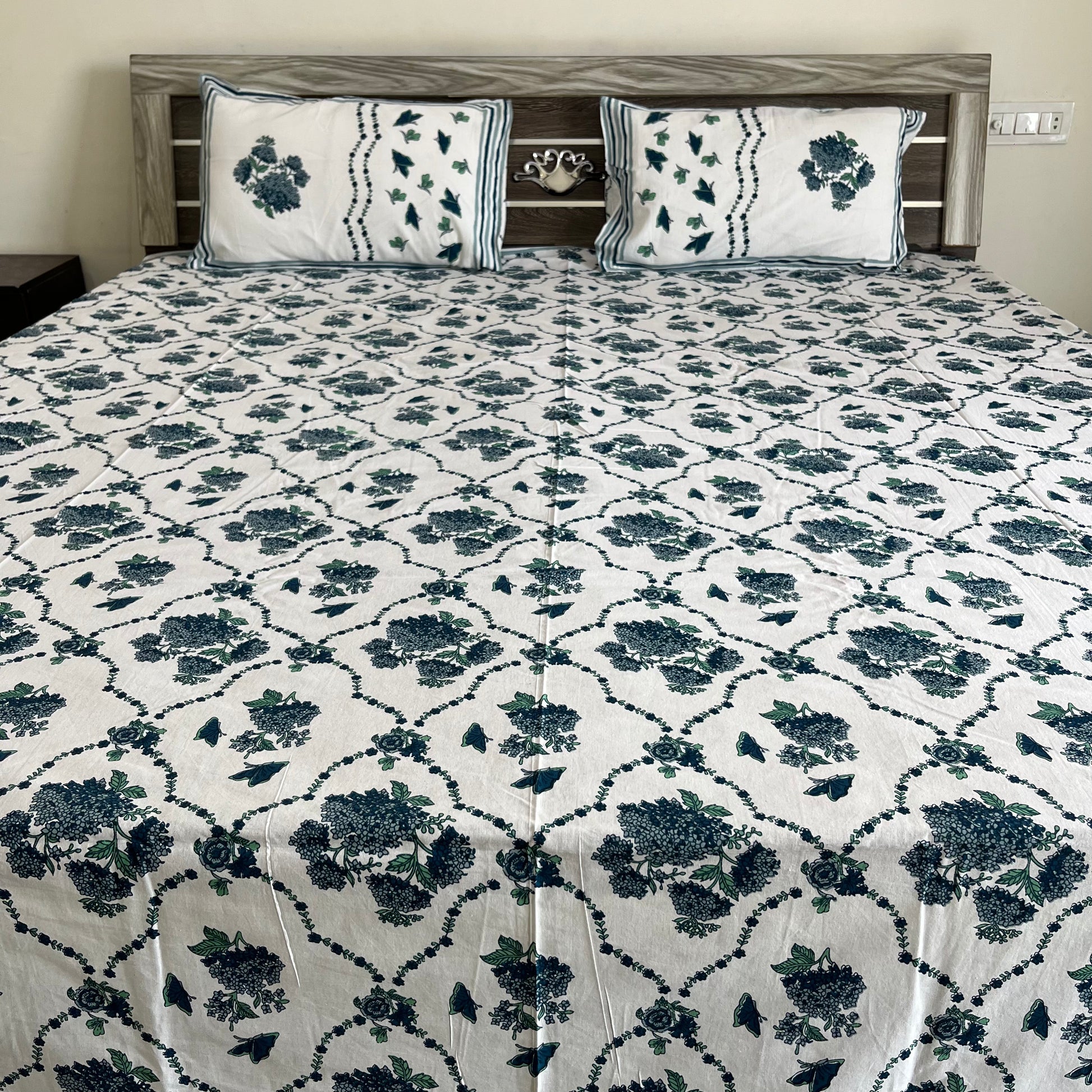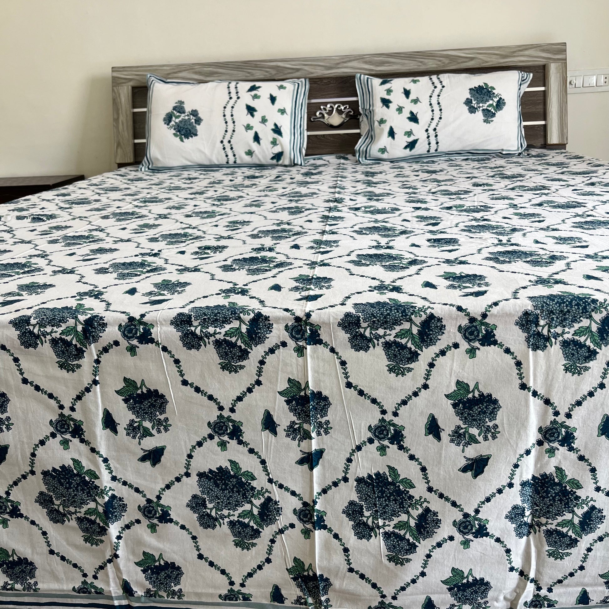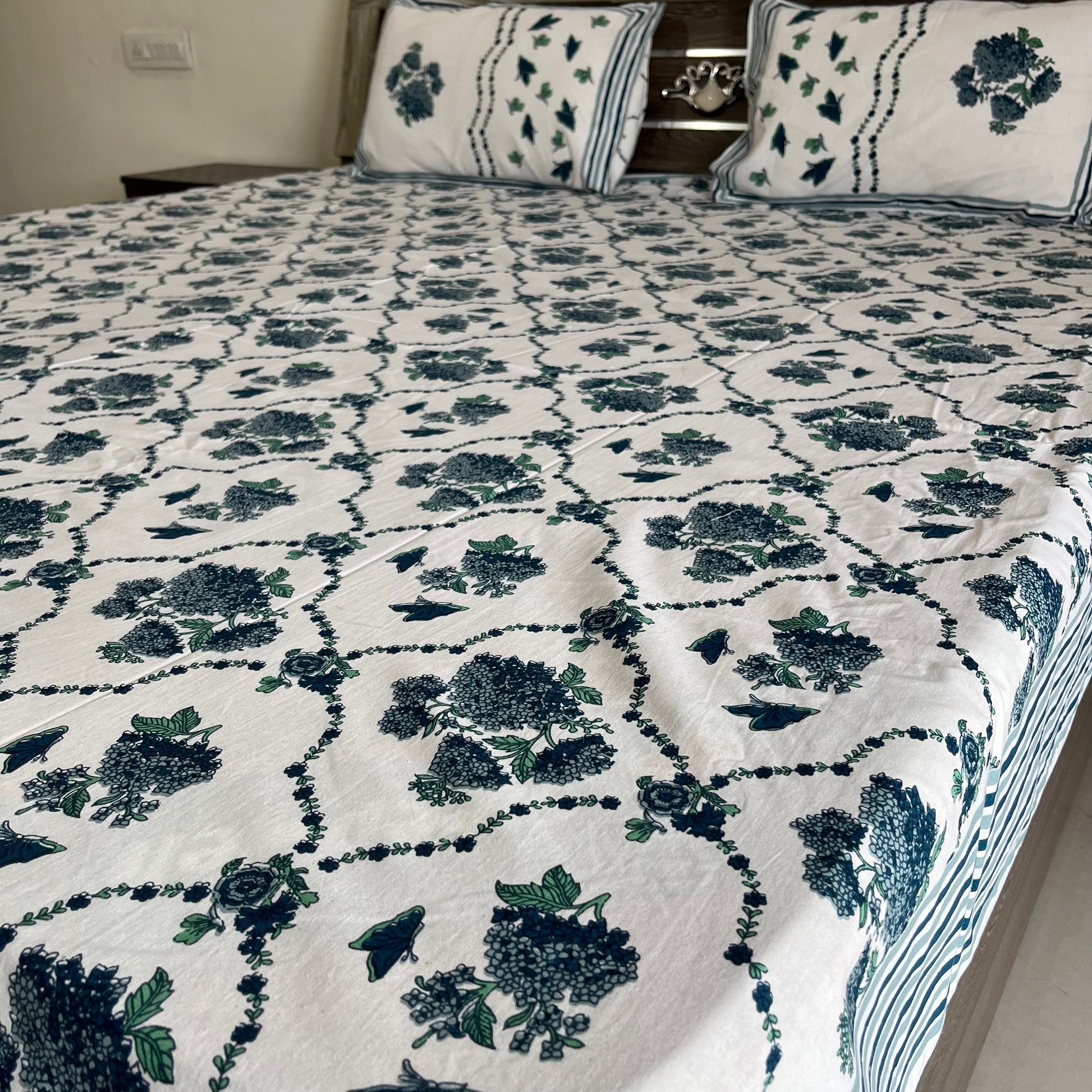 Transform your bedroom into a serene and elegant space with the Blue Butterfly Floral Handblock Printed Cotton Bedsheet. Made from 100% premium cotton, this eco-friendly bedsheet features a captivating butterfly and floral design, handcrafted using traditional Indian handblock printing techniques. Perfect for double beds, it combines ultimate comfort, durability, and timeless artistry. Ideal for daily use or special occasions, this handblock floral bedsheet adds a touch of sophistication and charm to your home decor. Shop now to bring authentic craftsmanship and beauty to your bedroom!