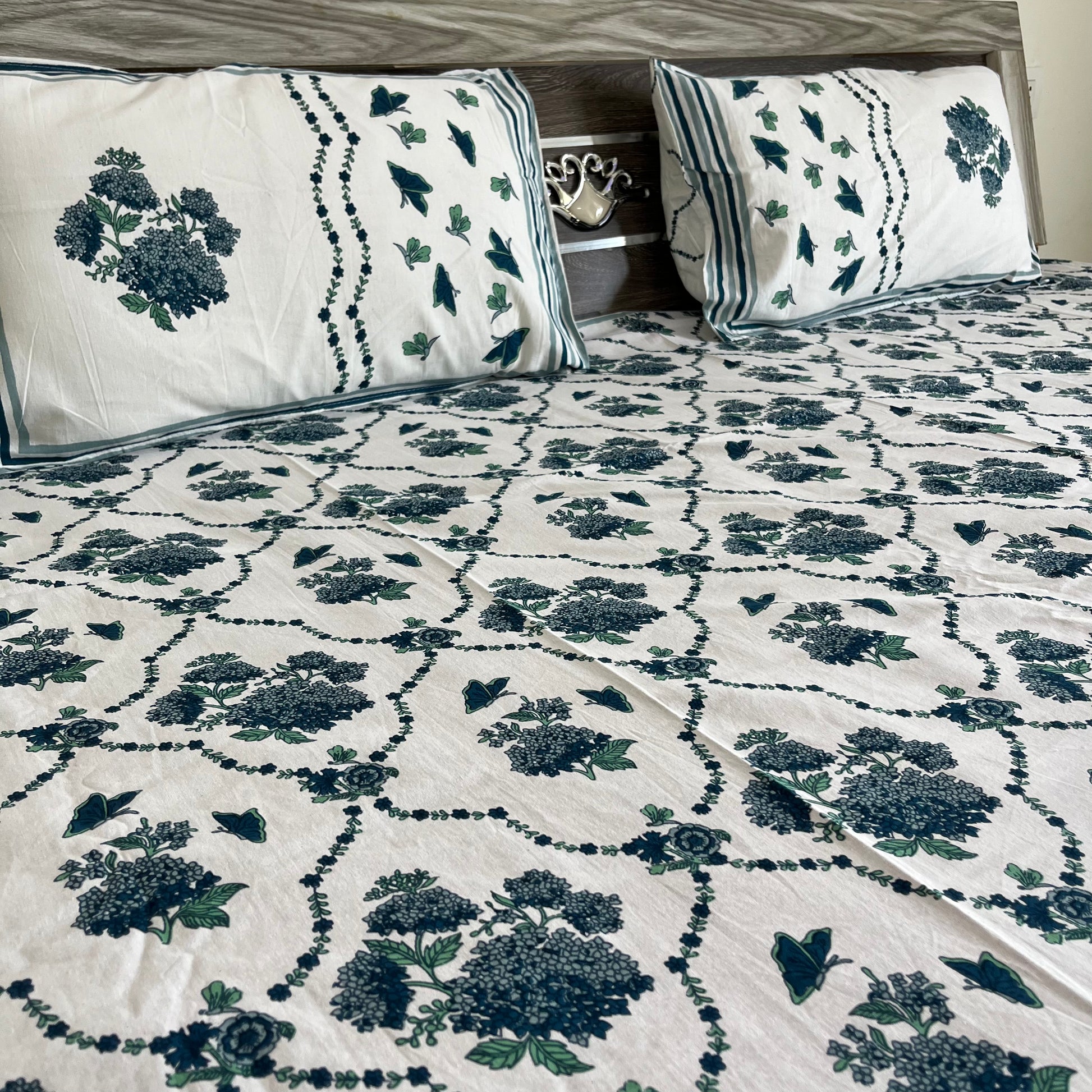 Blue Butterfly Floral Handblock Printed Cotton Bedsheet