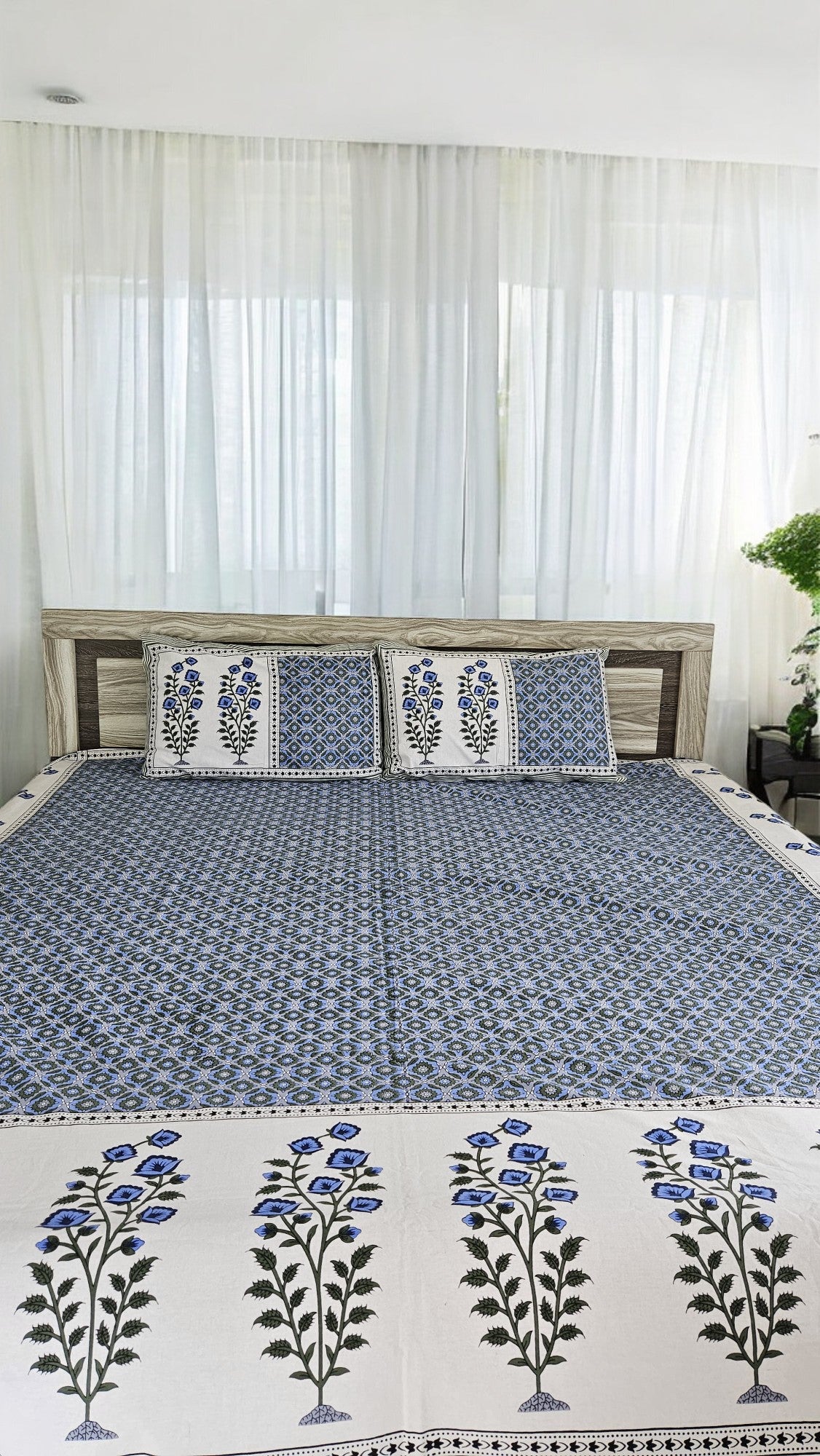 Crafted from 100% soft cotton, this elegant Blue Floral Double Bedsheet brings a refreshing and calming vibe to your bedroom décor. Featuring a beautiful floral pattern in shades of blue, this bedsheet set creates a serene and inviting atmosphere. Perfect for everyday use or special occasions, it combines comfort, durability, and style to enhance your room's aesthetic.