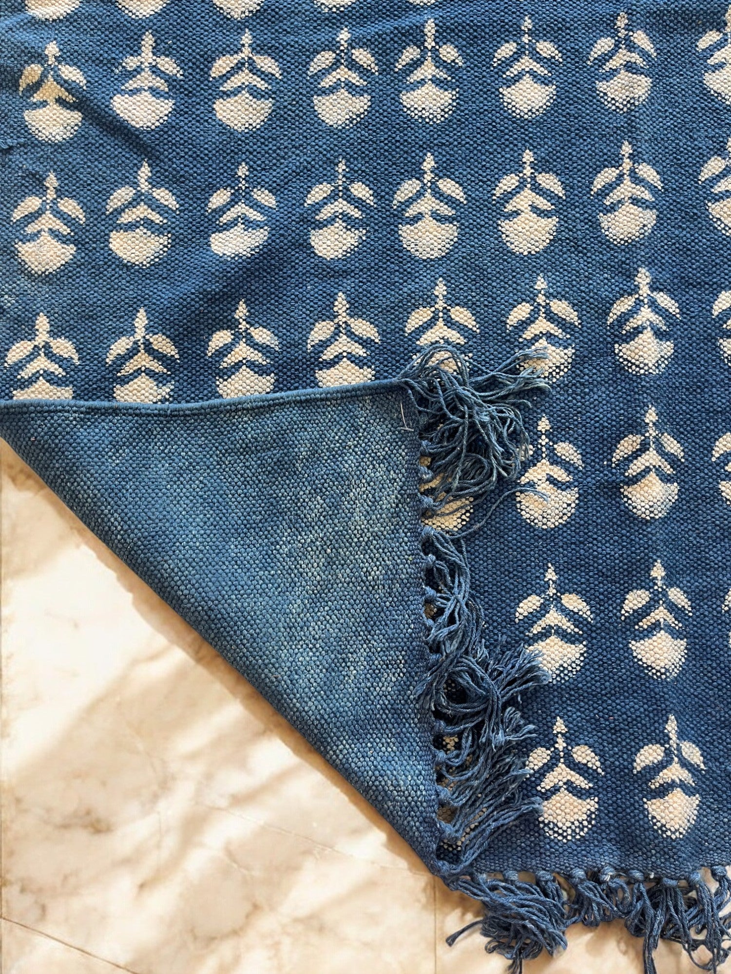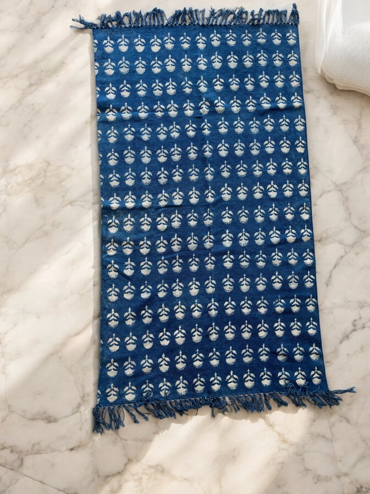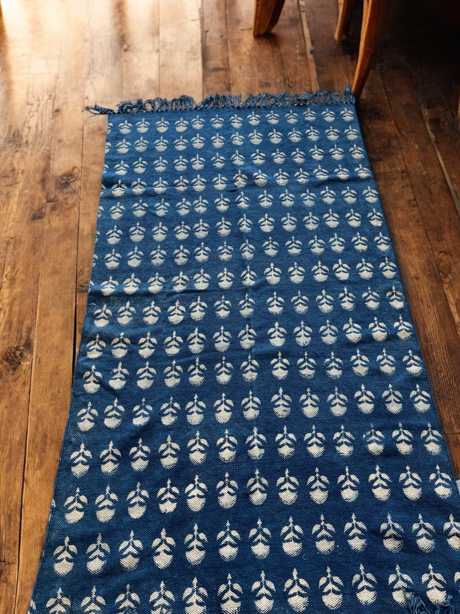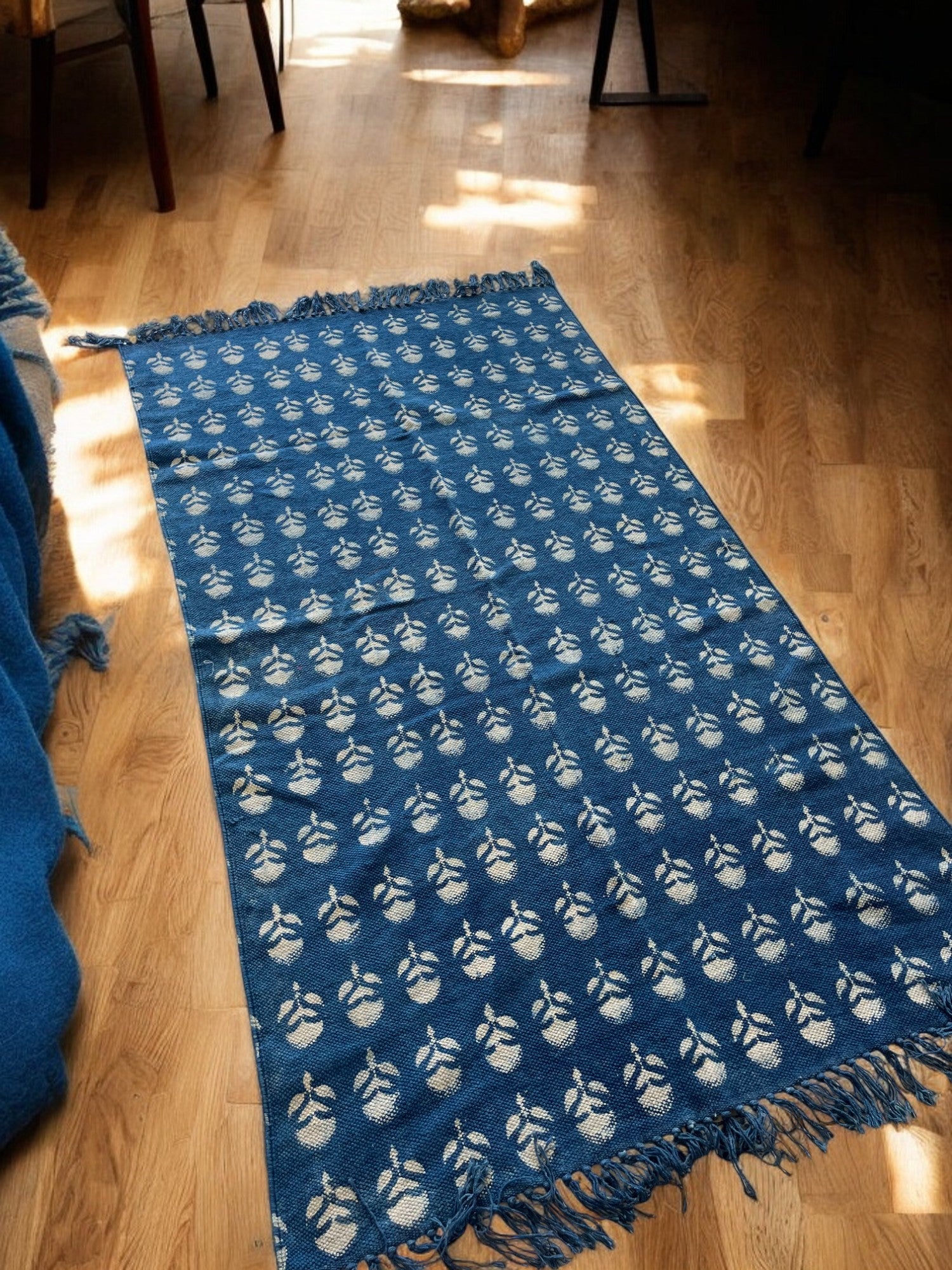 Enhance your home decor with this Blue Floral Handblock Print Cotton Rug, sized 3x5 ft. Made from 100% premium cotton, this rug features a stunning floral handblock print that blends traditional craftsmanship with modern elegance. Its soft texture and vibrant blue floral design make it perfect for living rooms, bedrooms, hallways, and entryways. Crafted using eco-friendly dyes, it offers a sustainable and stylish choice for your interiors. Durable, lightweight, and easy to maintain, this handcrafted cotton rug is a must-have addition to your home. Dry clean only for best care. Shop now to add timeless charm to your space!