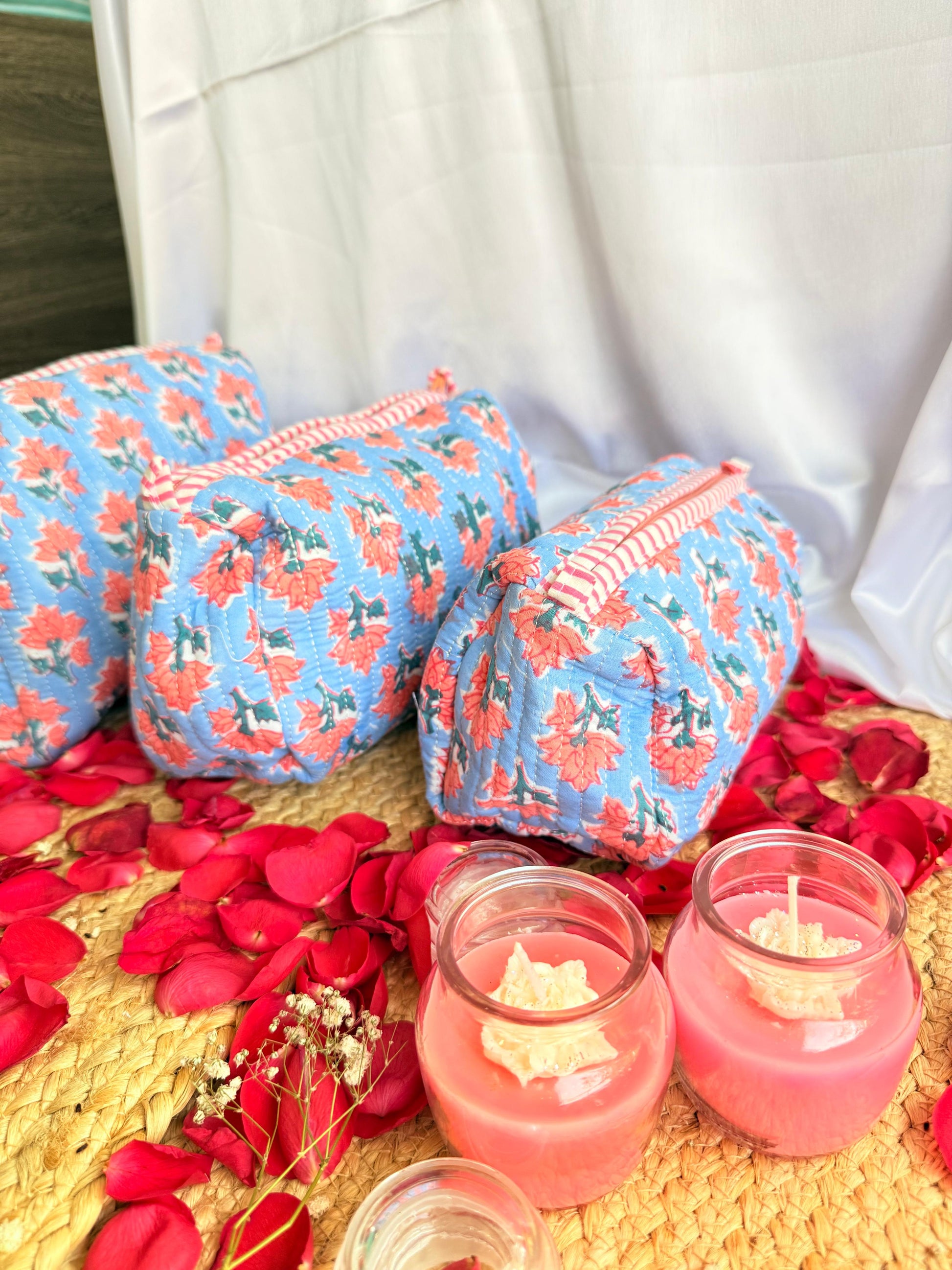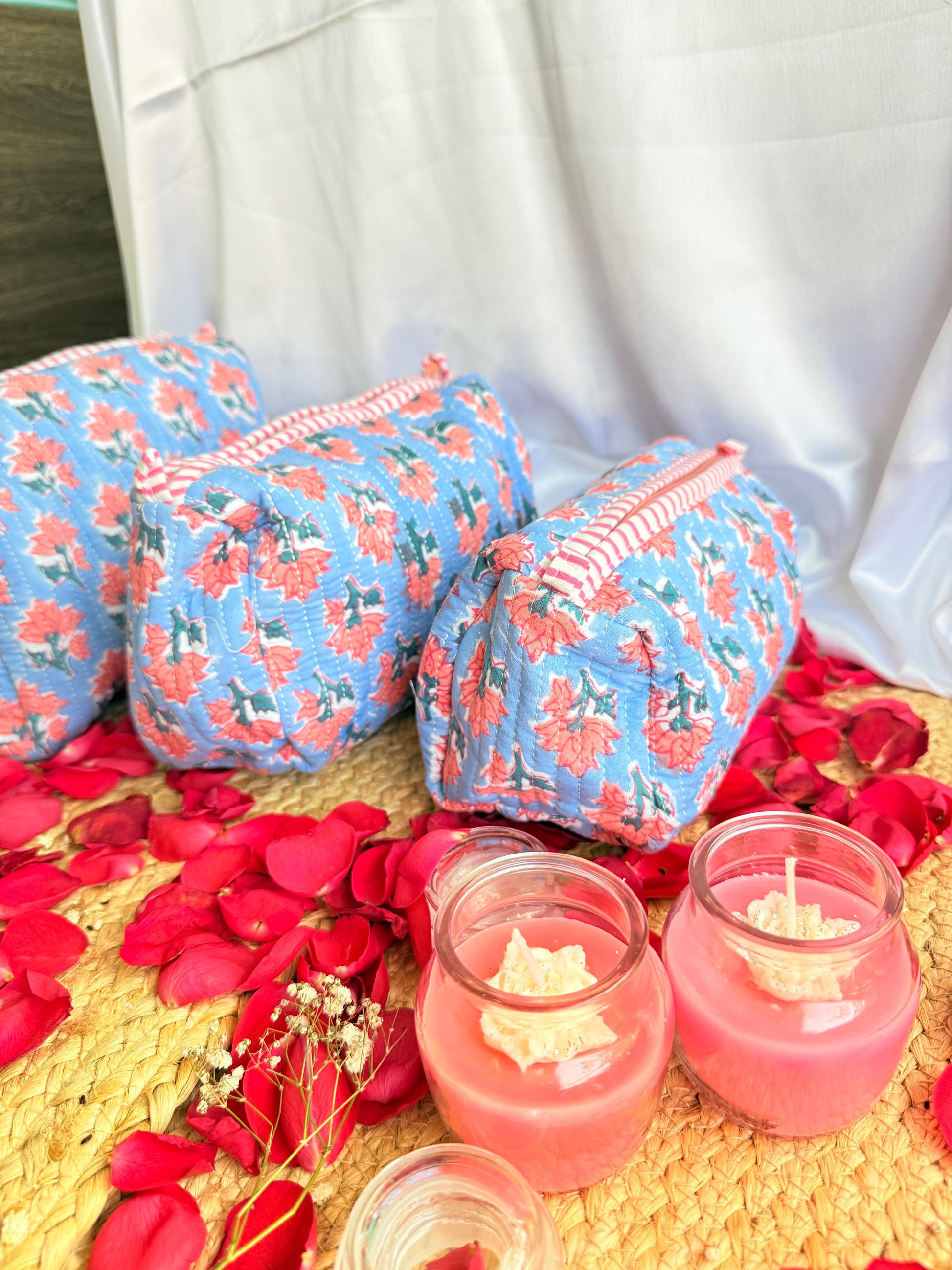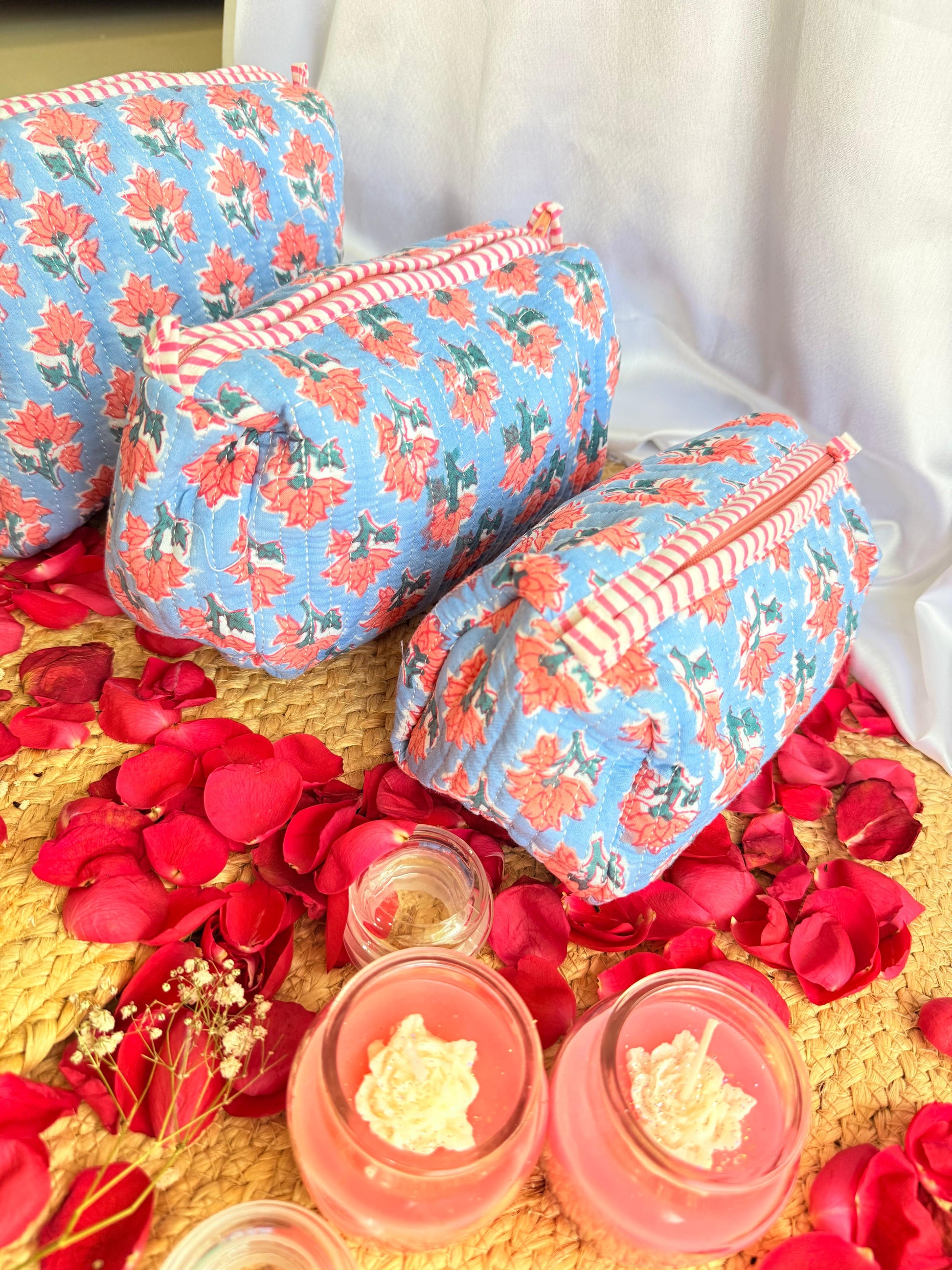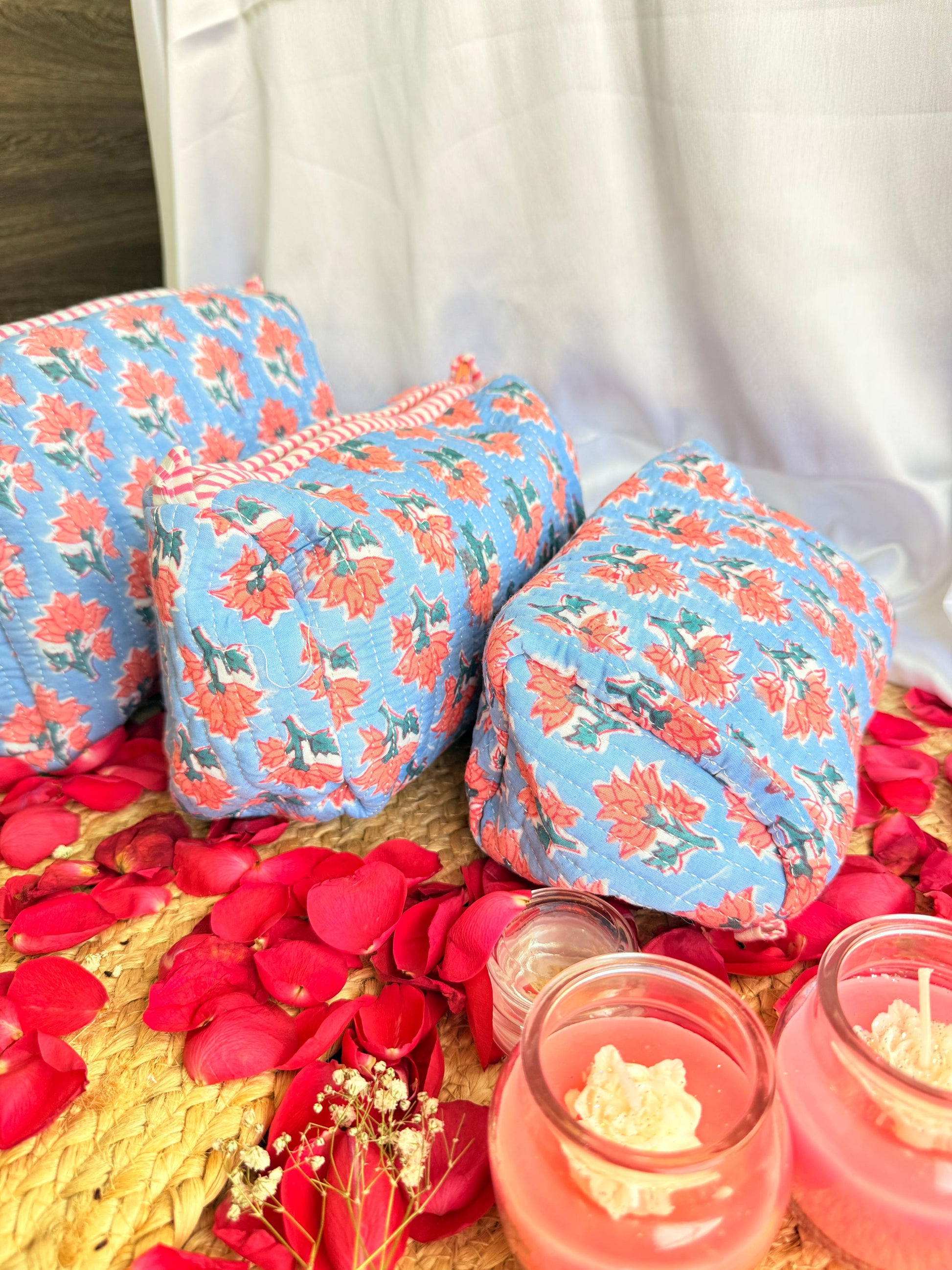 This gorgeous set of 3 handblock pouches features a stunning blue floral design on a crisp white background. Perfect for keeping your essentials organized and easily accessible, these pouches are also a stylish addition to any outfit. Handmade with care, these pouches are both practical and beautiful!