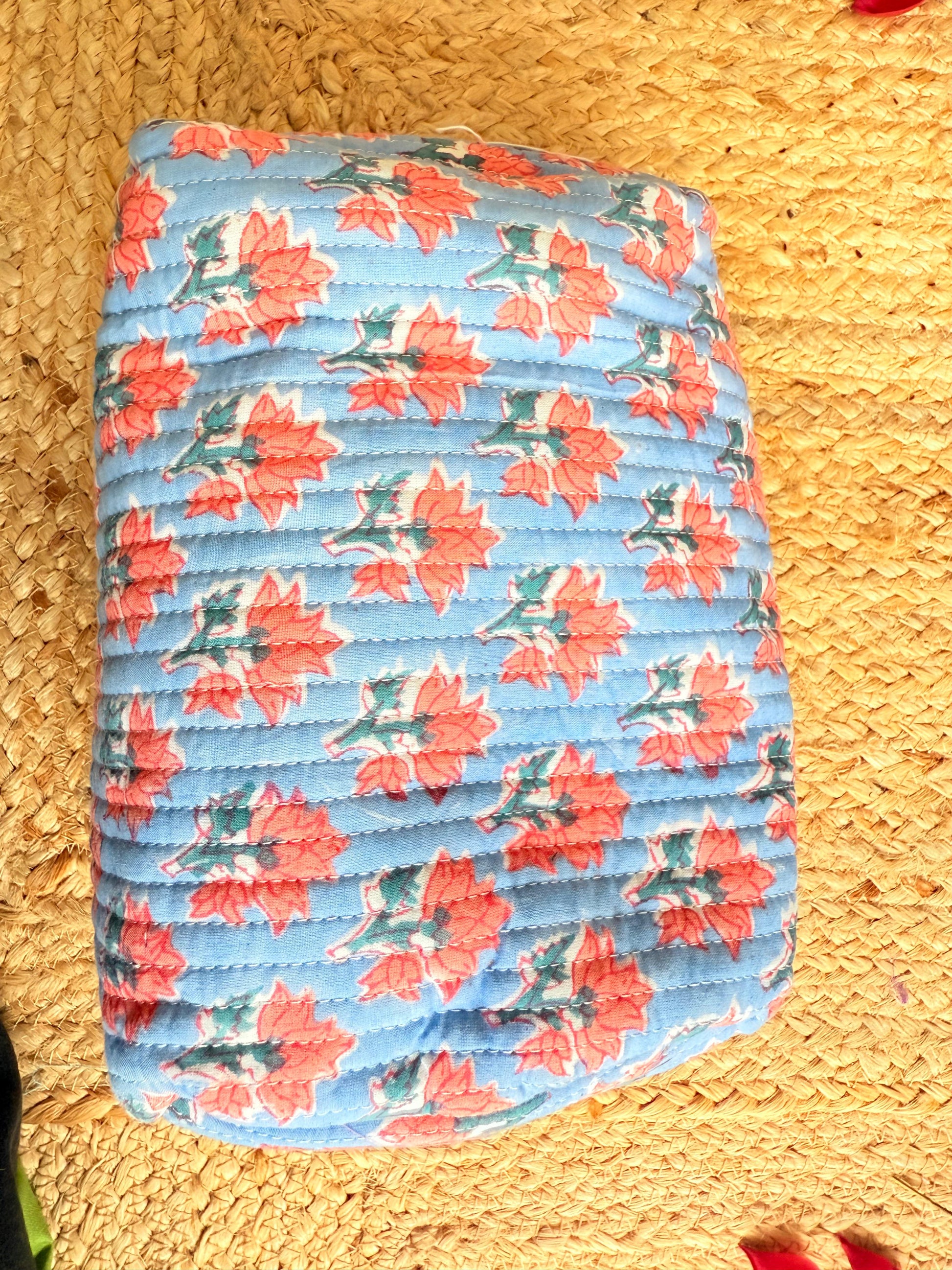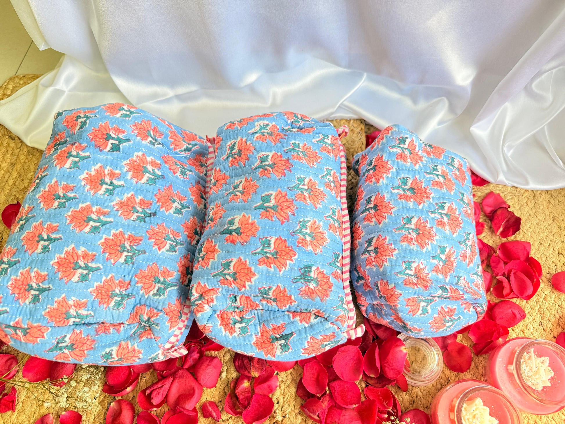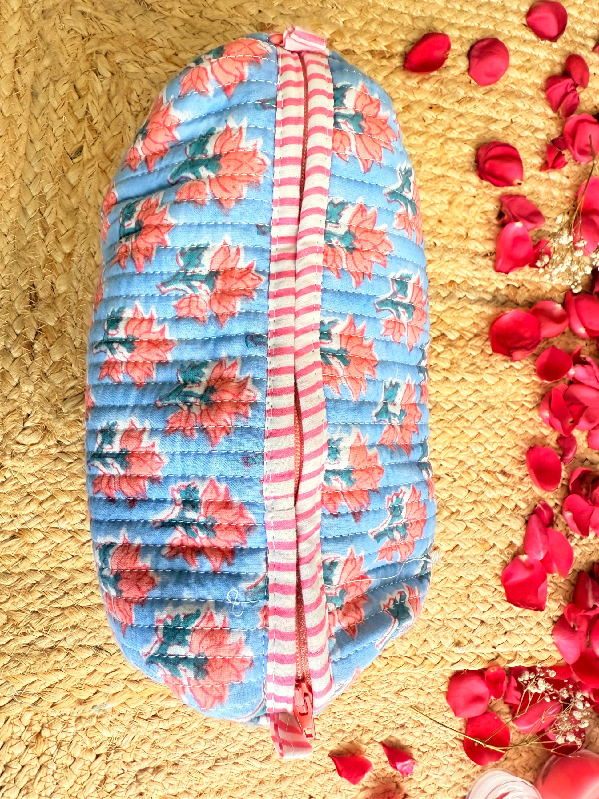 Premium Blue Red Floral Handblock Travel Pouch Organizer Set of 3