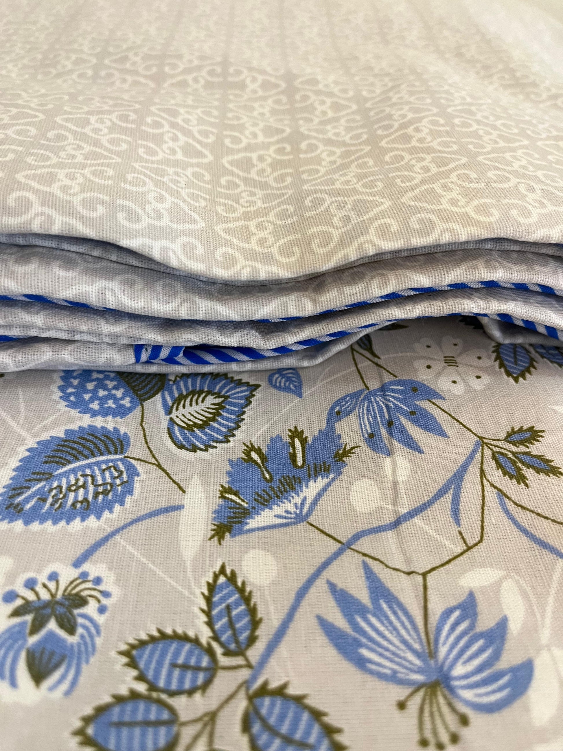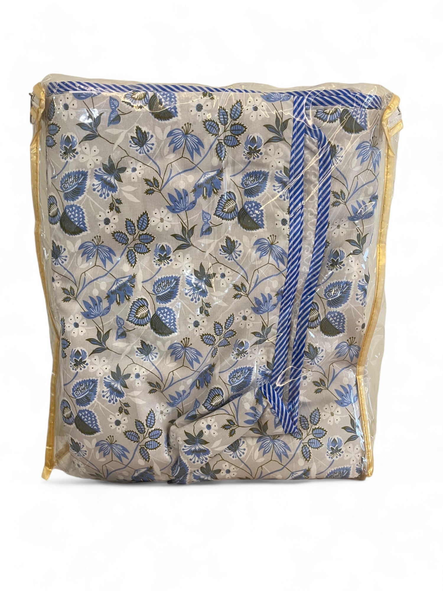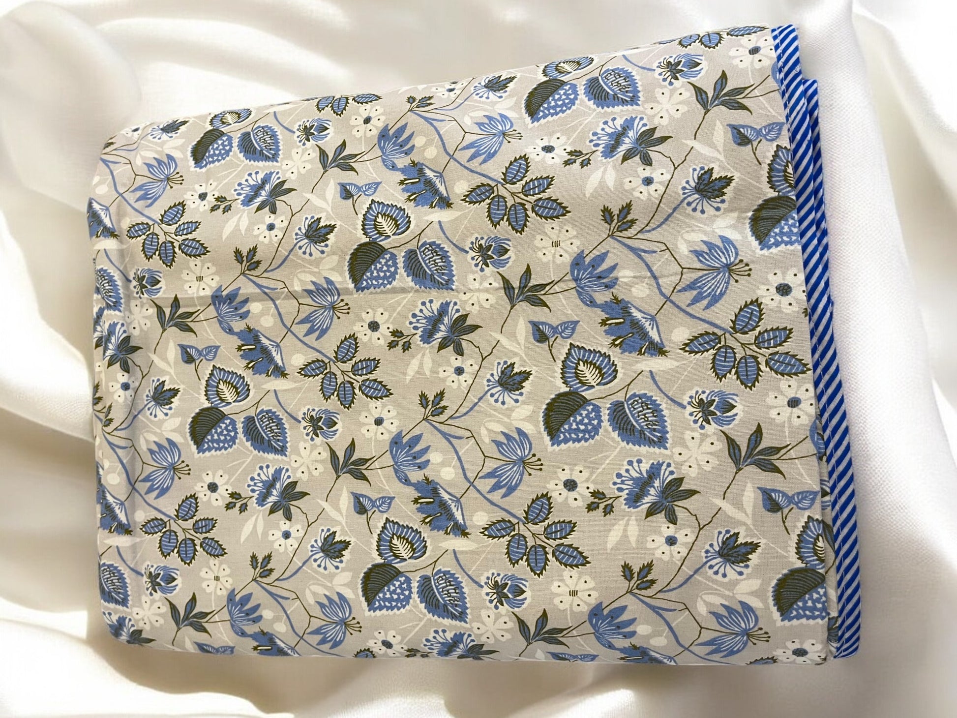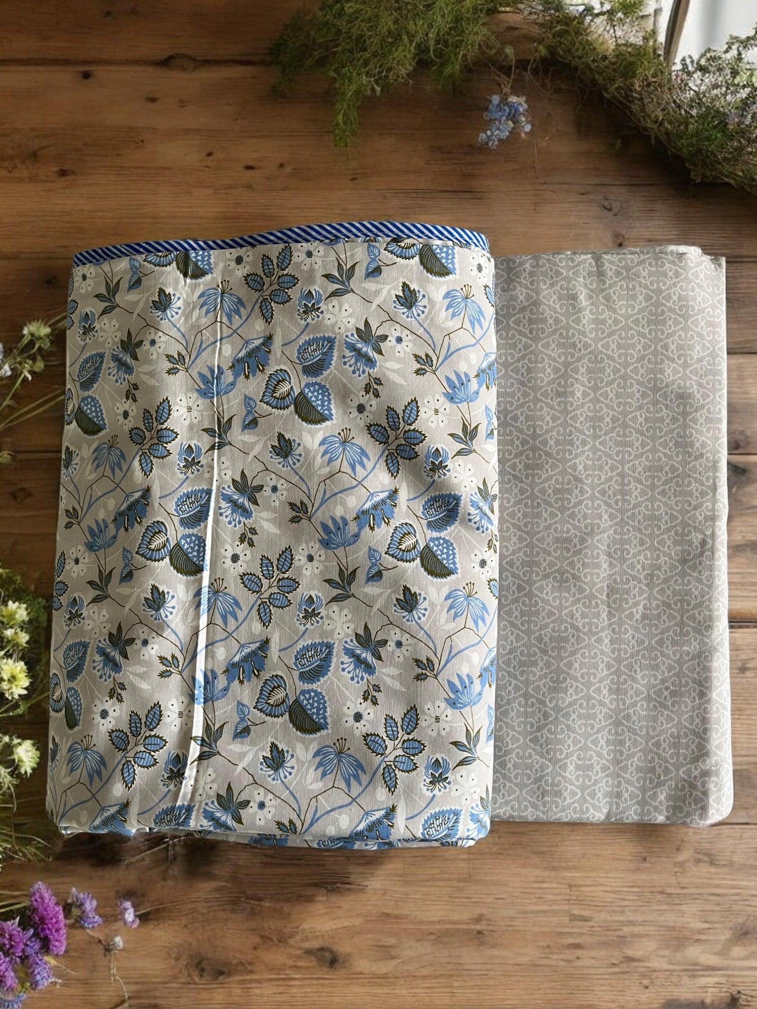 Enhance your bedroom with the Cotton Blue Gray Floral Single Dohar Set, designed for comfort and elegance. This set of 2 dohars, each measuring 60x90 inches, is crafted from 100% premium cotton for exceptional softness and breathability. Featuring a delicate blue and gray floral print, these dohars add a refreshing touch to any decor. Perfect for all-season use, they provide warmth during winters and keep you cool in summers. Made with eco-friendly dyes, these skin-safe and lightweight dohars are easy to care for—an ideal choice for everyday luxury.