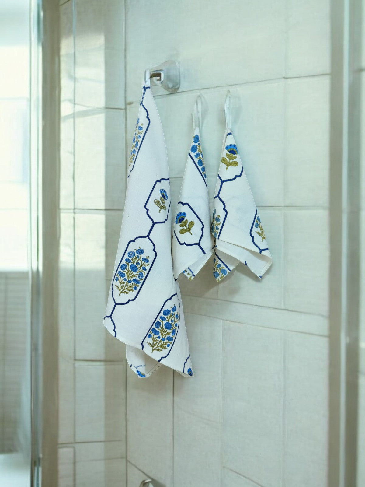 Blue Floral White Handblock Towels Set – 3-Piece Bath and Hand Towels