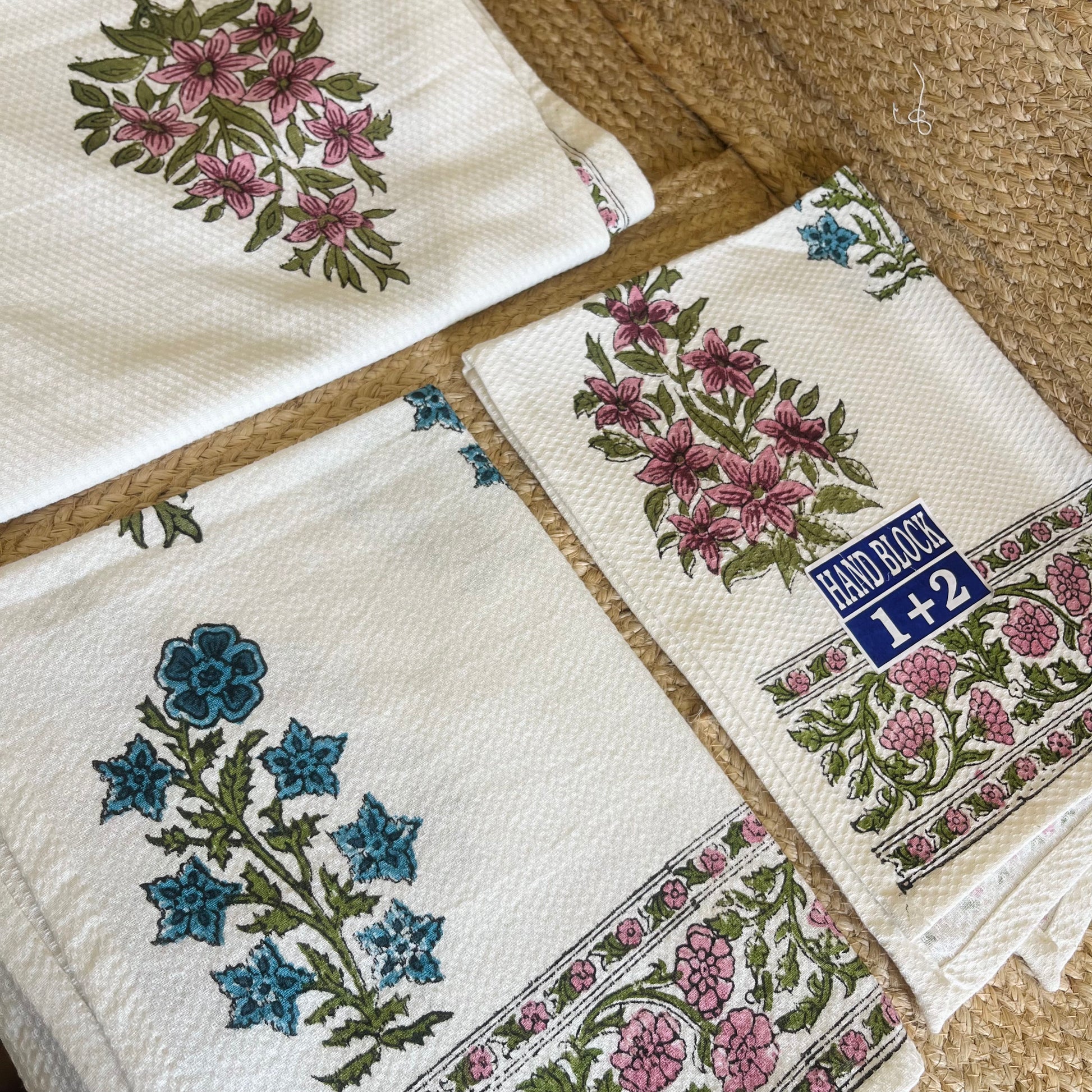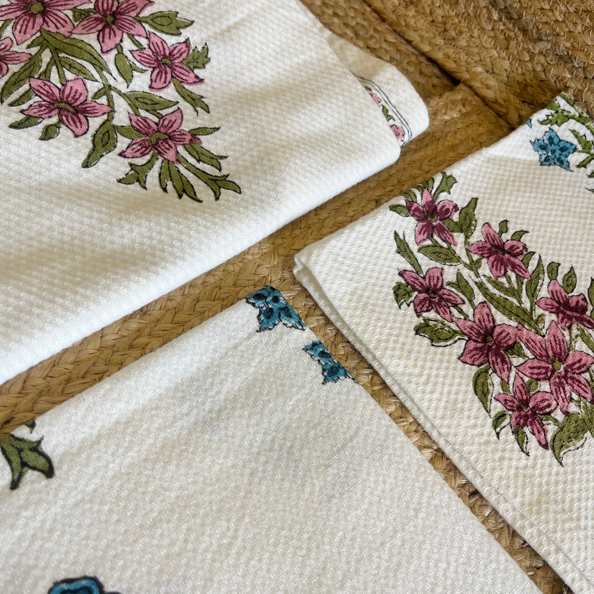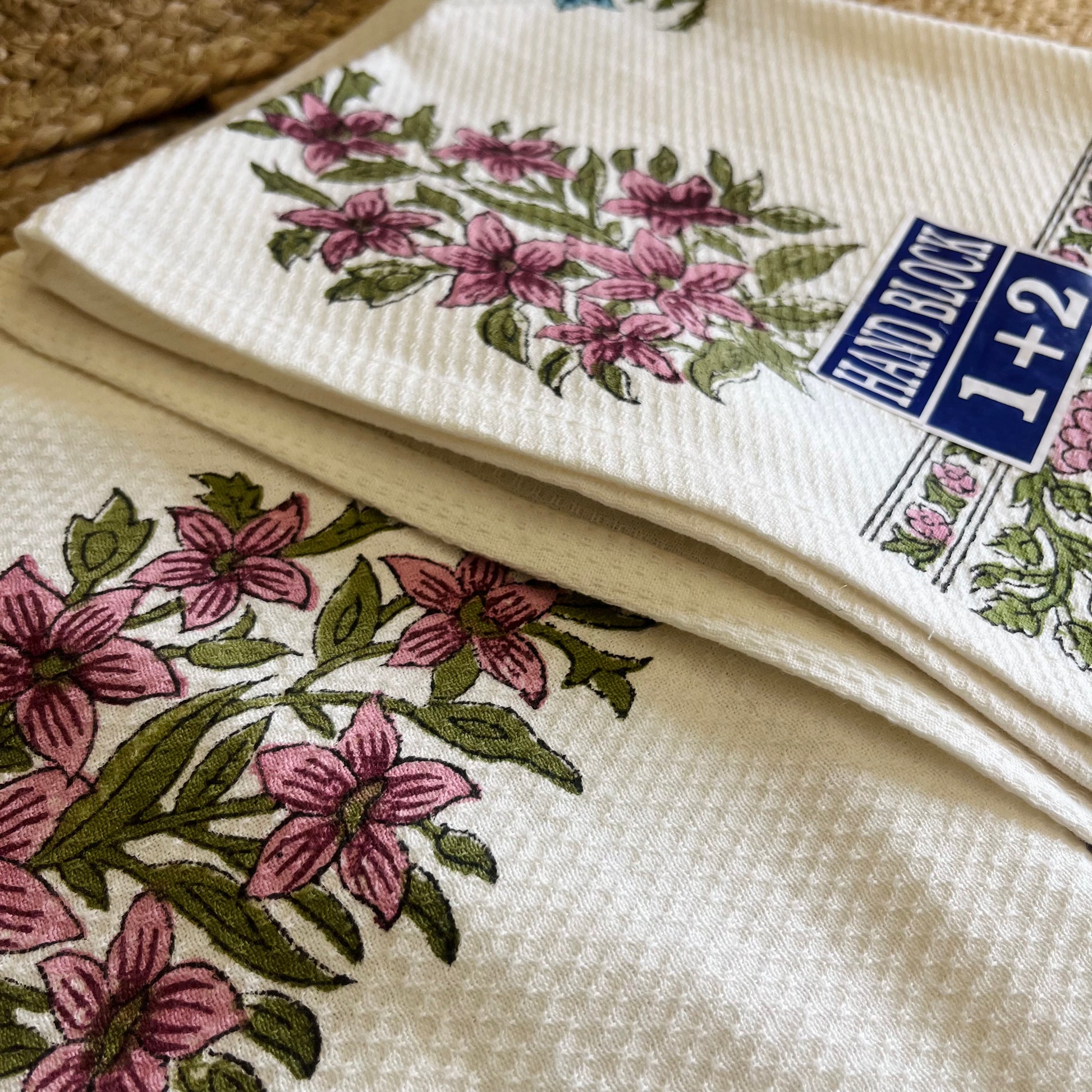 Blue Pink Floral Handblock Waffle Cotton Towel Set